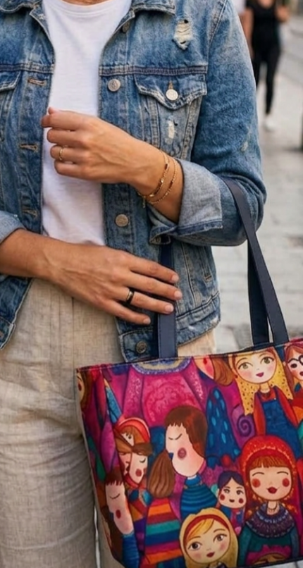 Bolso de mano a topitos blancos sobre fondo azul marino.
