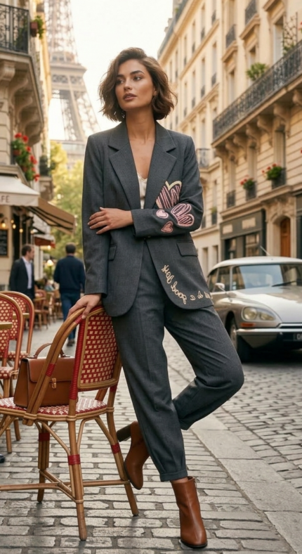 Conjunto de pantalón y americana bordada en color gris.