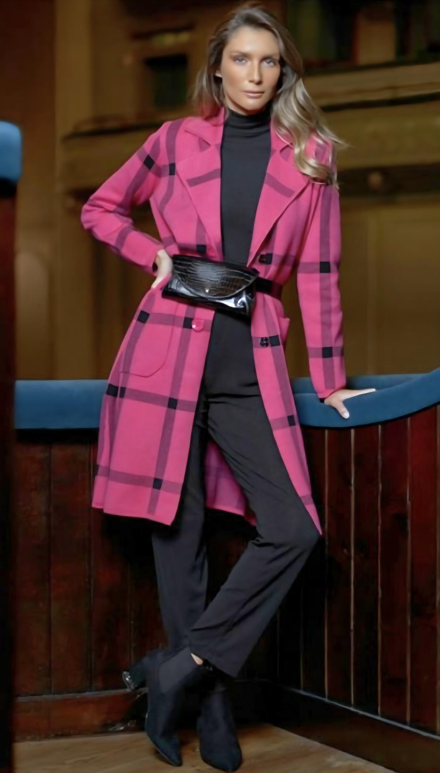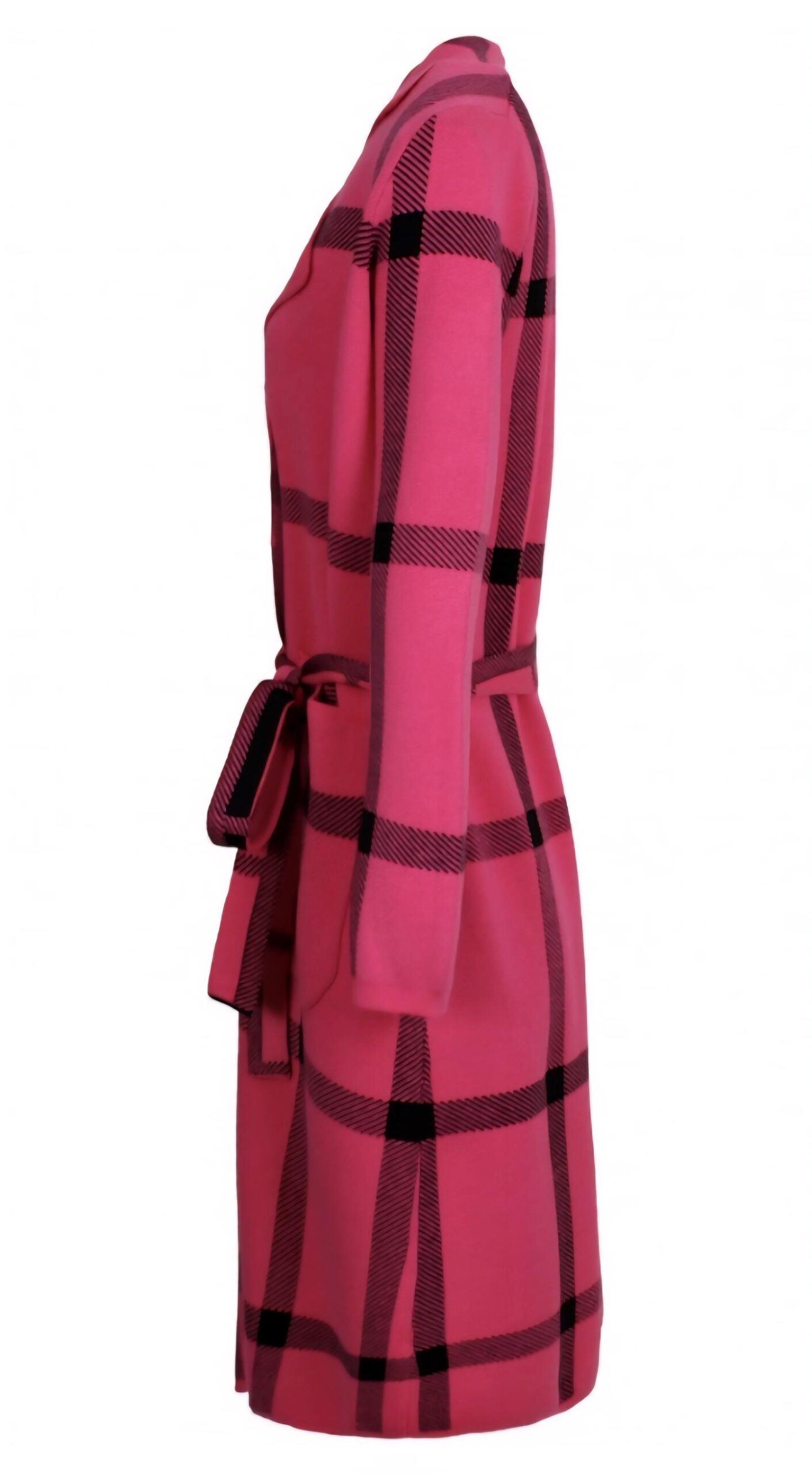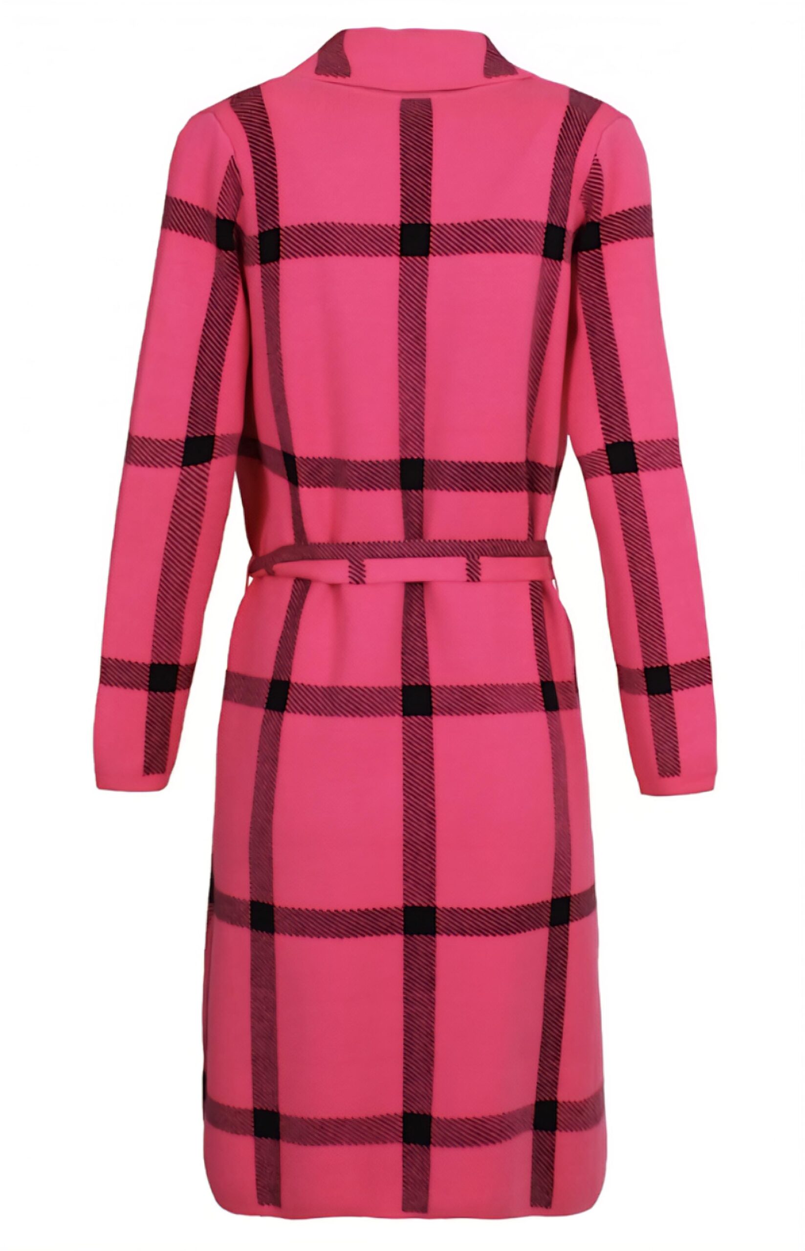 Abrigo de punto largo con estampación de cuadro negro sobre fondo de color.
