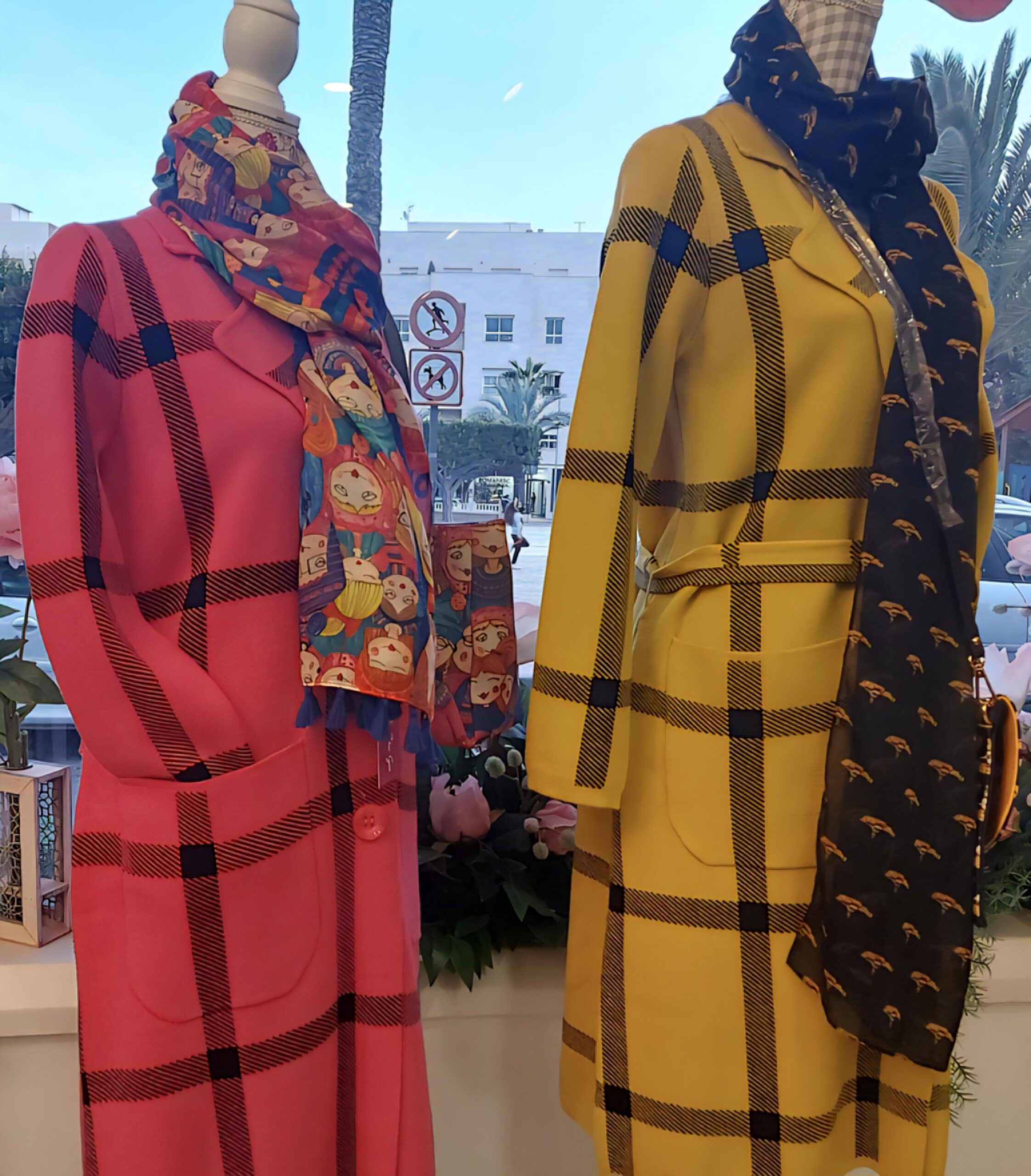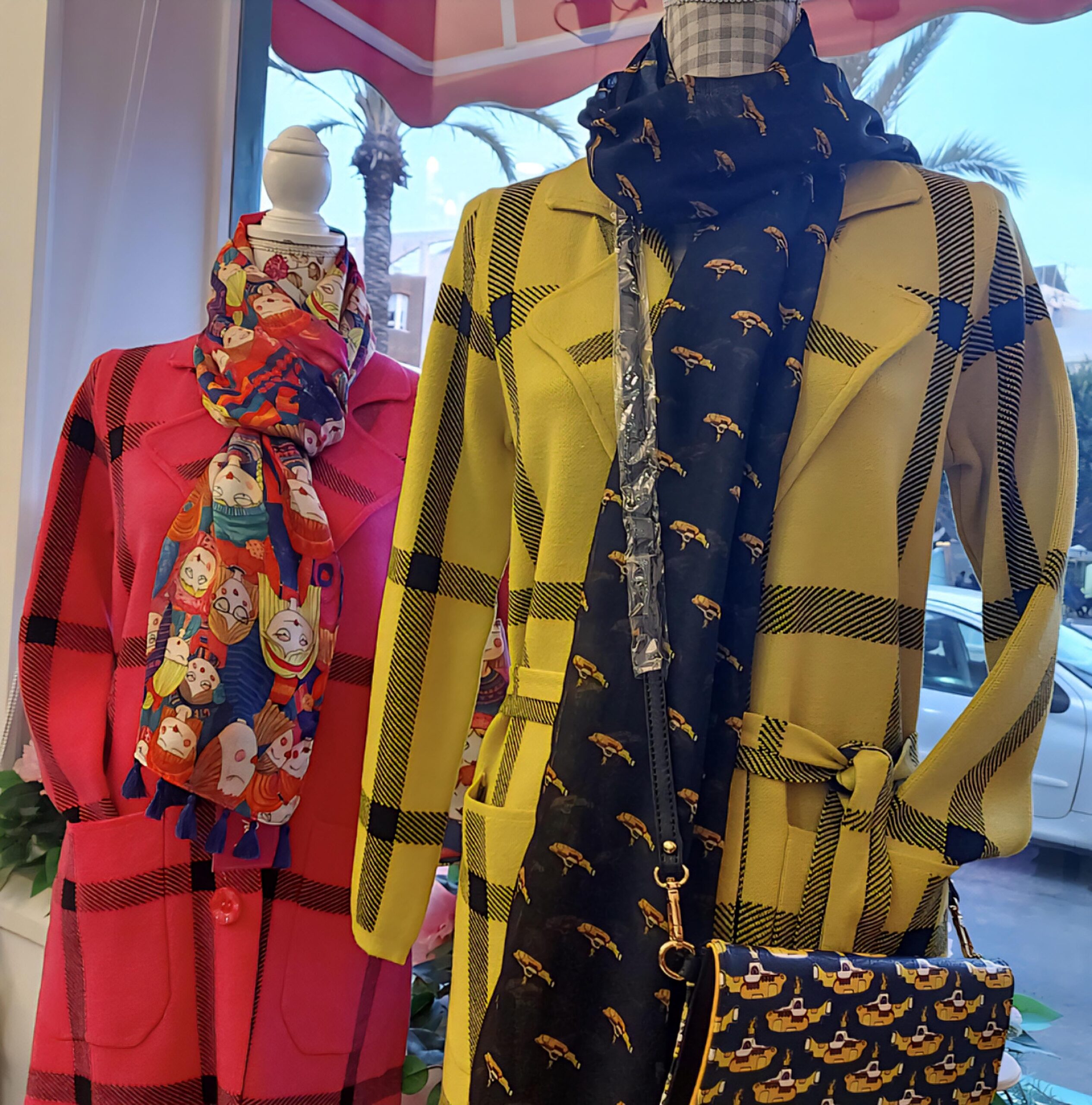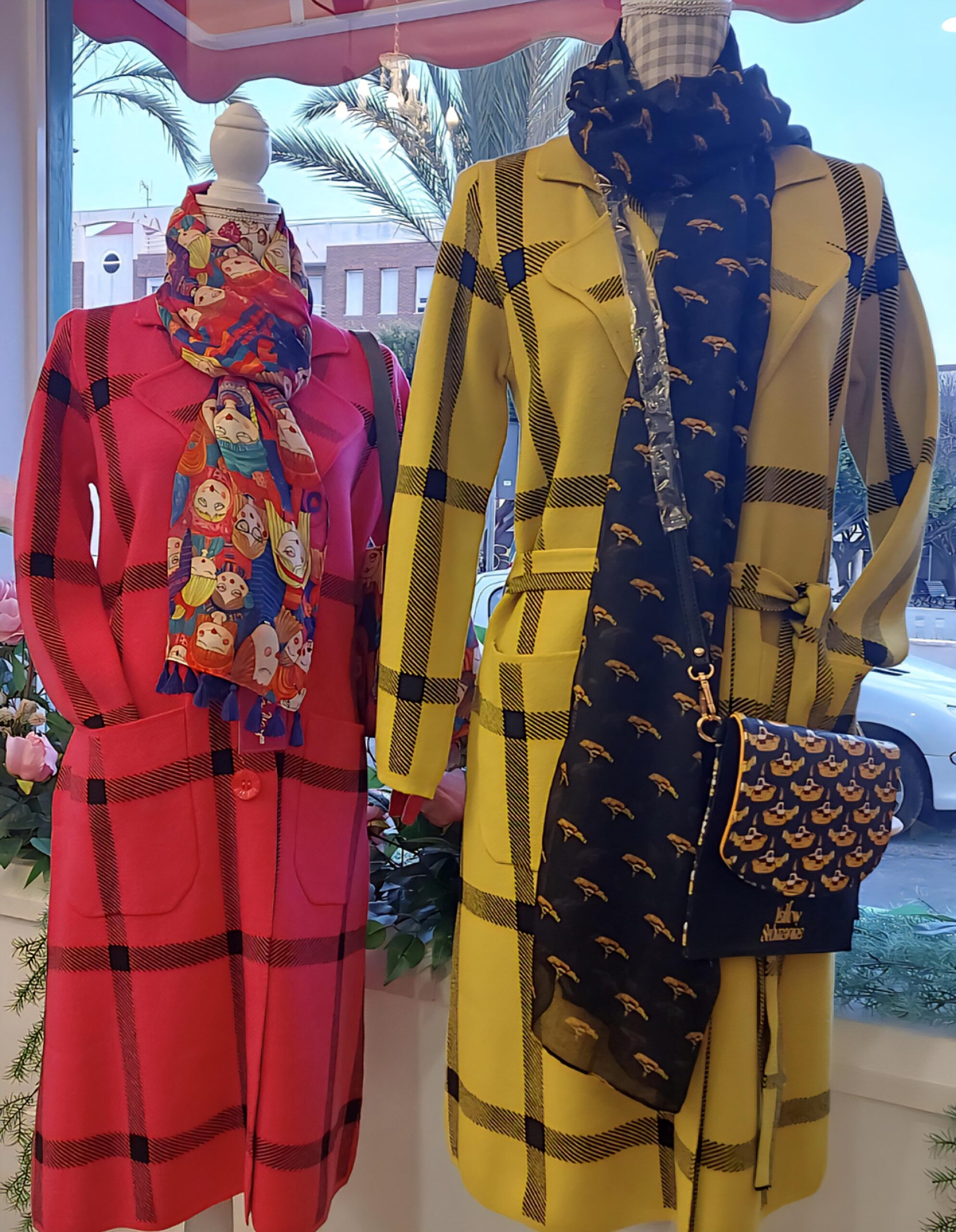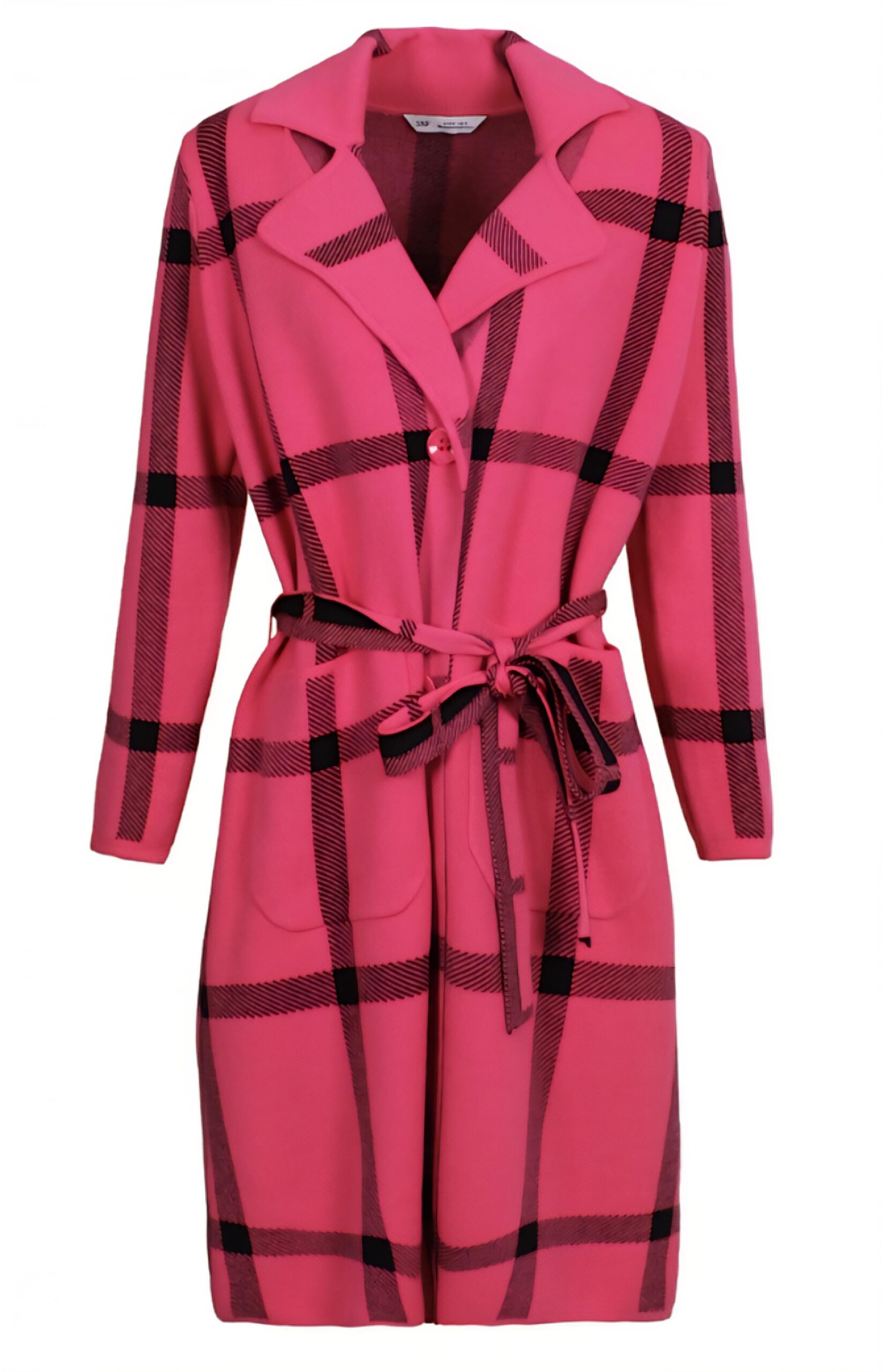 Abrigo de punto largo con estampación de cuadro negro sobre fondo de color.