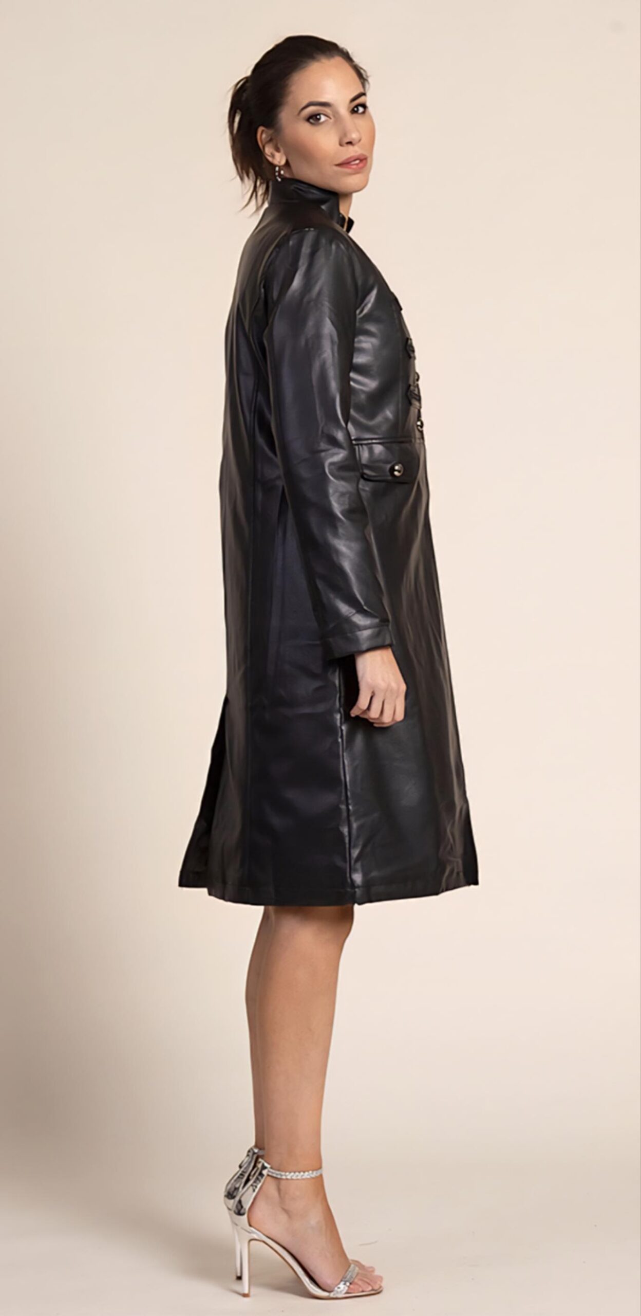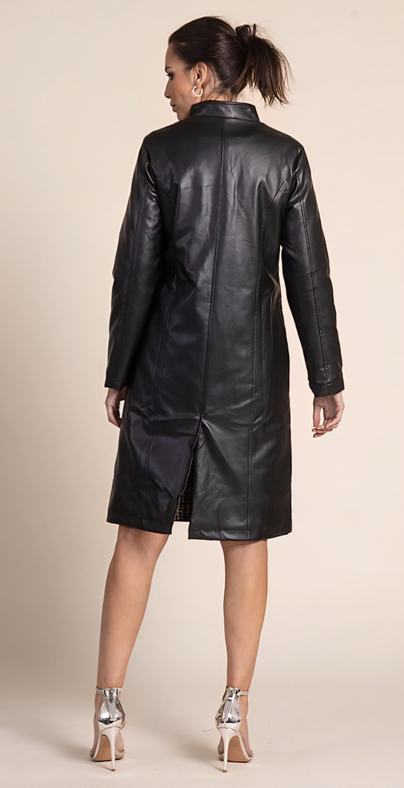 Abrigo largo midi en polipiel negro.