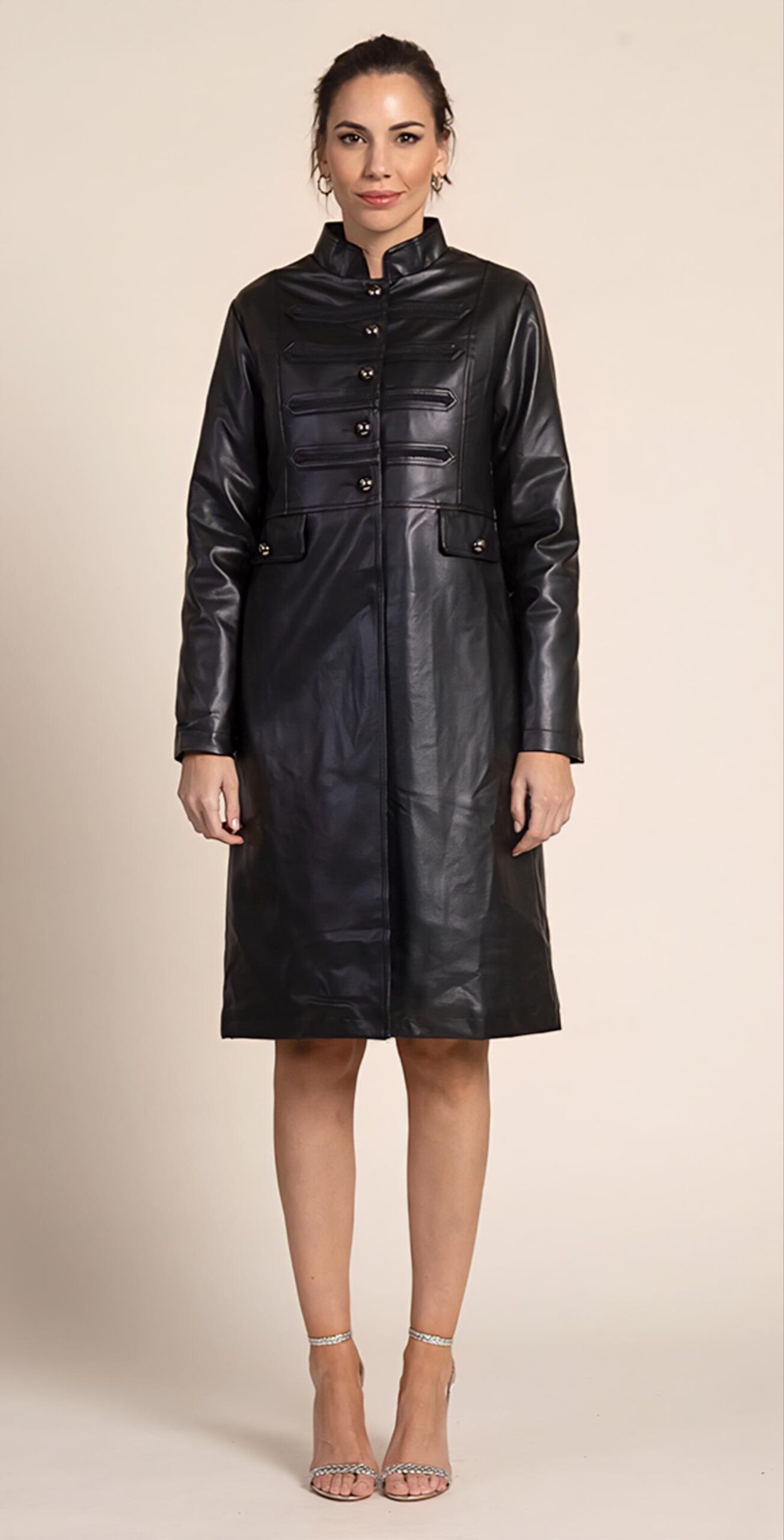 Abrigo militar en polipiel color negro.