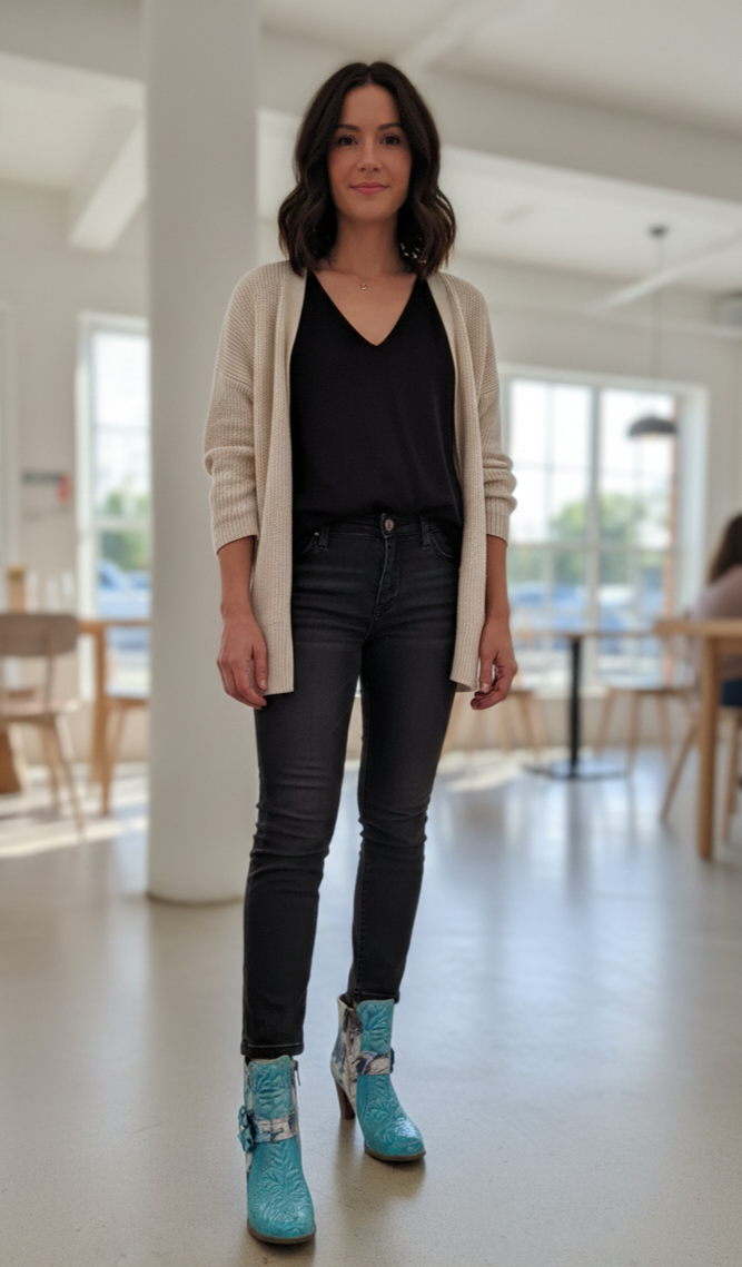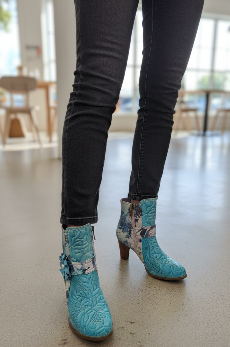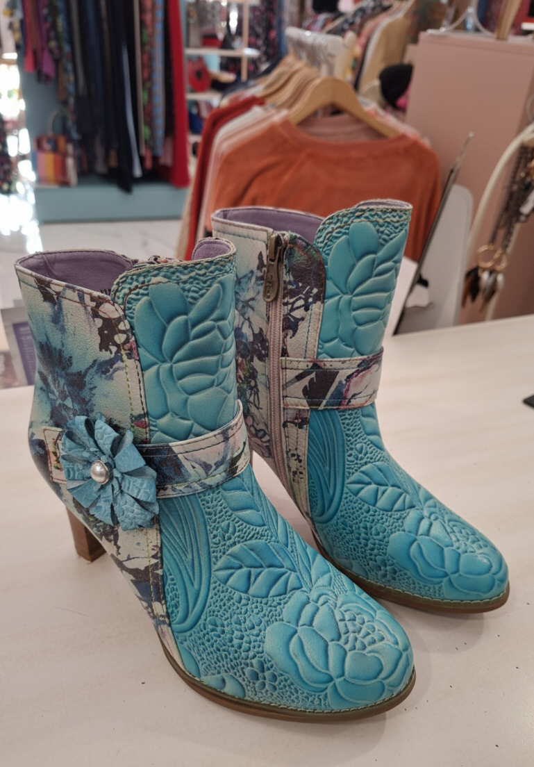 Combinación de piel estampación floral y piel brocada color turquesa.