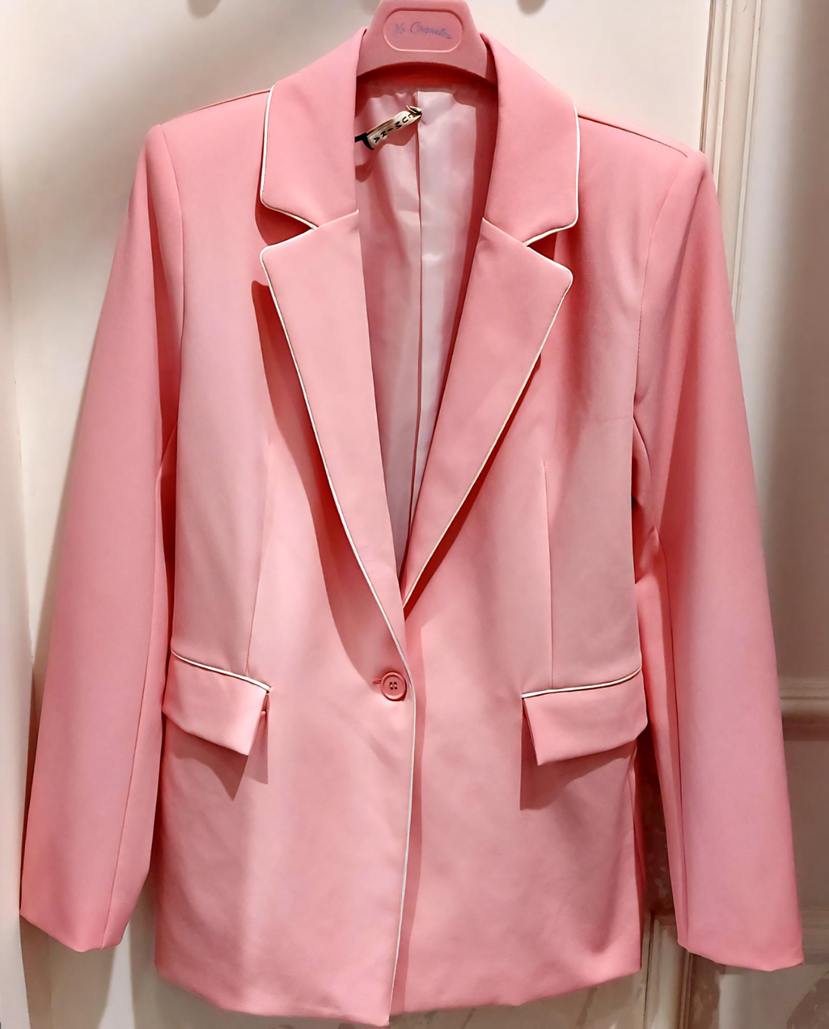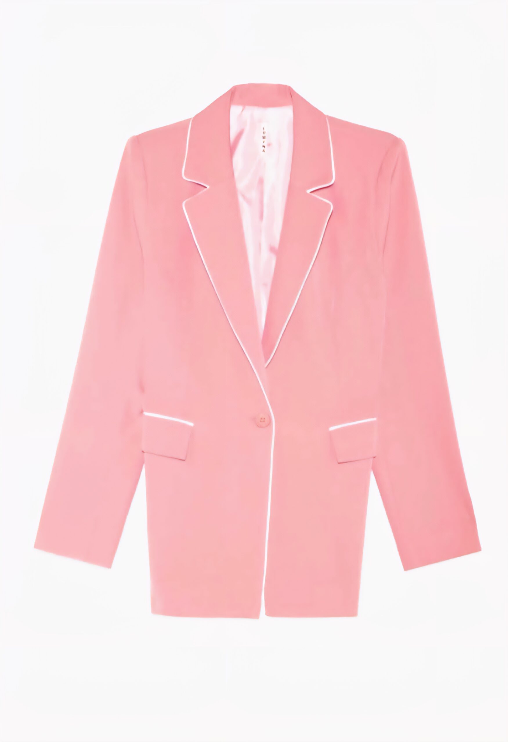 Americana rosa con ribete blanco en solapas y bolsillos.