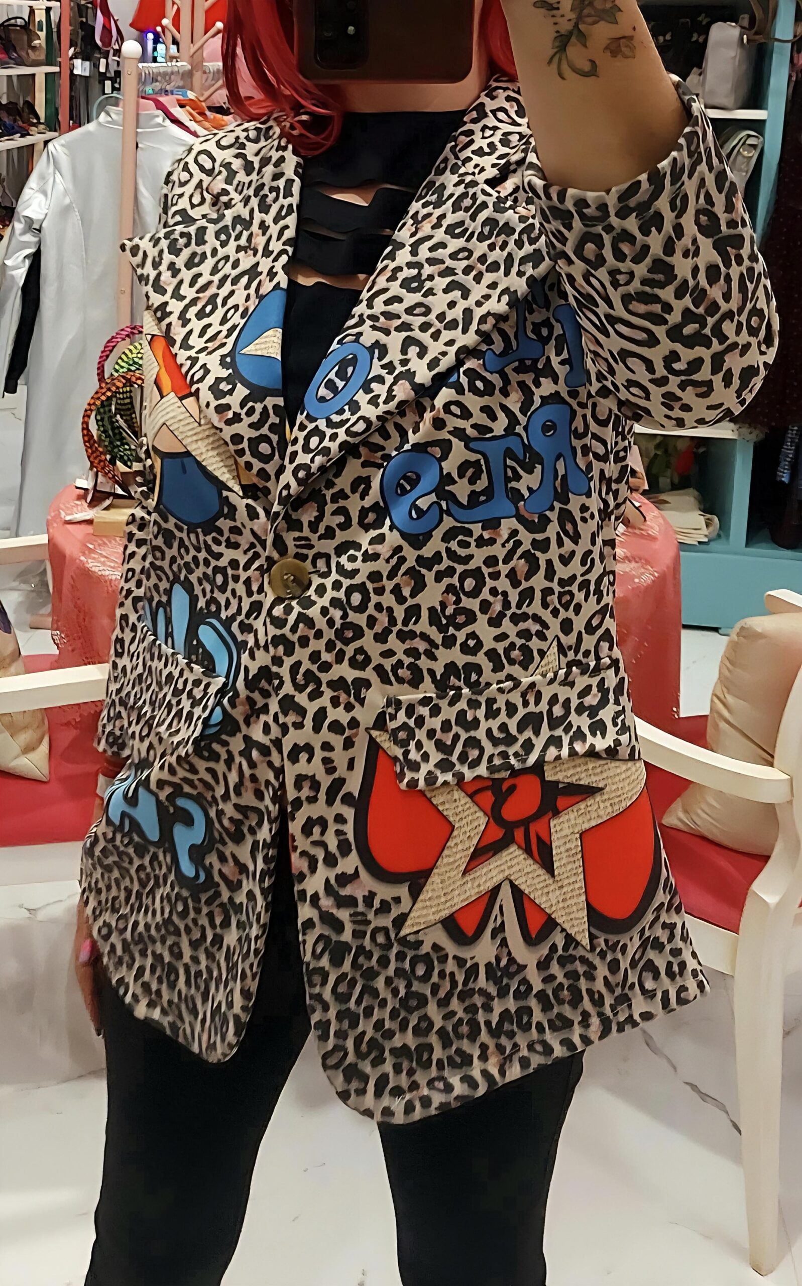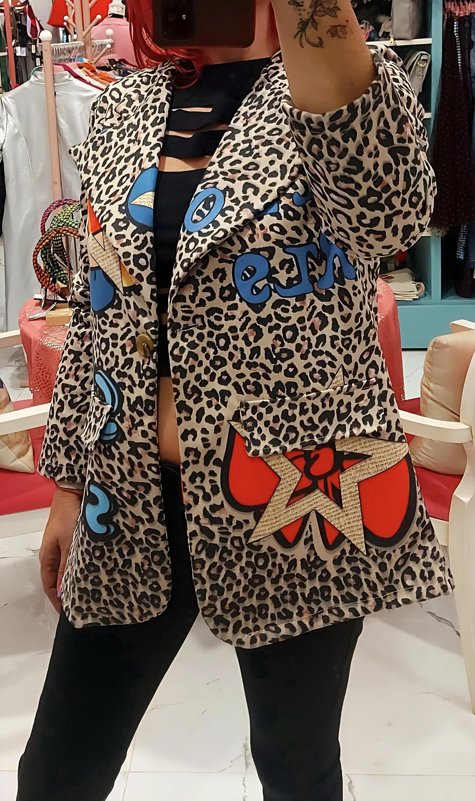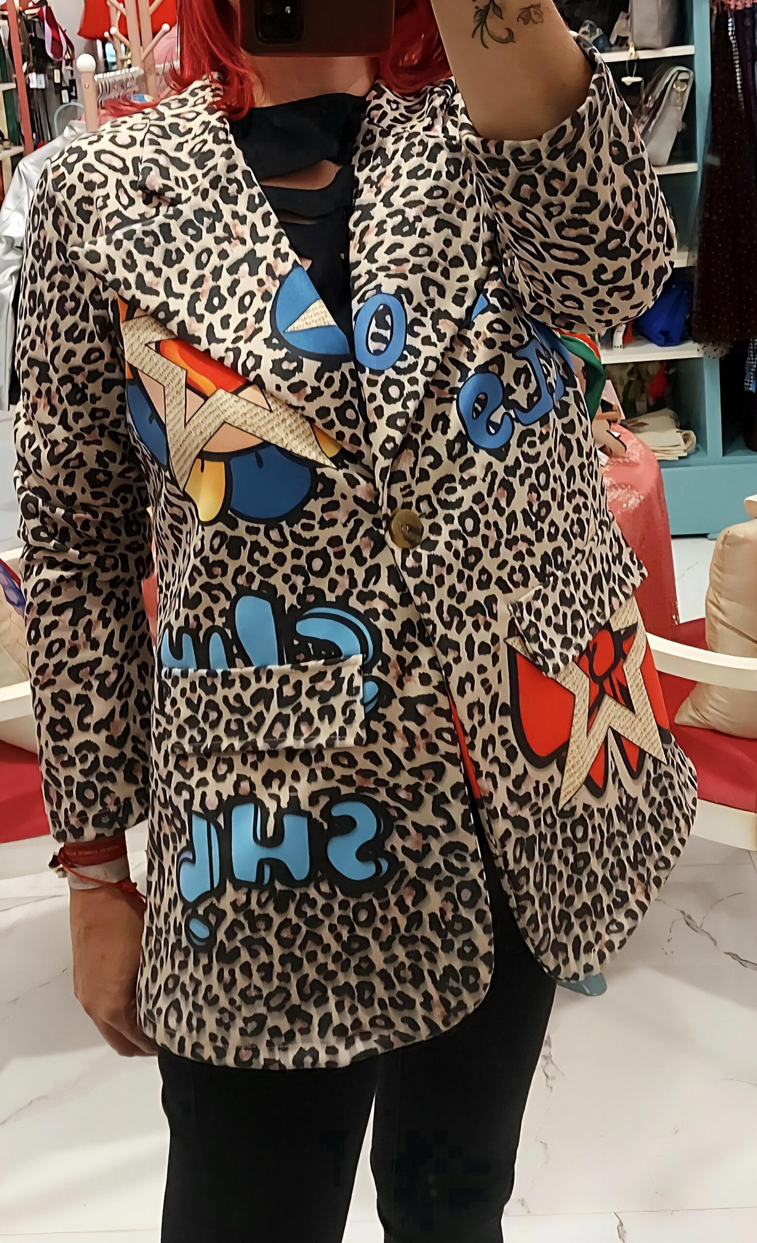 Estampación stikers multicolor y corazón maxi en espalda sobre fondo animal print camel.