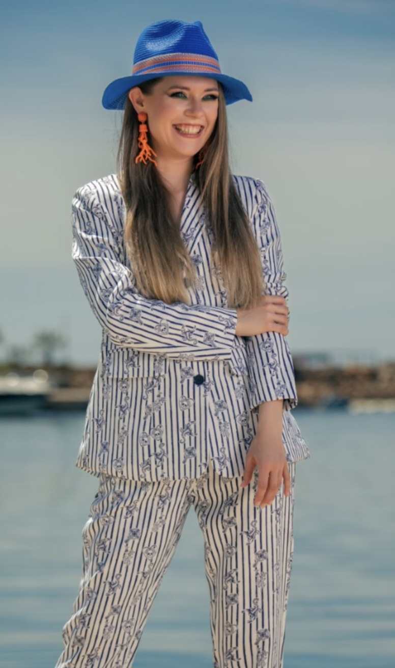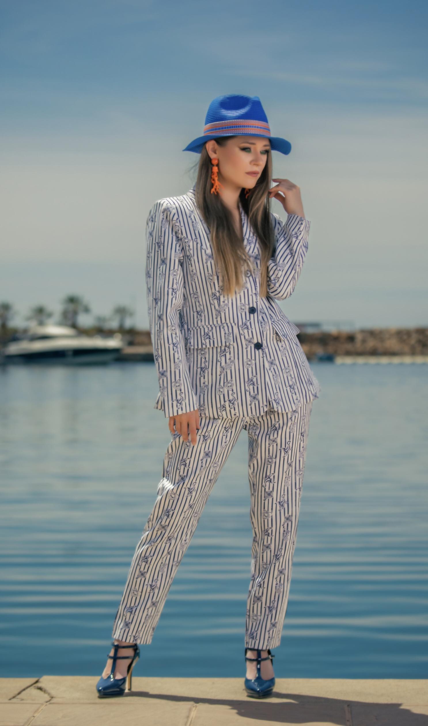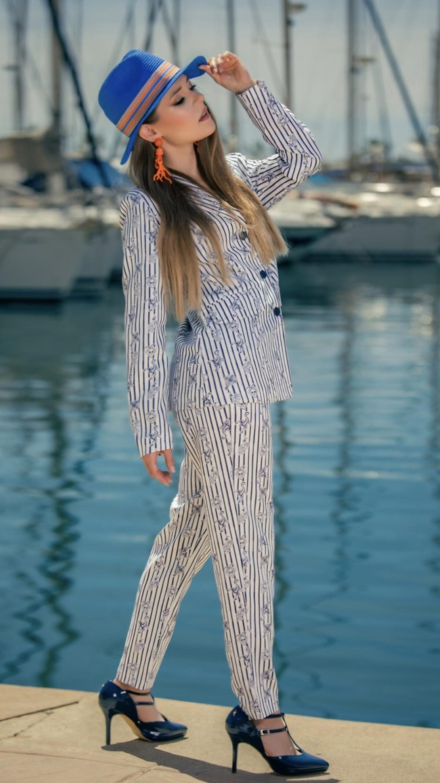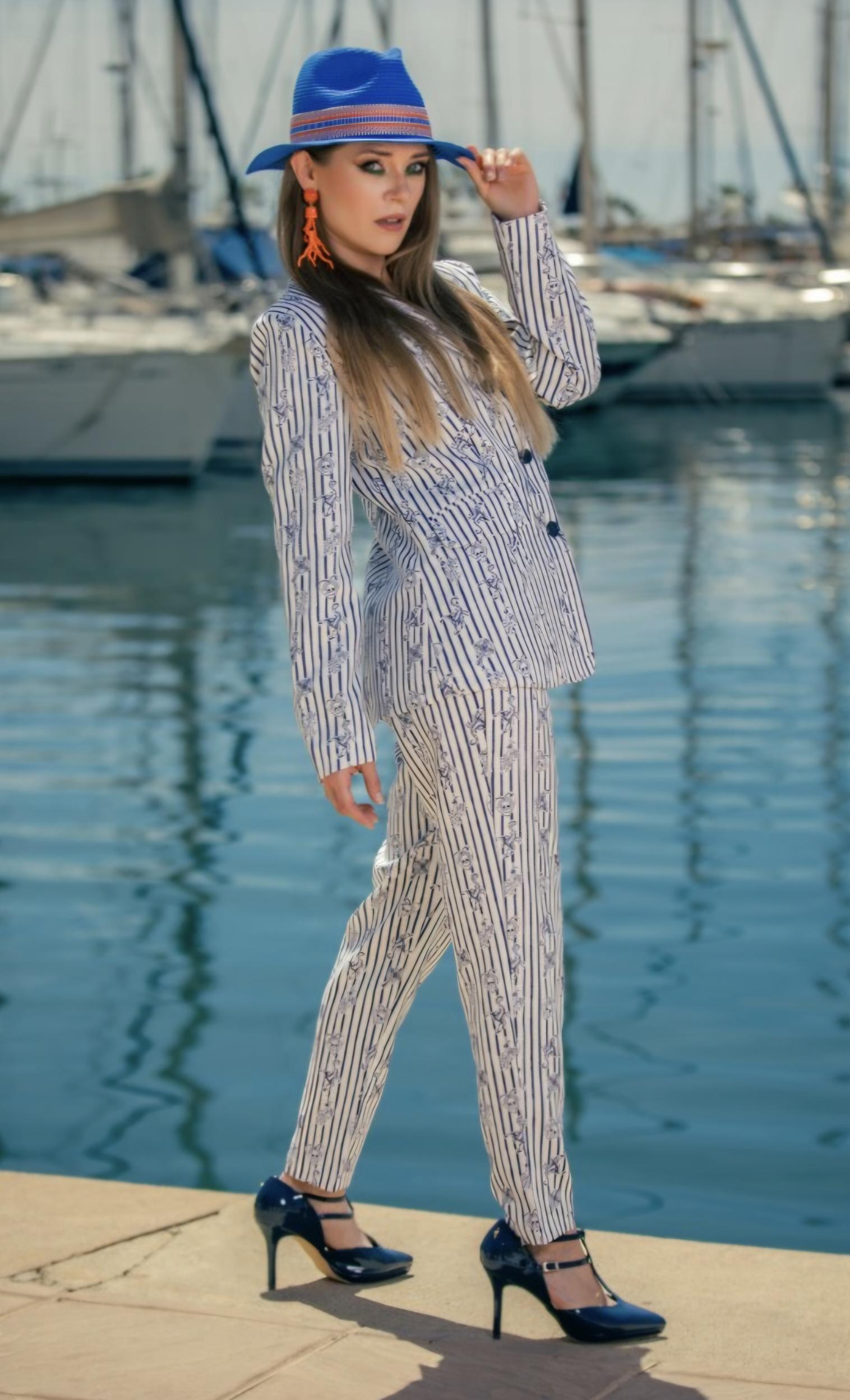 Estampación de tatoo y rayas en tonos azules sobre fondo blanco.