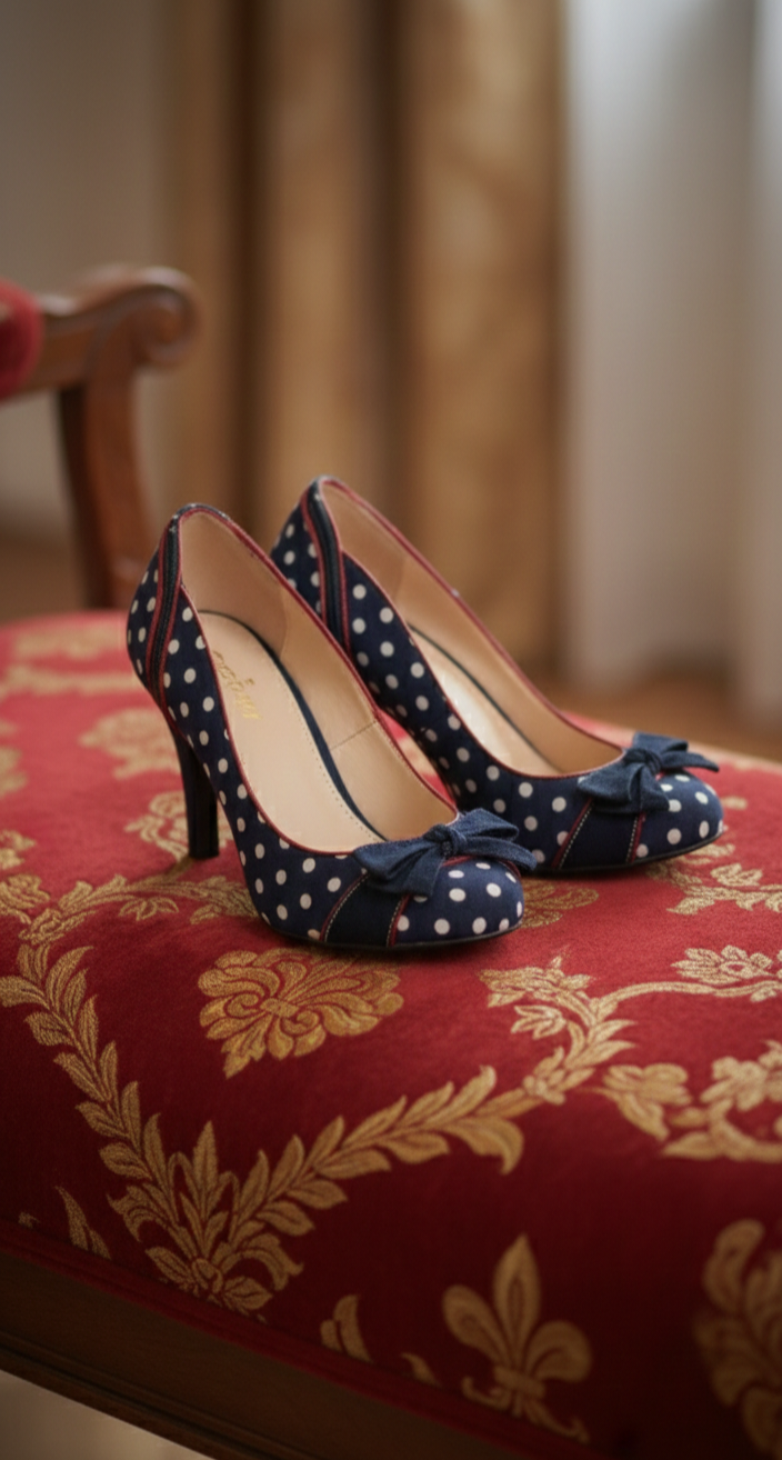 Zapato salón de topitos blancos sobre fondo azul marino.