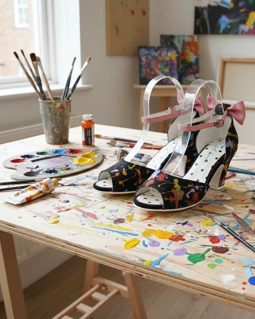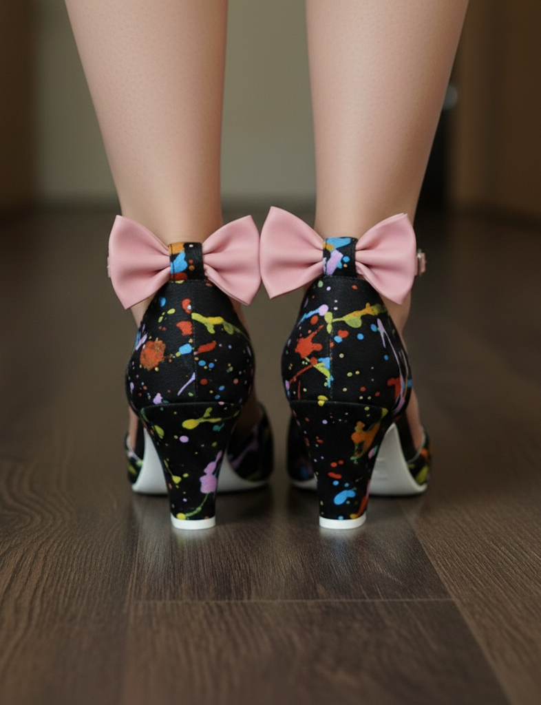 Sandalia en piel de pelo negro con manchas de pinturas de colores.