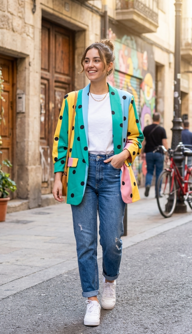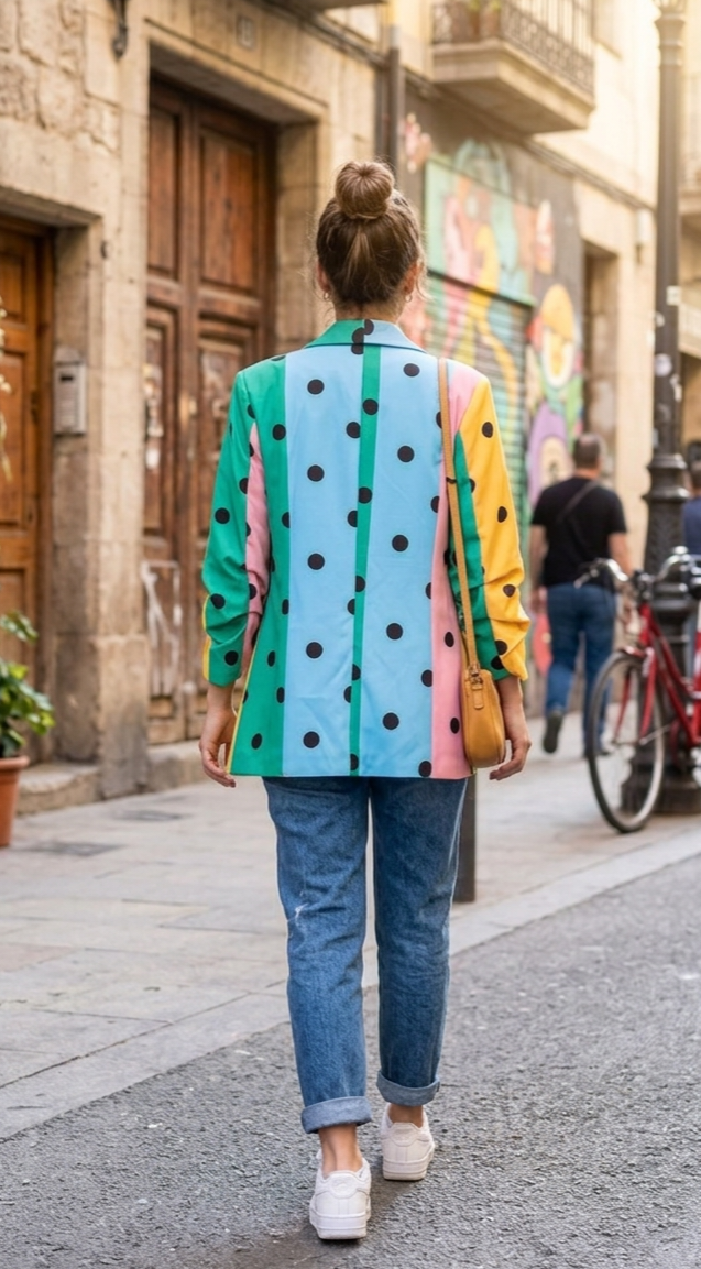 Estampación multicolor con lunares negros.