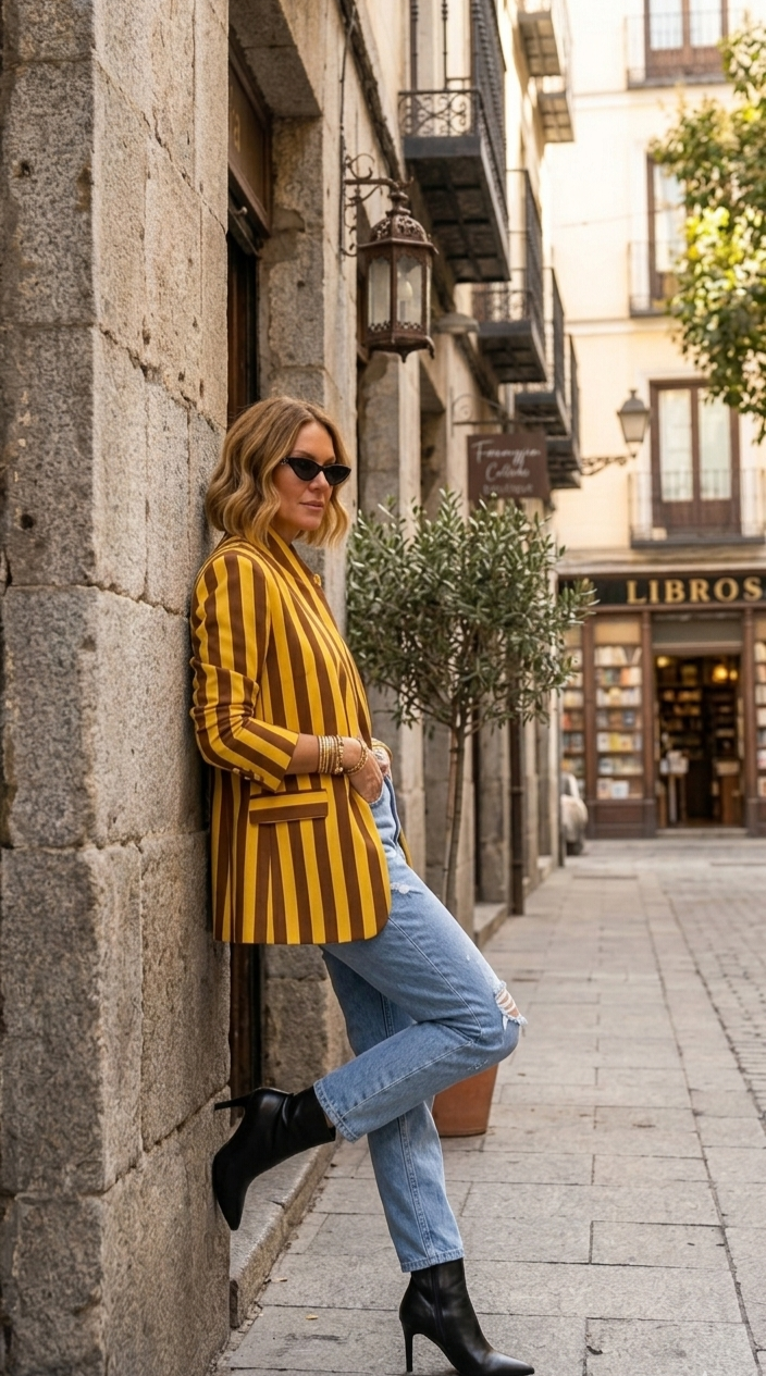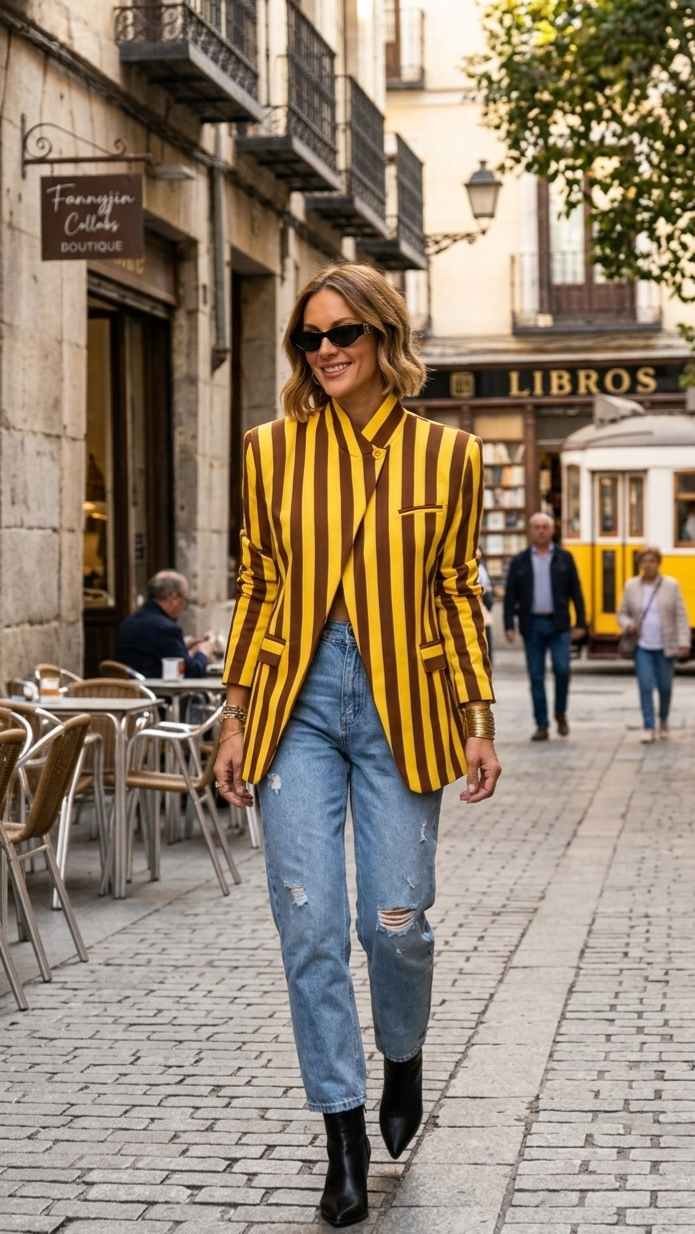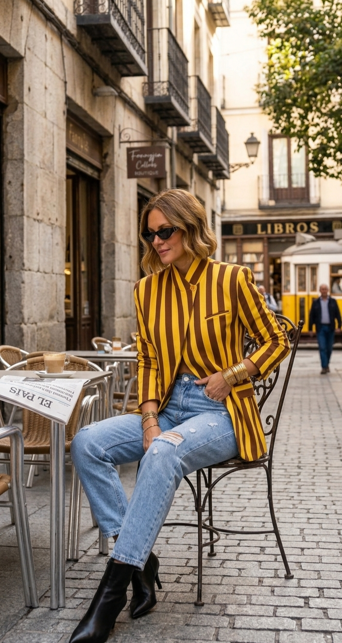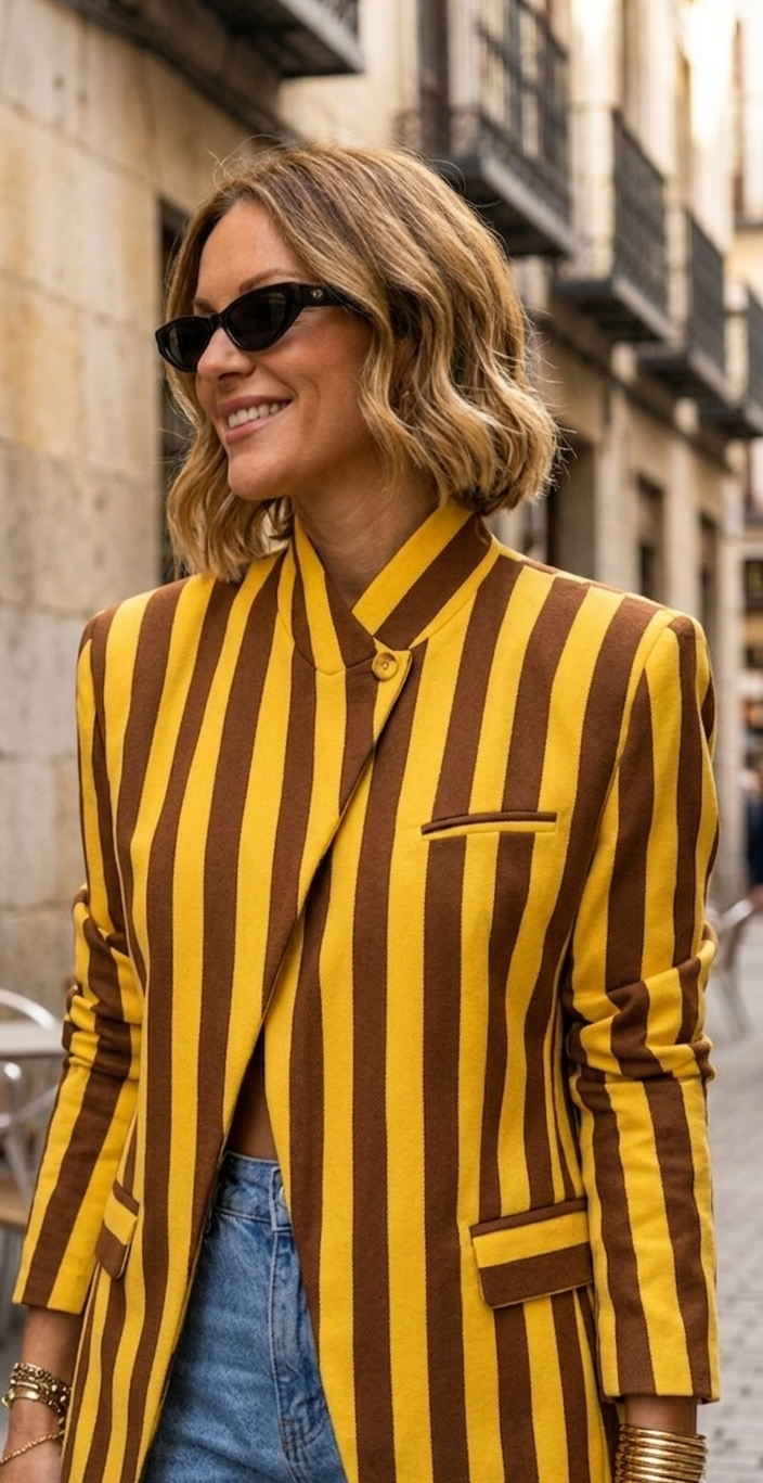 Americana a rayas con cierre delantero un solo botón cruzado.