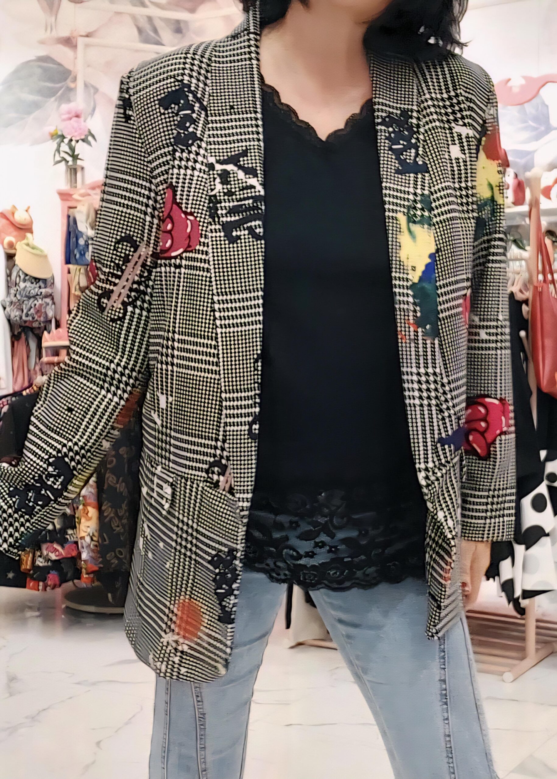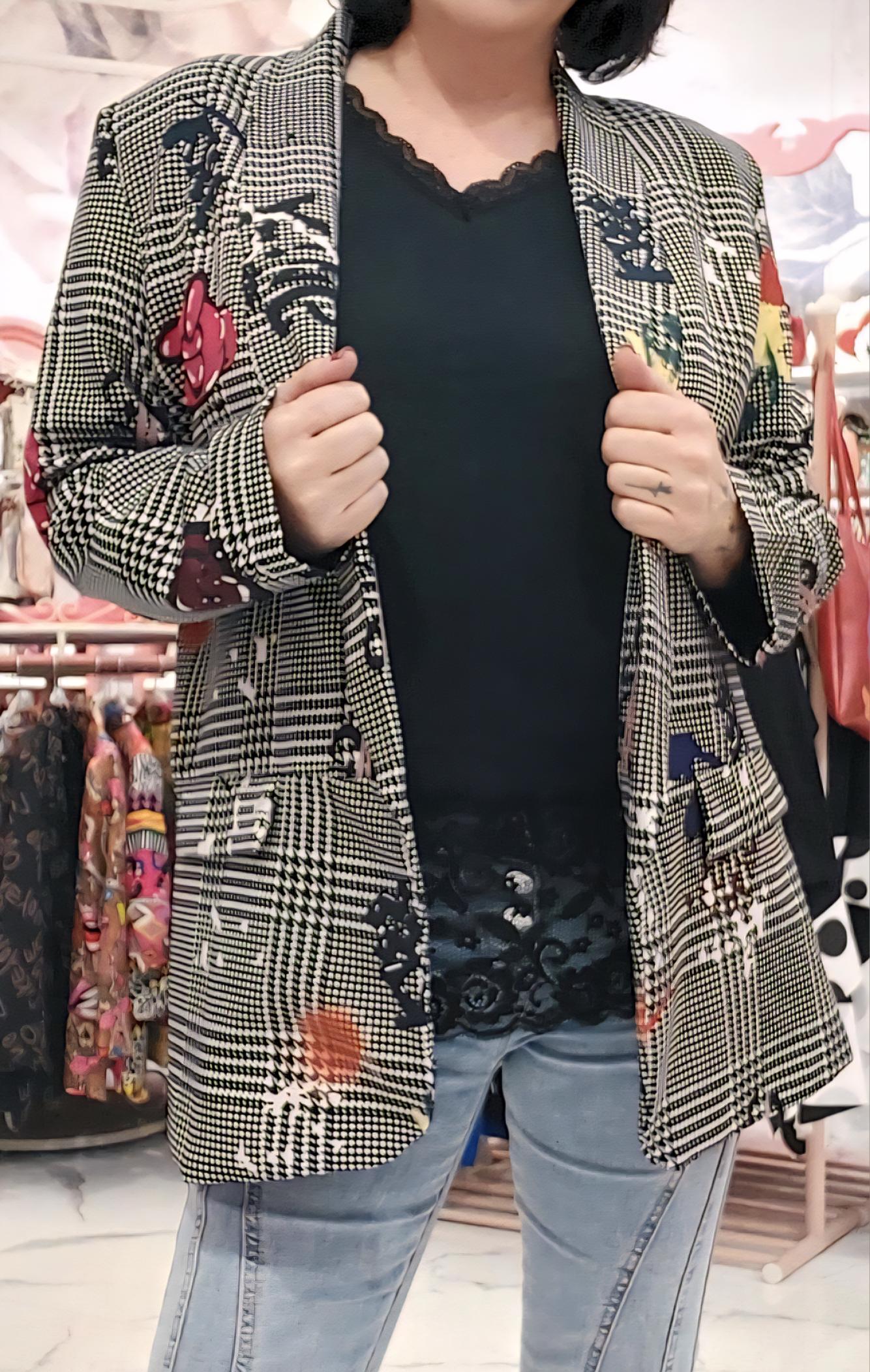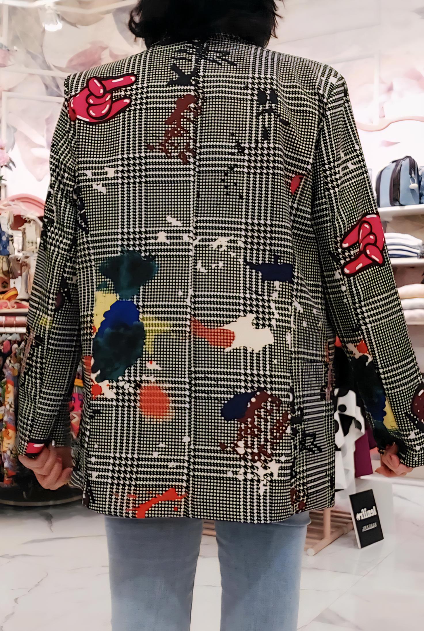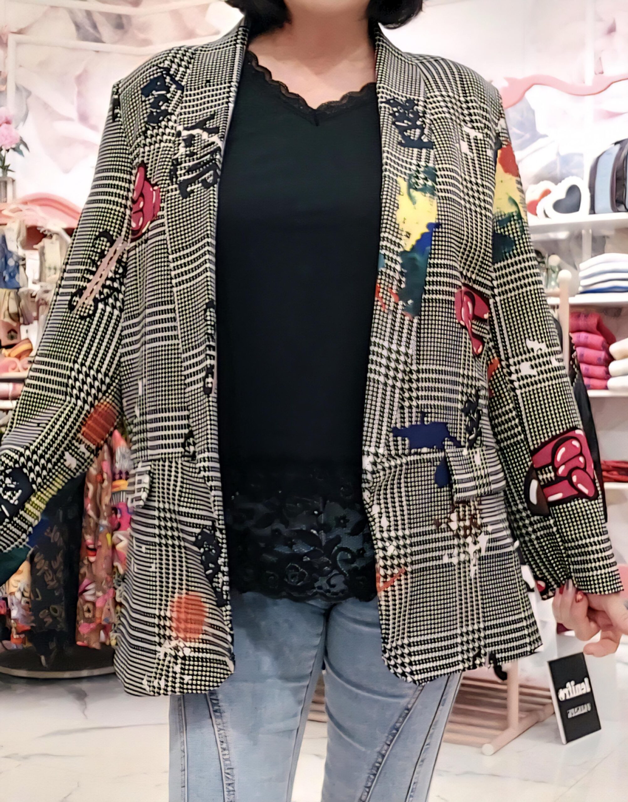 Estampación de motivos multicolor sobre fondo tartan blanco y negro.