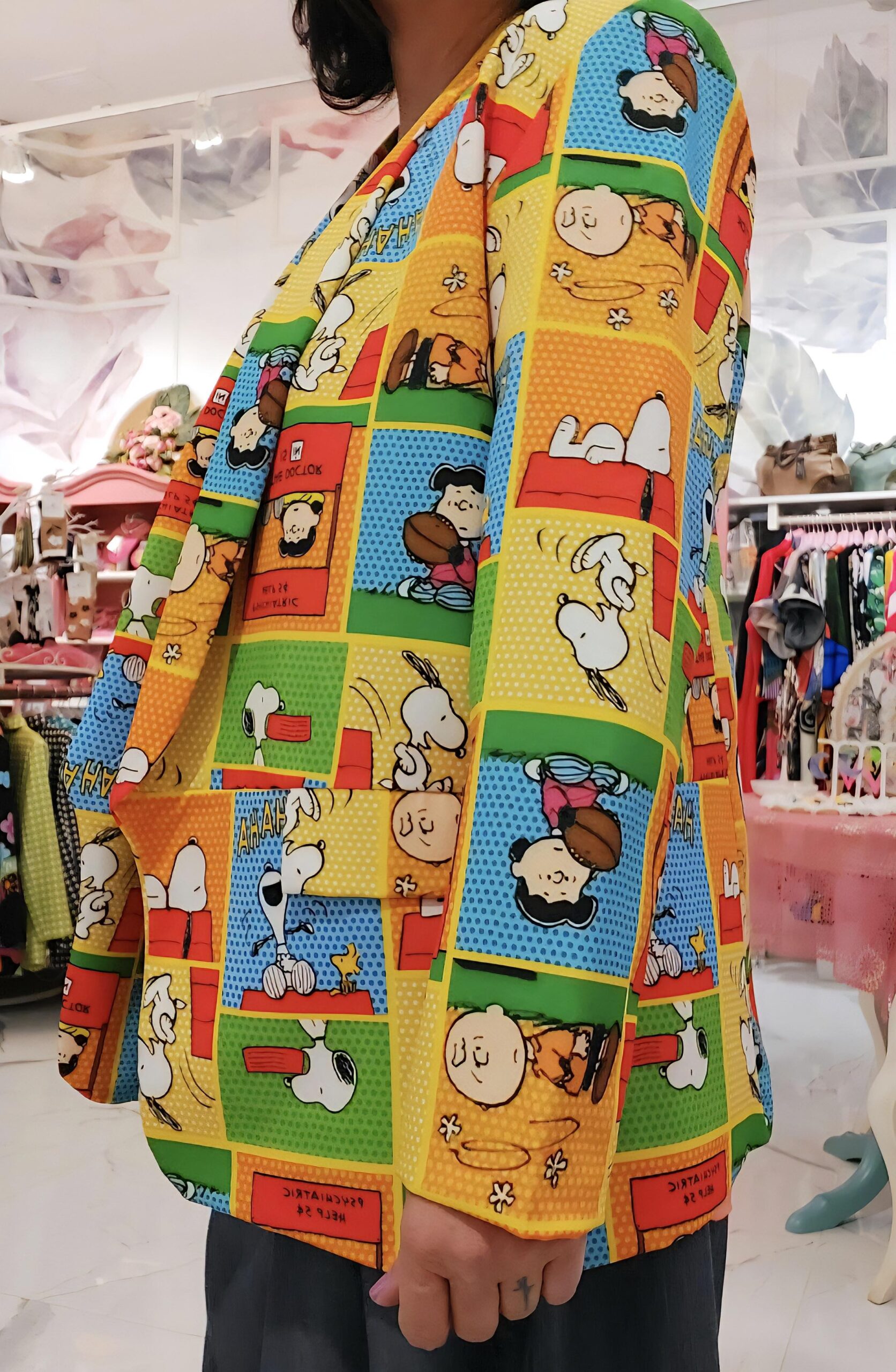 Estampación multicolor de Snoopy sobre fondo a cuadros multicolor.