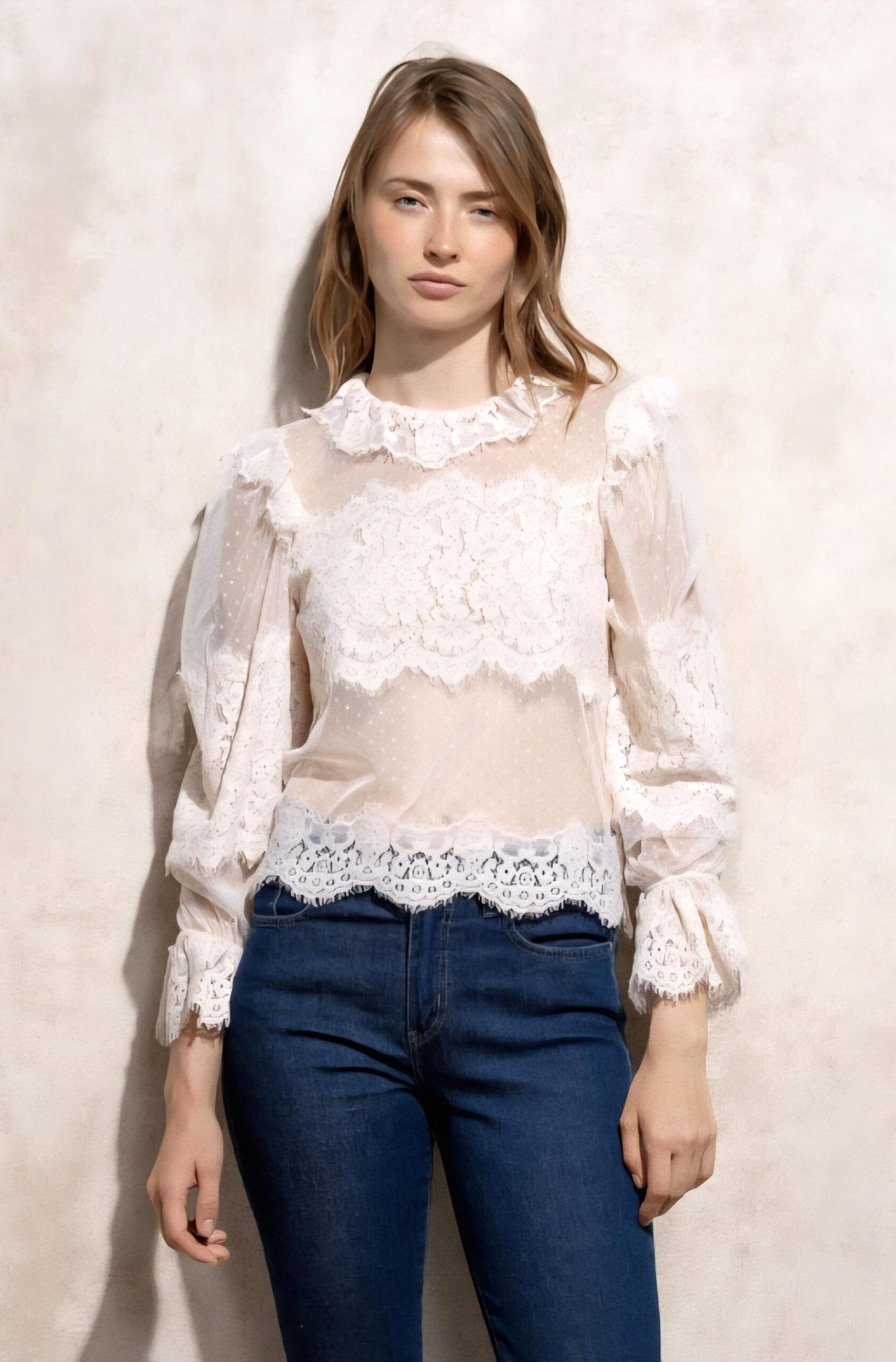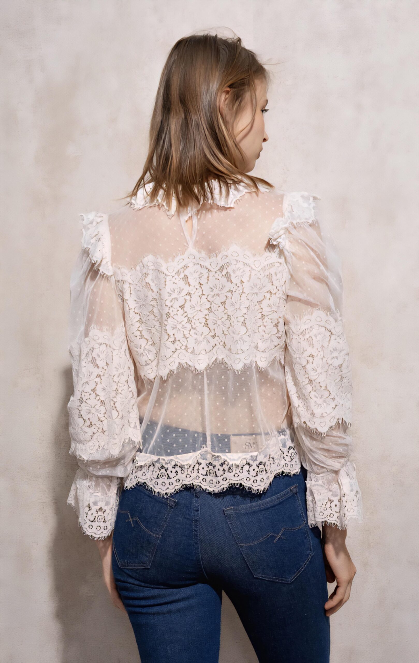 Blusa romántica de encaje y tul plumeti en color crudo.