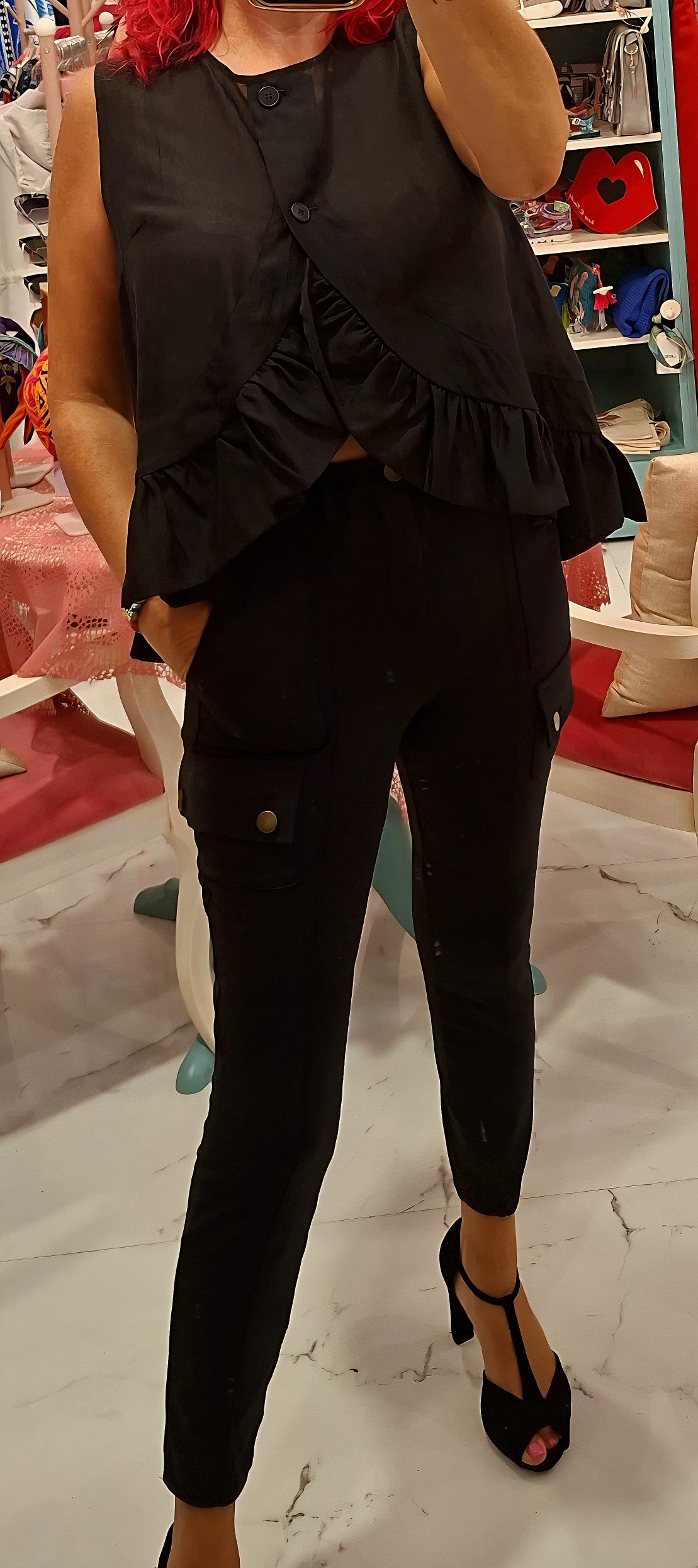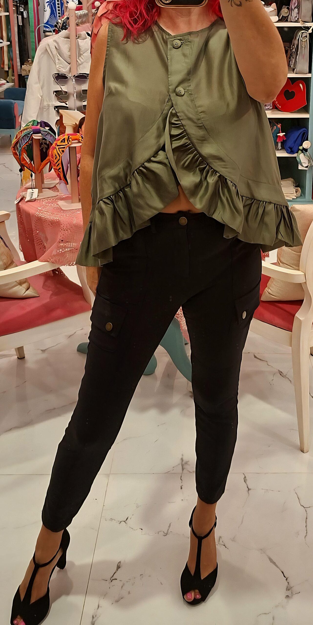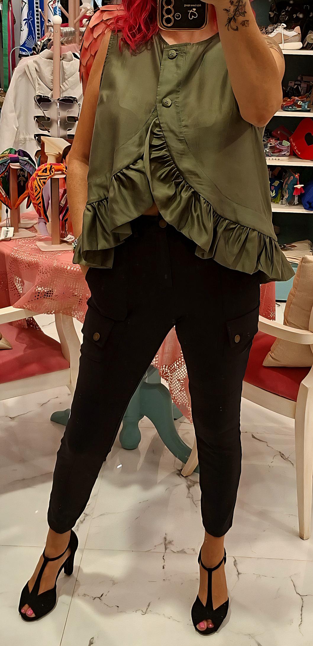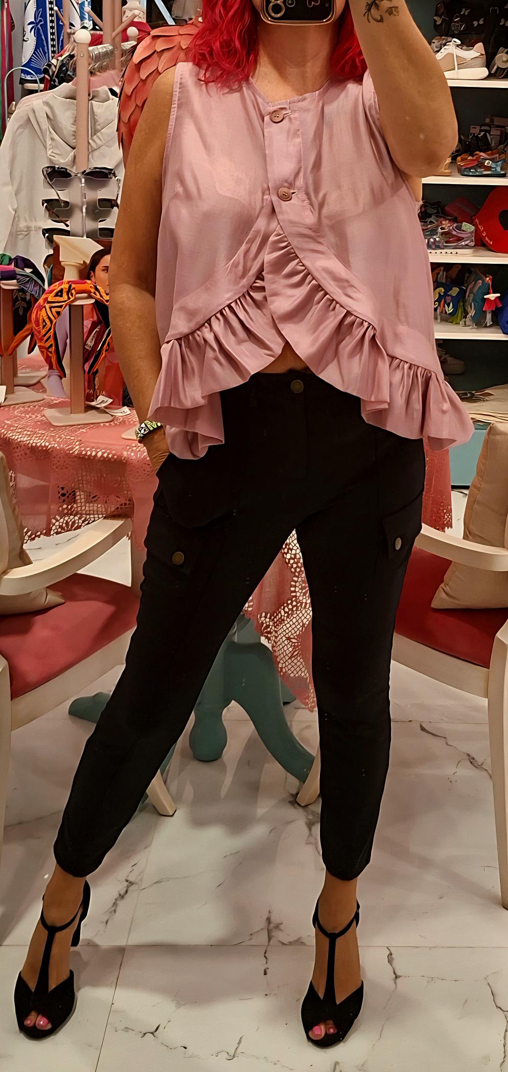 Manga sisa, cuello redondo y dos botones de cierre delantero.