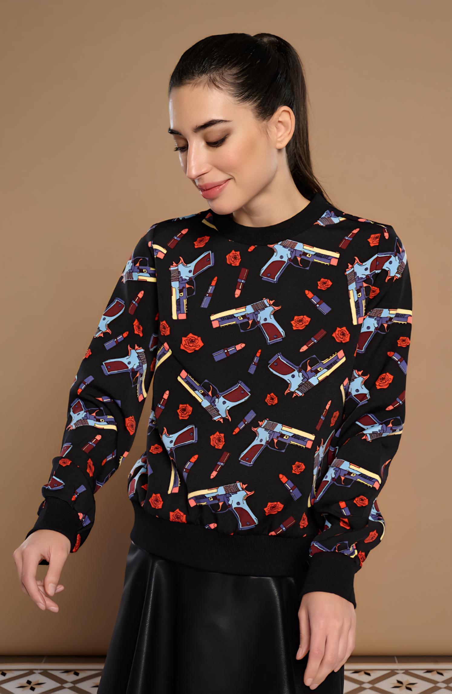 Estampación de Guns, Roses y Lipstick multicolor sobre fondo negro.