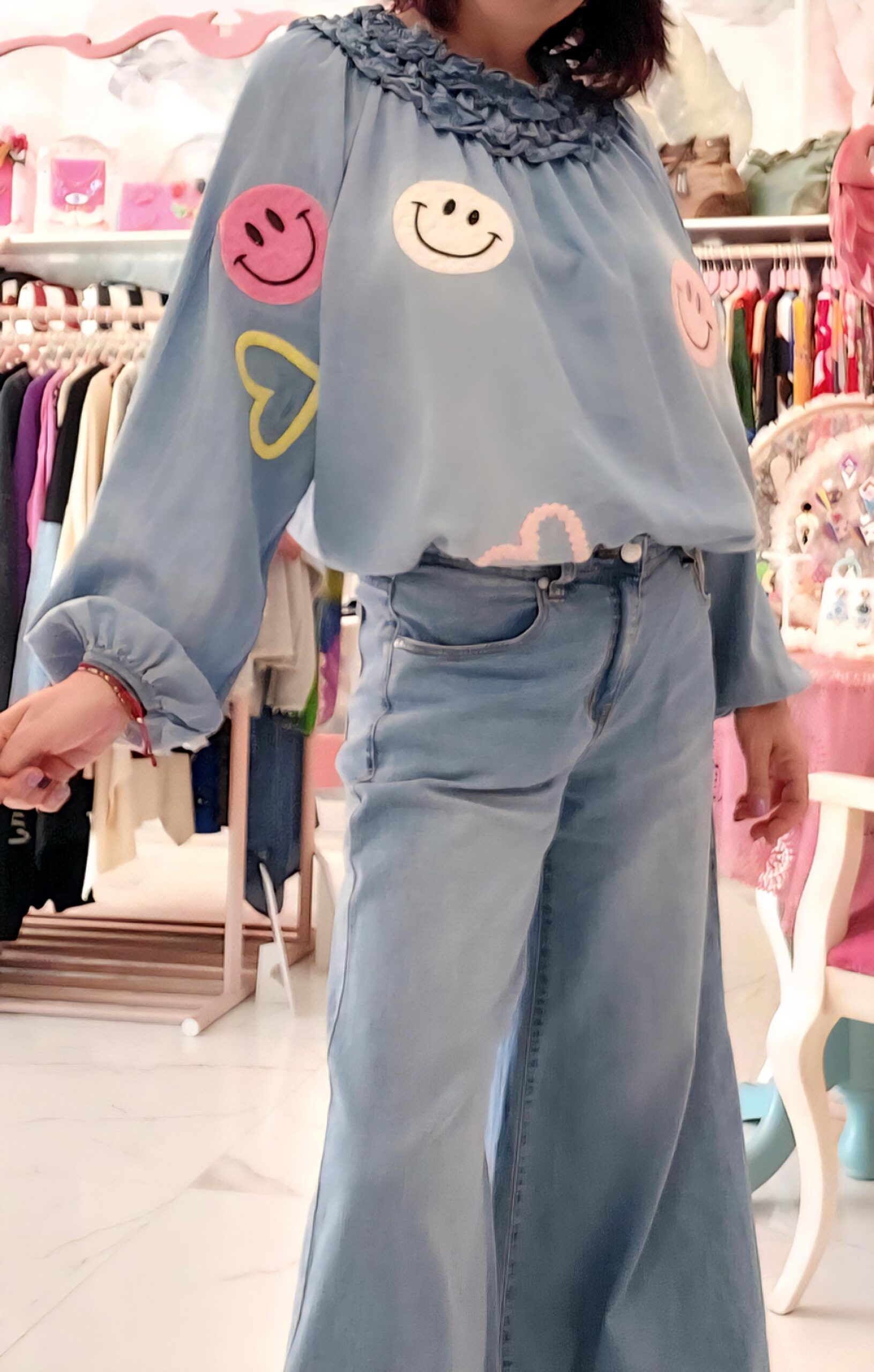 Blusón vaquero tipo tencel de manga larga con puño engomado.