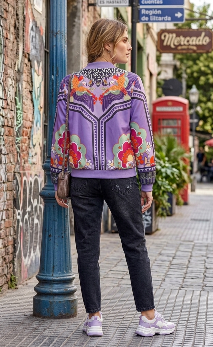 Estampación floral multicolor sobre fondo en tonos malvas y lilas.