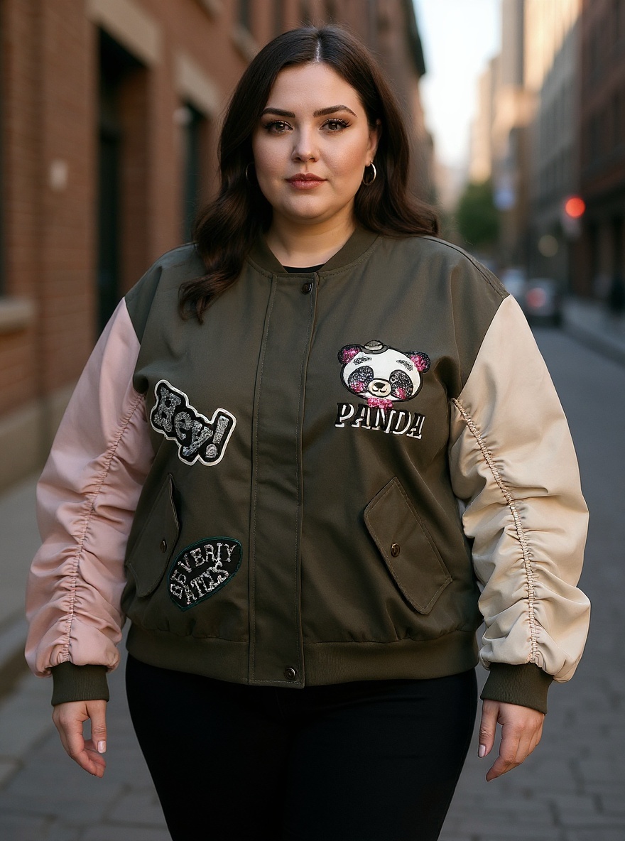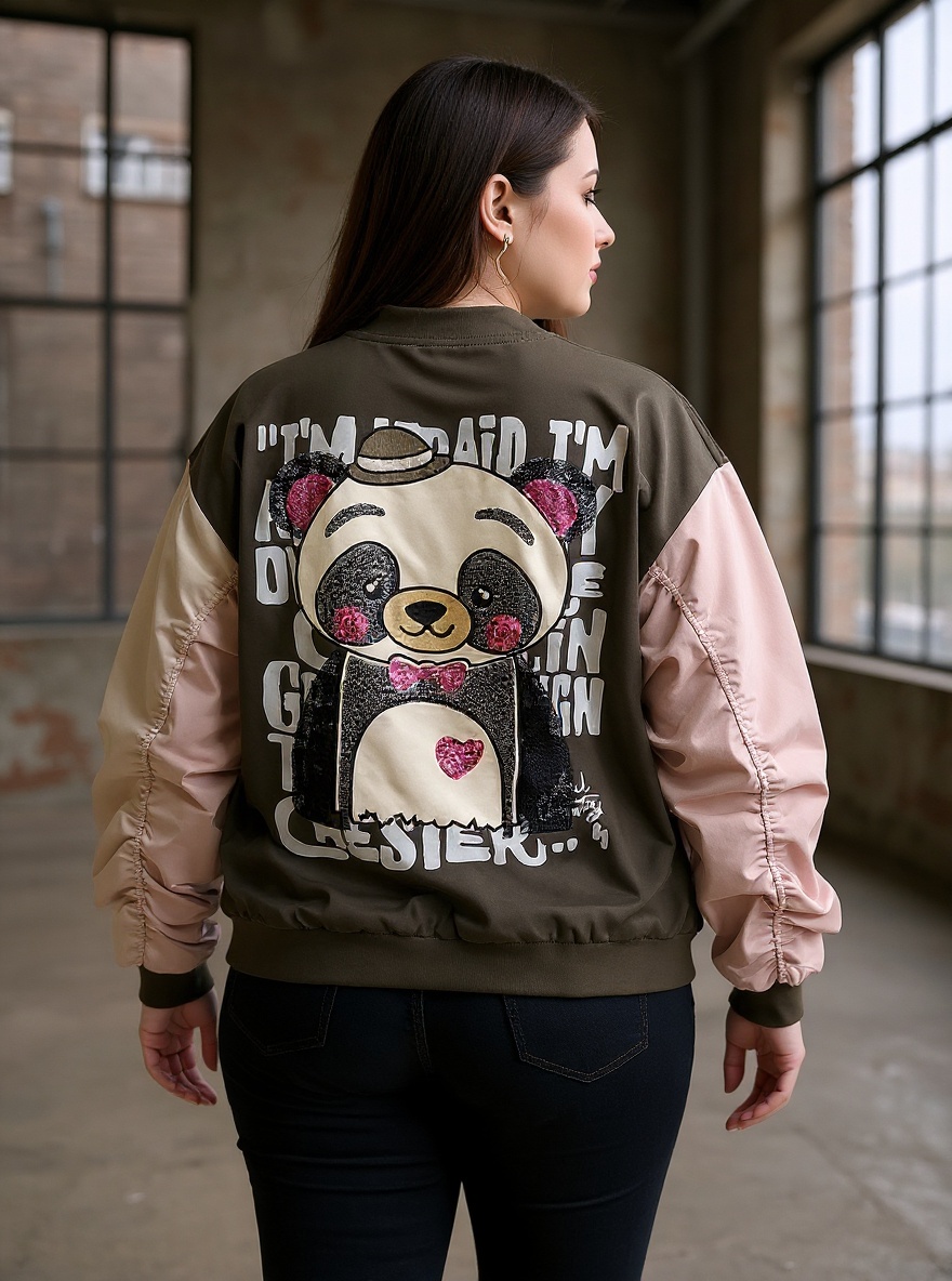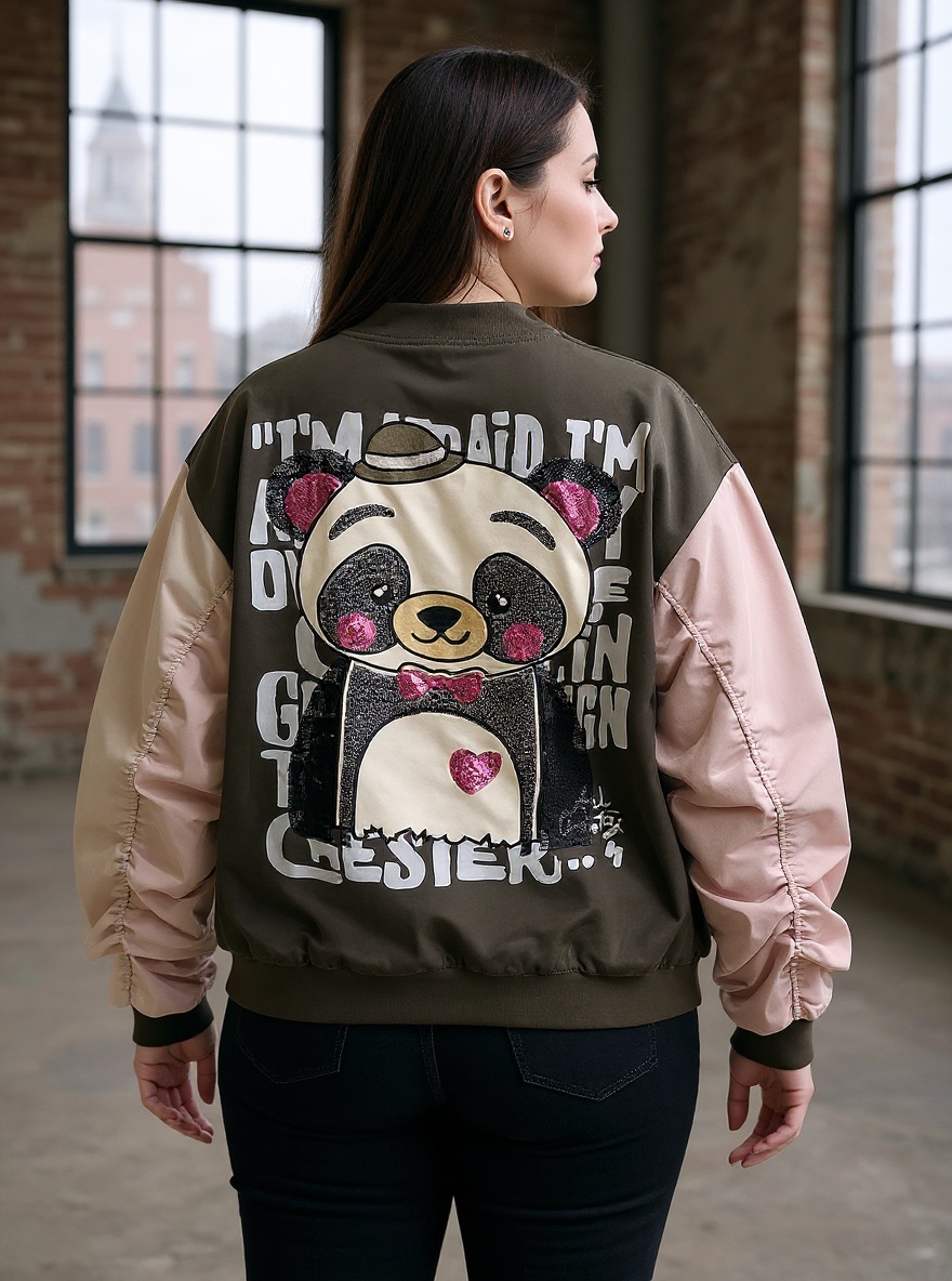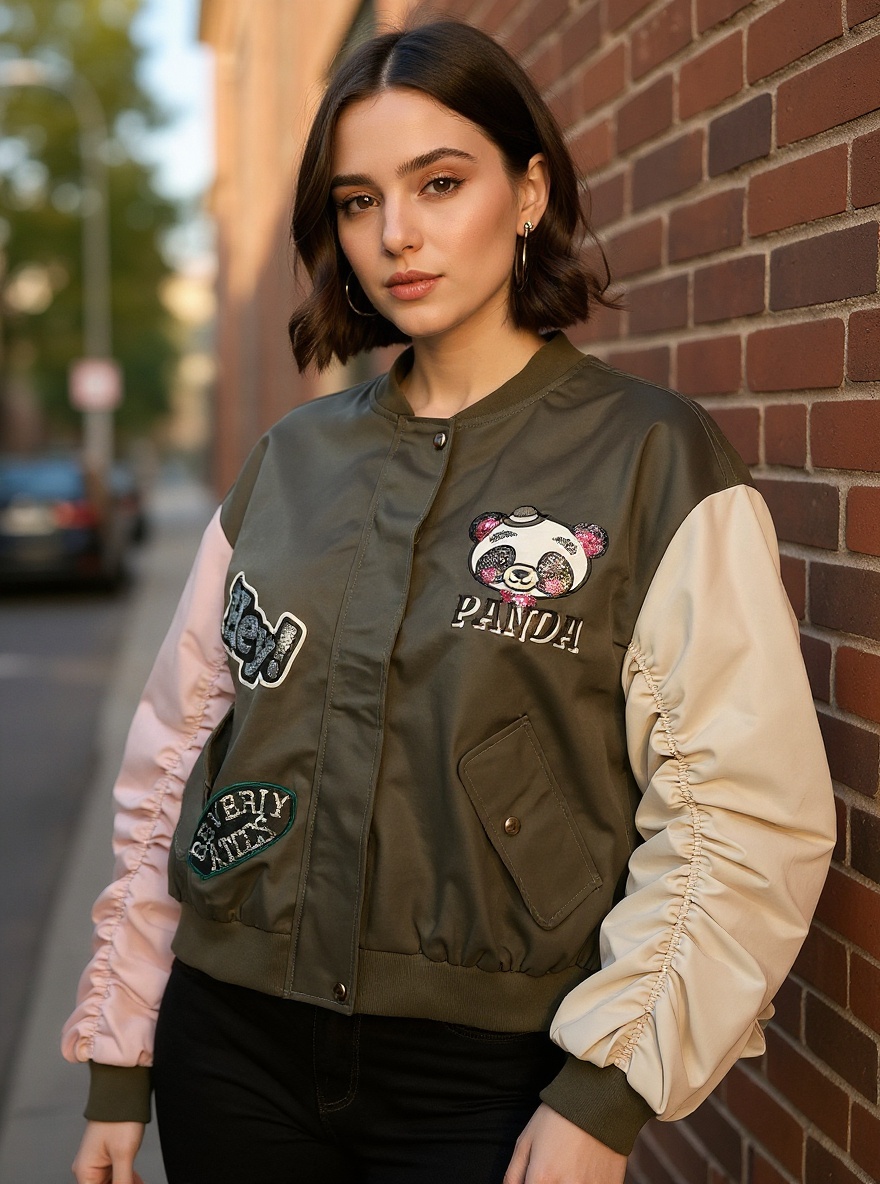 Detalles de parches bordados en delantera y maxi parche Panda en espalda.