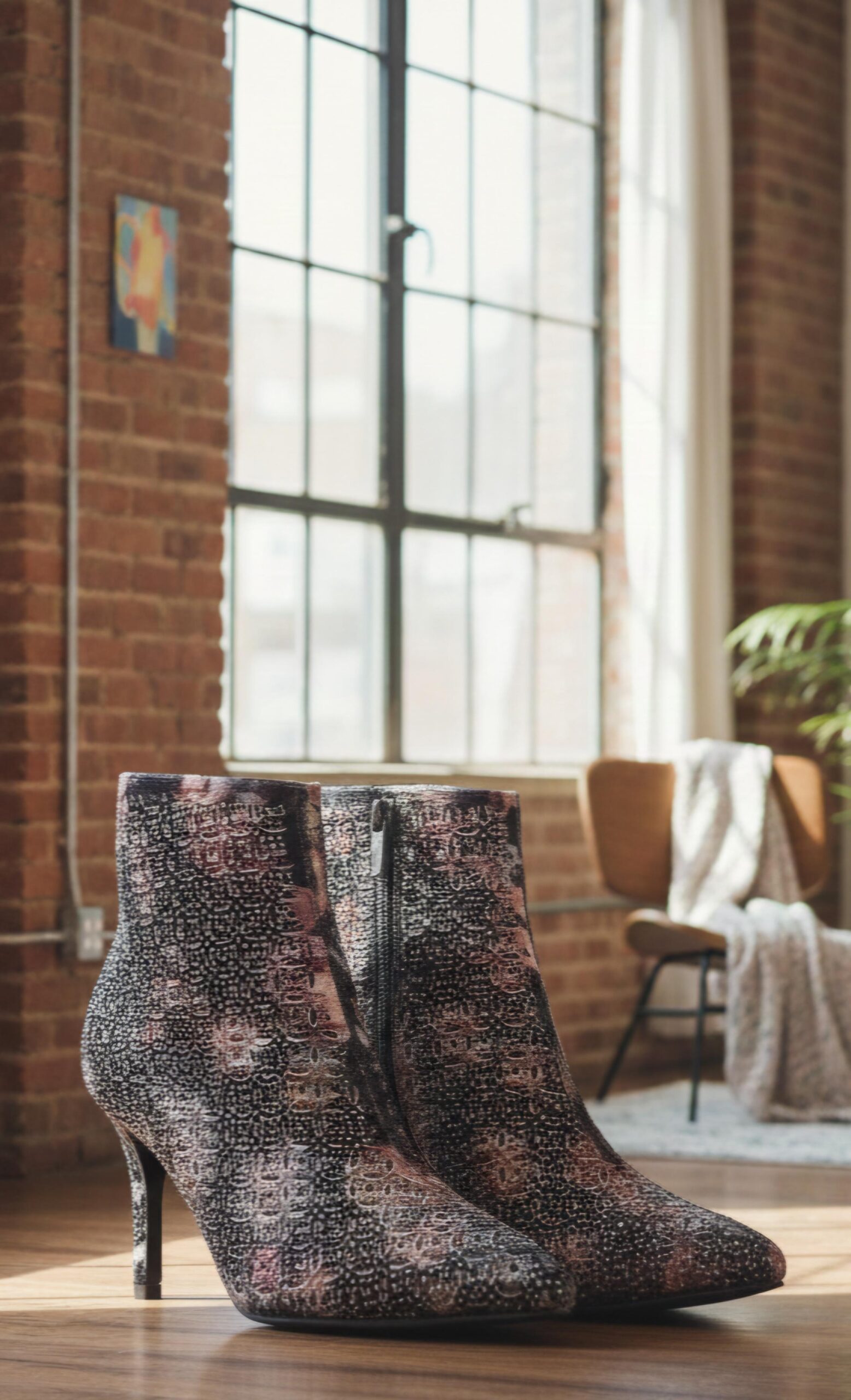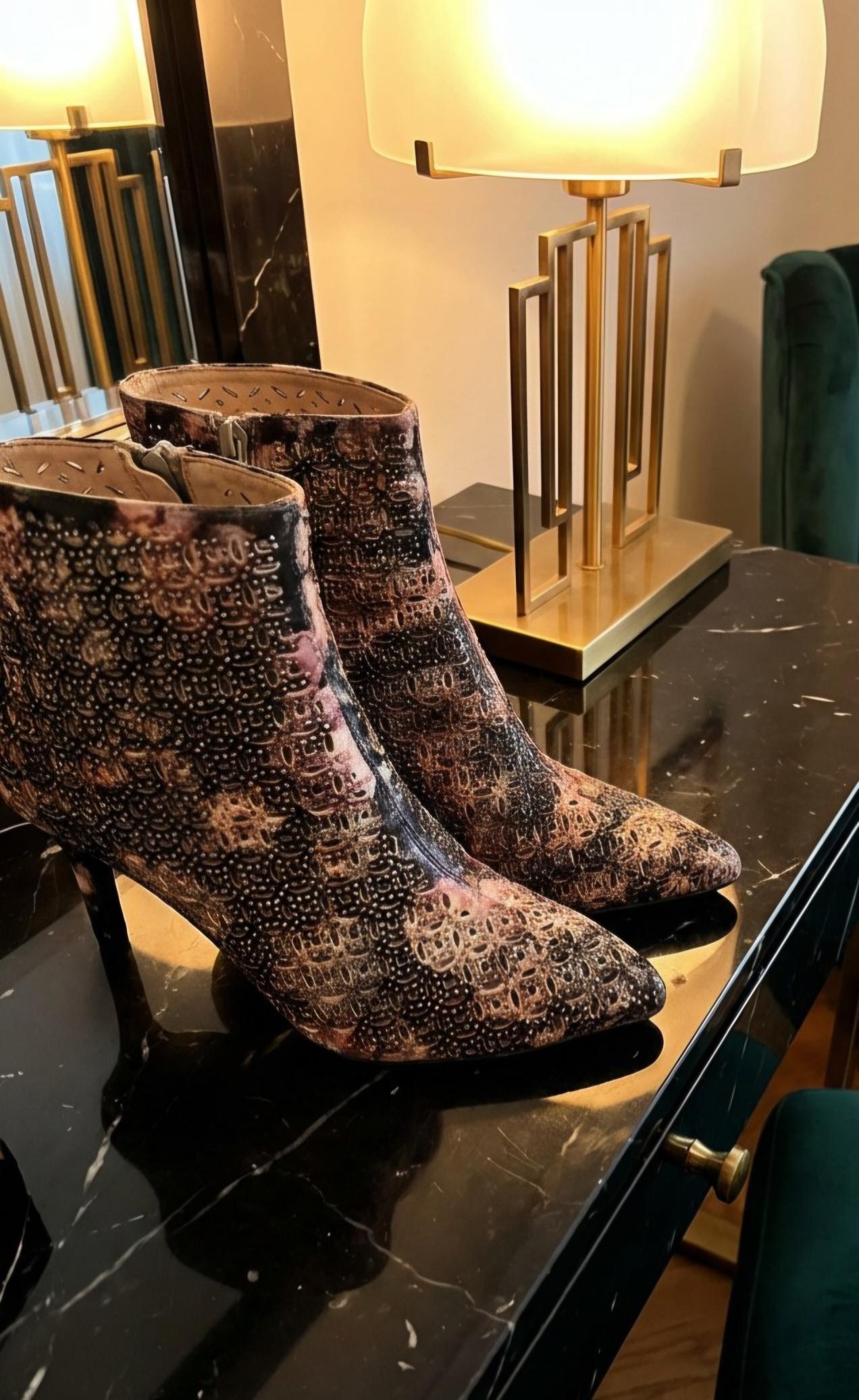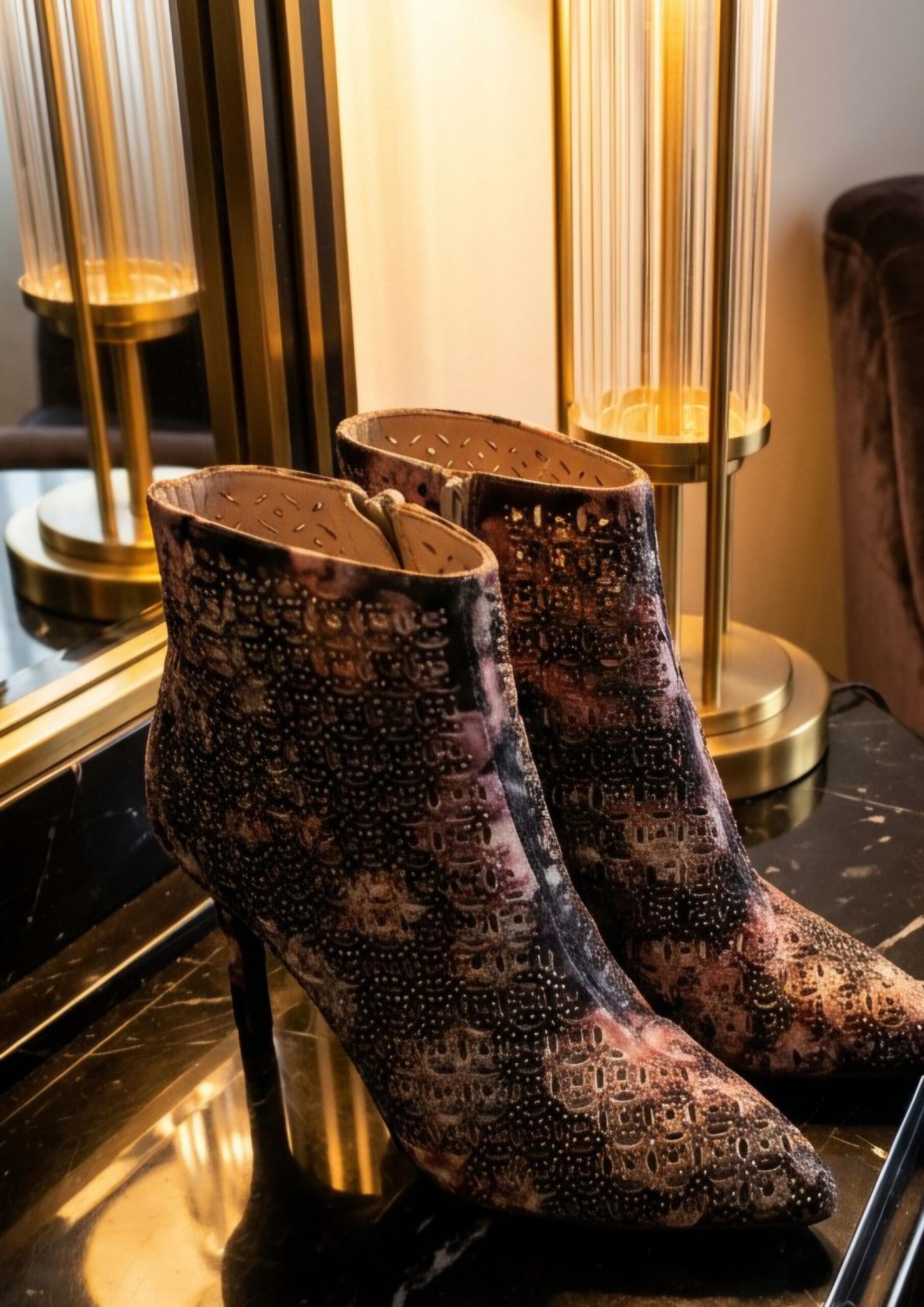 Botín de terciopelo calado con detalle de pequeñas tachas brillantes decorativas.