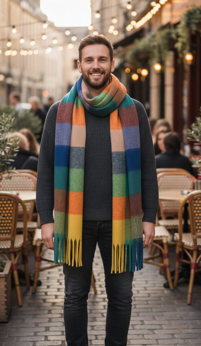 Bufanda gruesa en tejido de lana con terminación en flecos del mismo tejido.