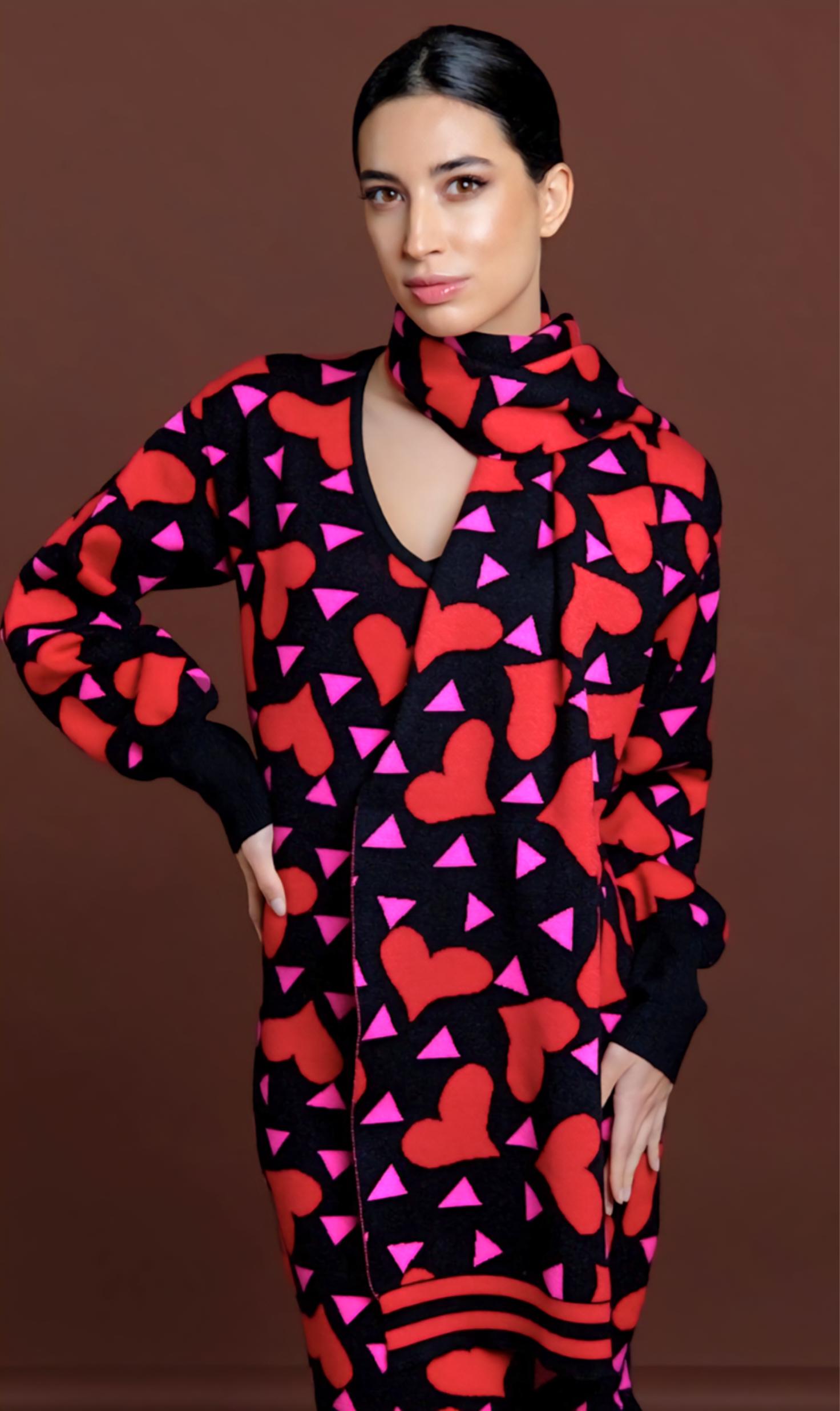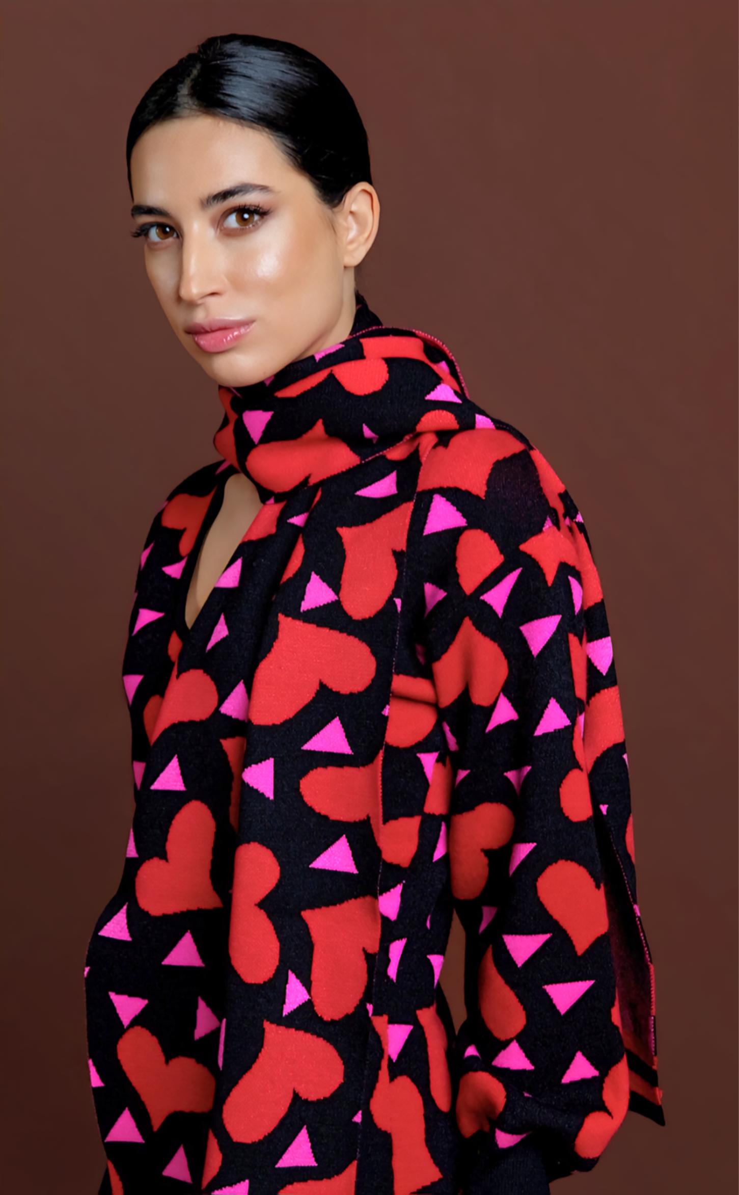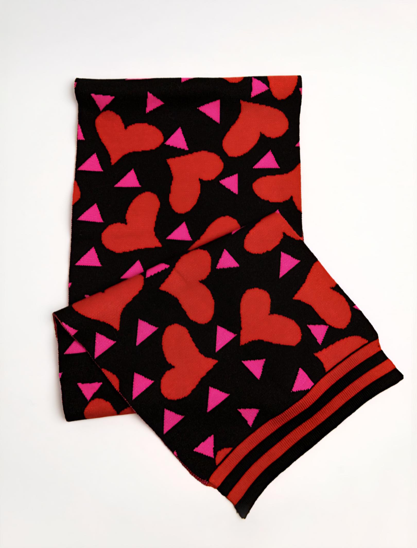 Estampación de corazones rojos y triángulos fucsias sobre fondo negro.