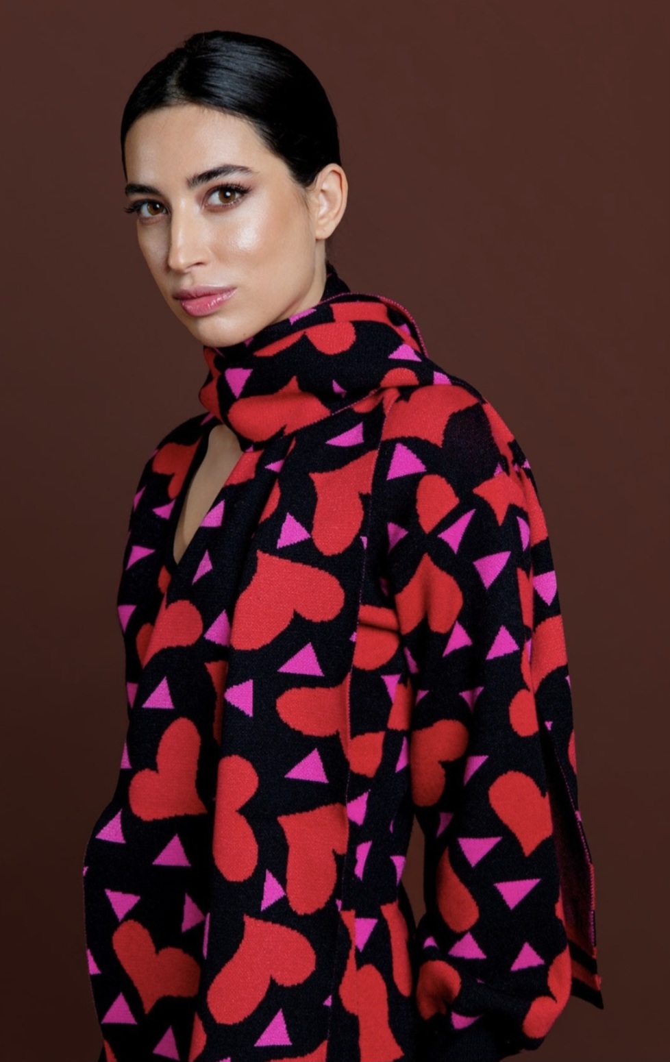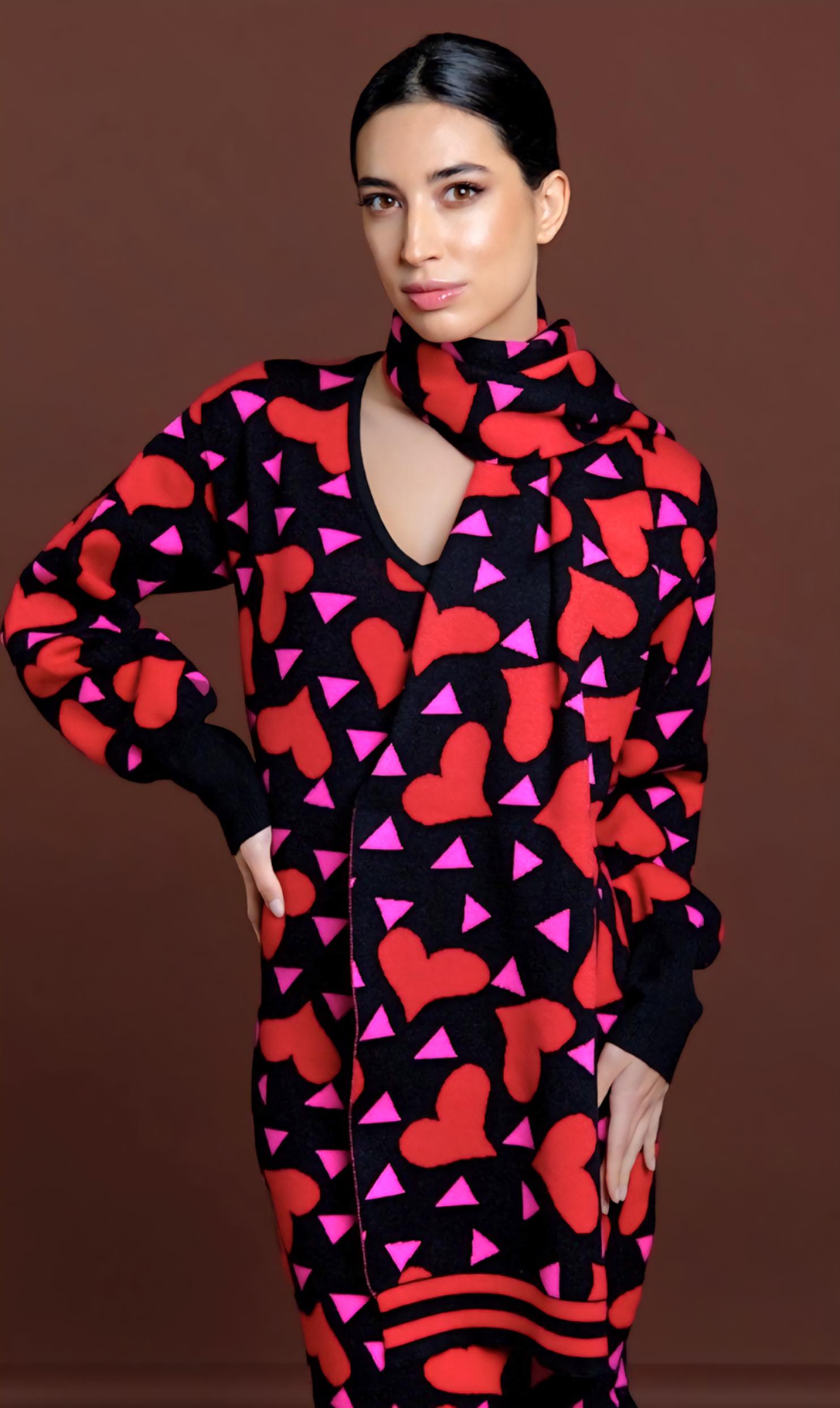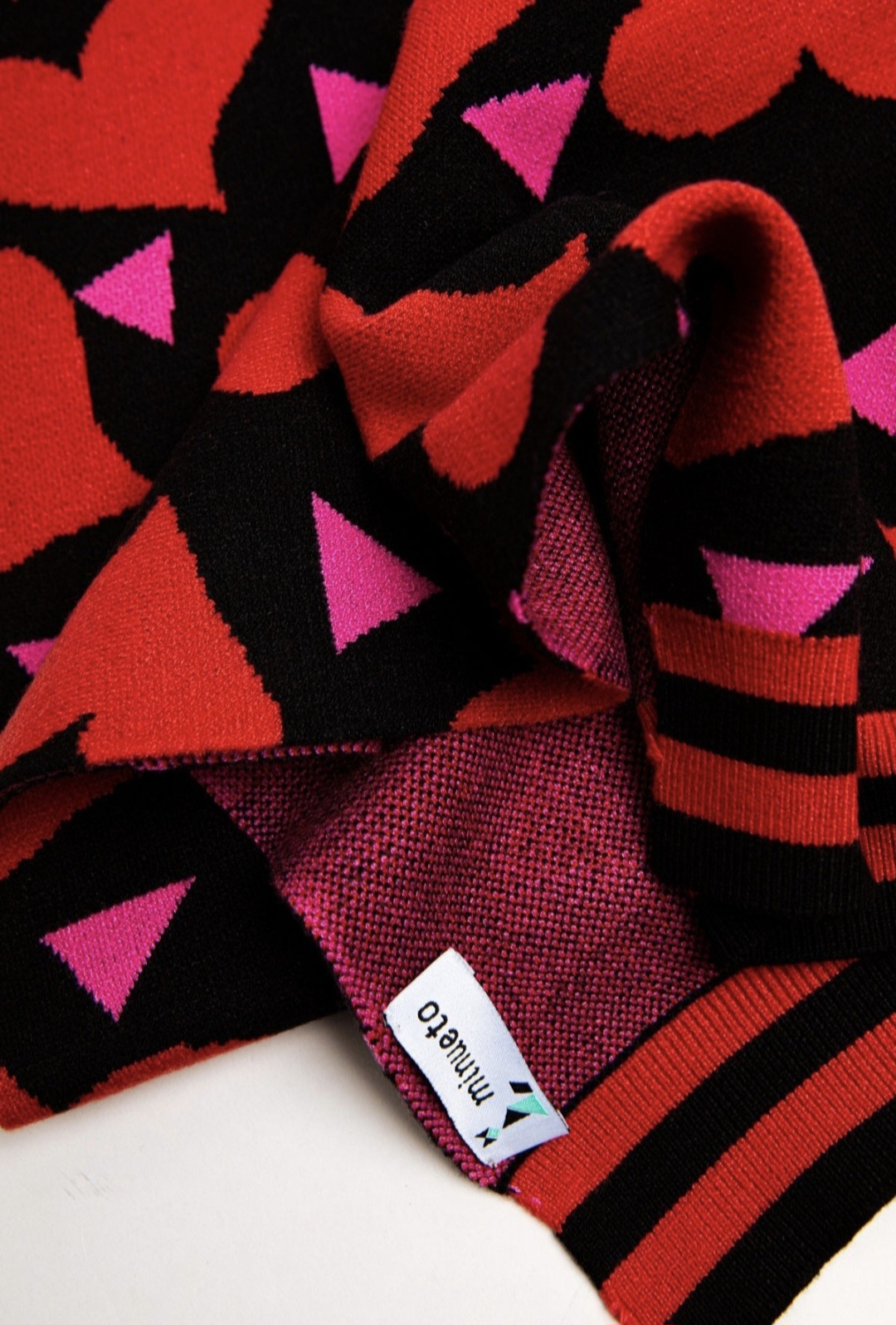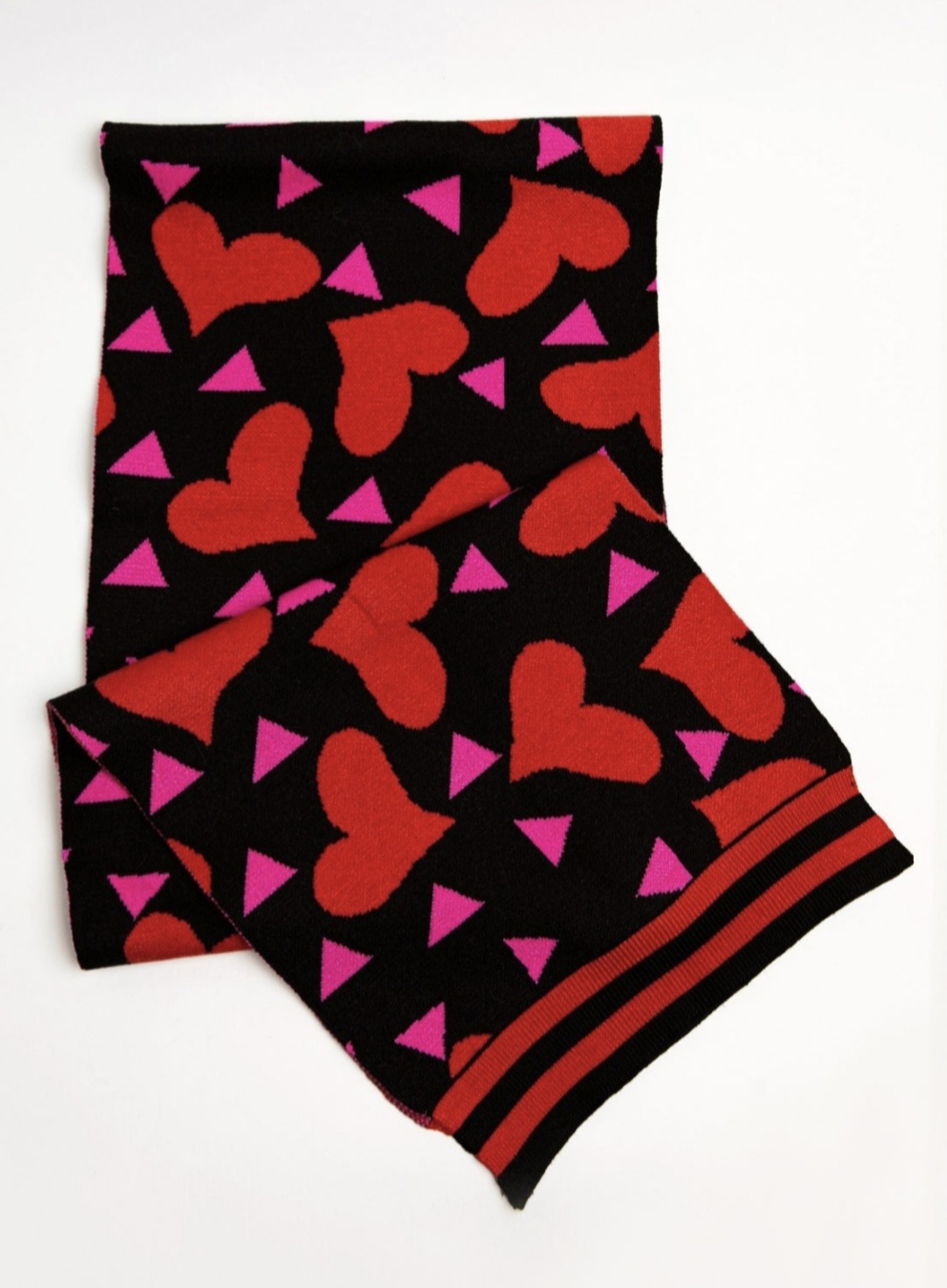 Bufanda de punto con estampado de corazones rojos y triángulos fucsia sobre fondo negro.