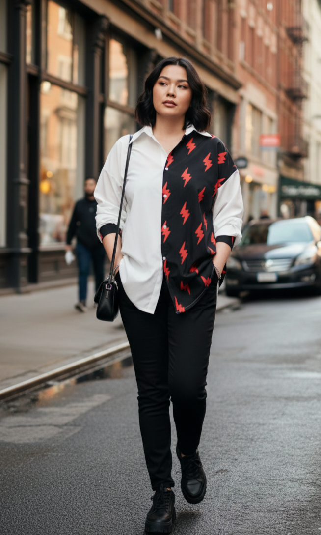 Un lateral y puños en estampación rayos rojos sobre fondo negro y el resto blanco liso.