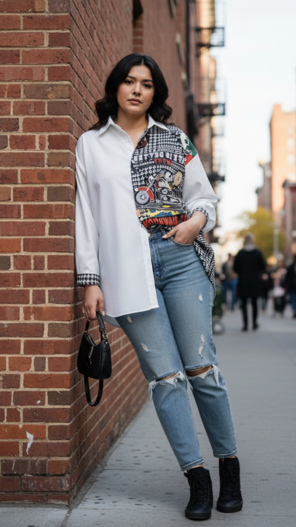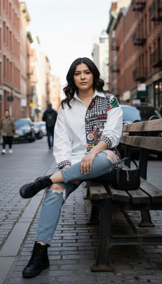 Un lateral y puños en estampación pata de gallo blanco/negro y el resto blanco liso.