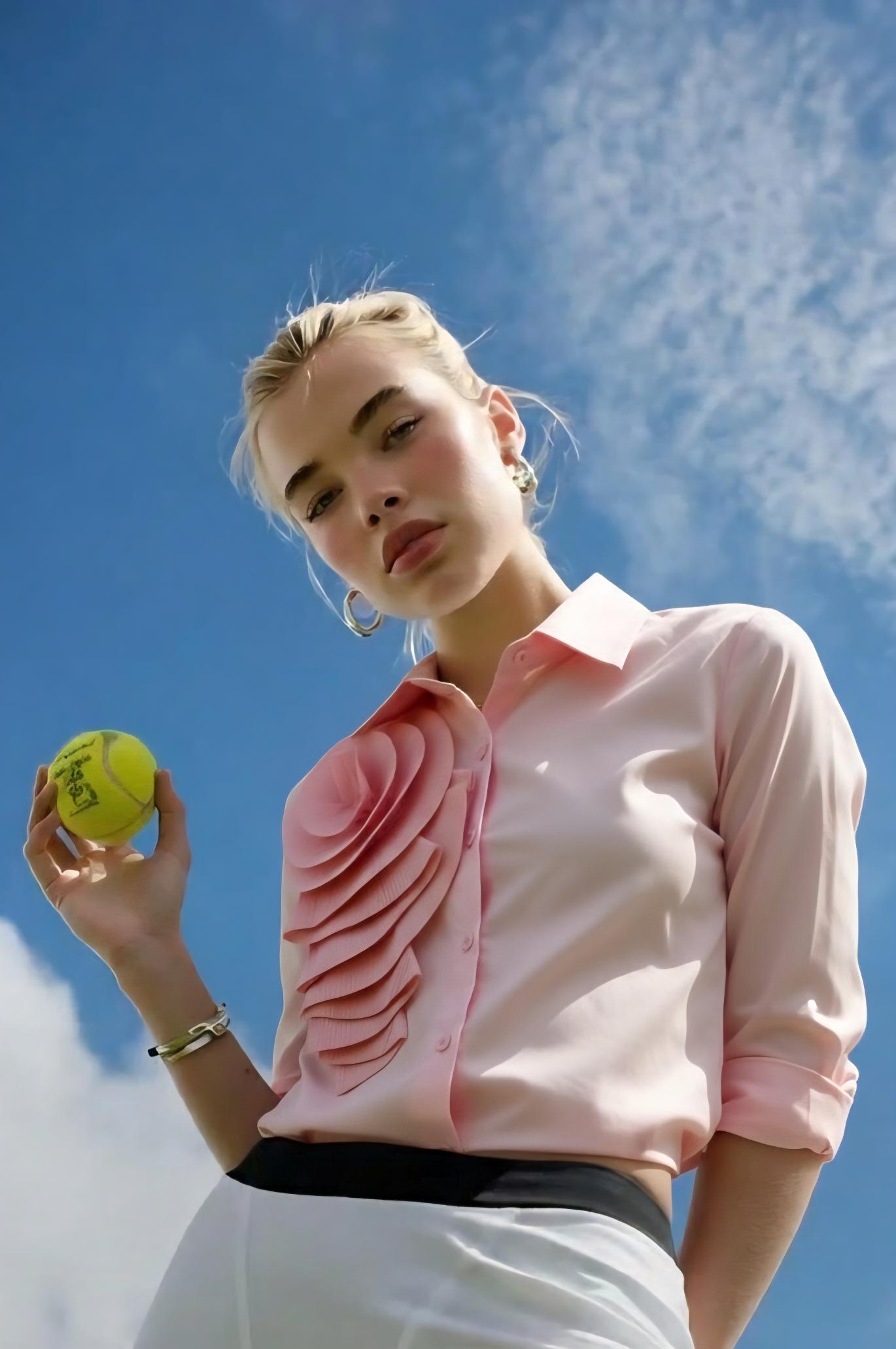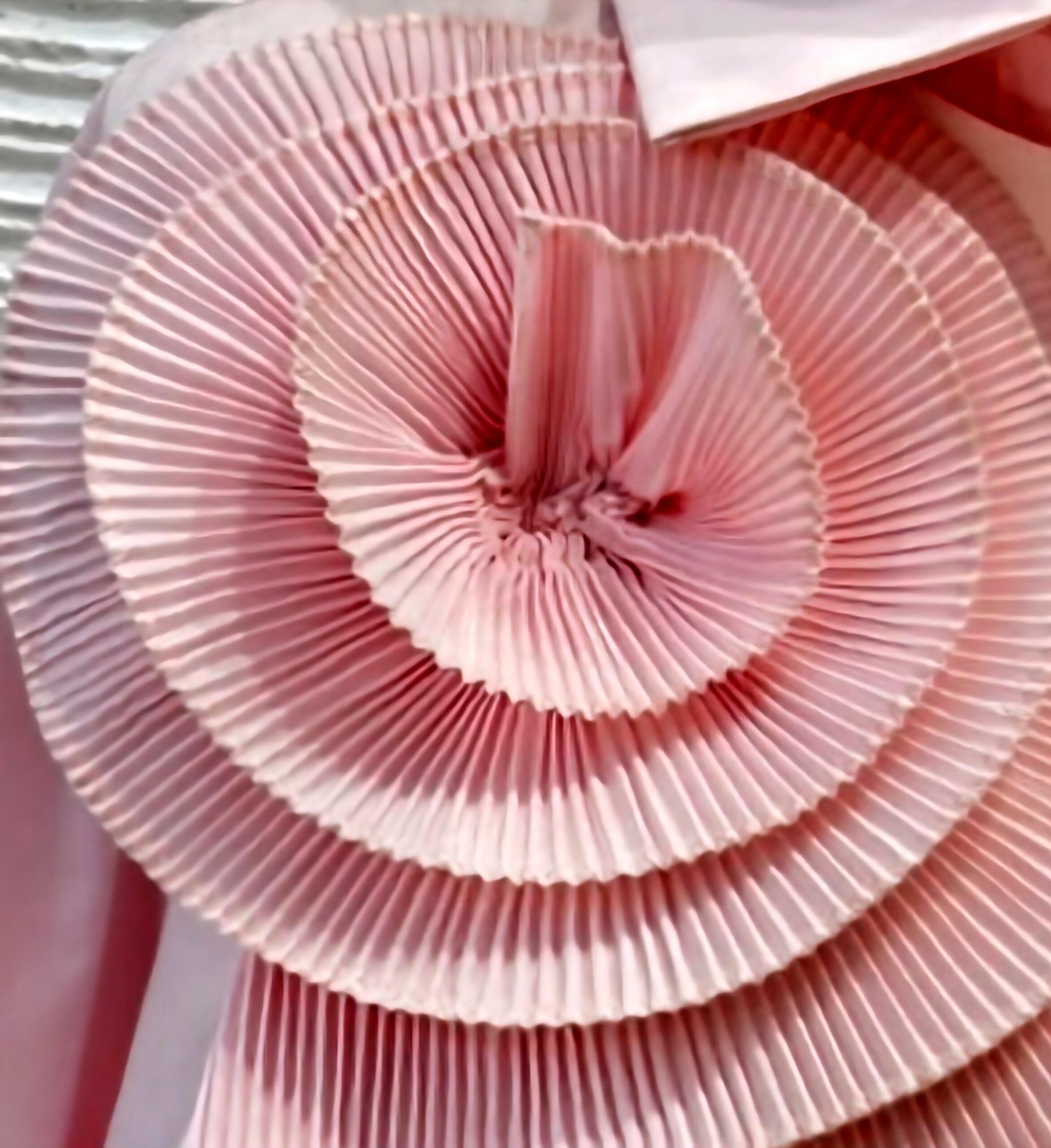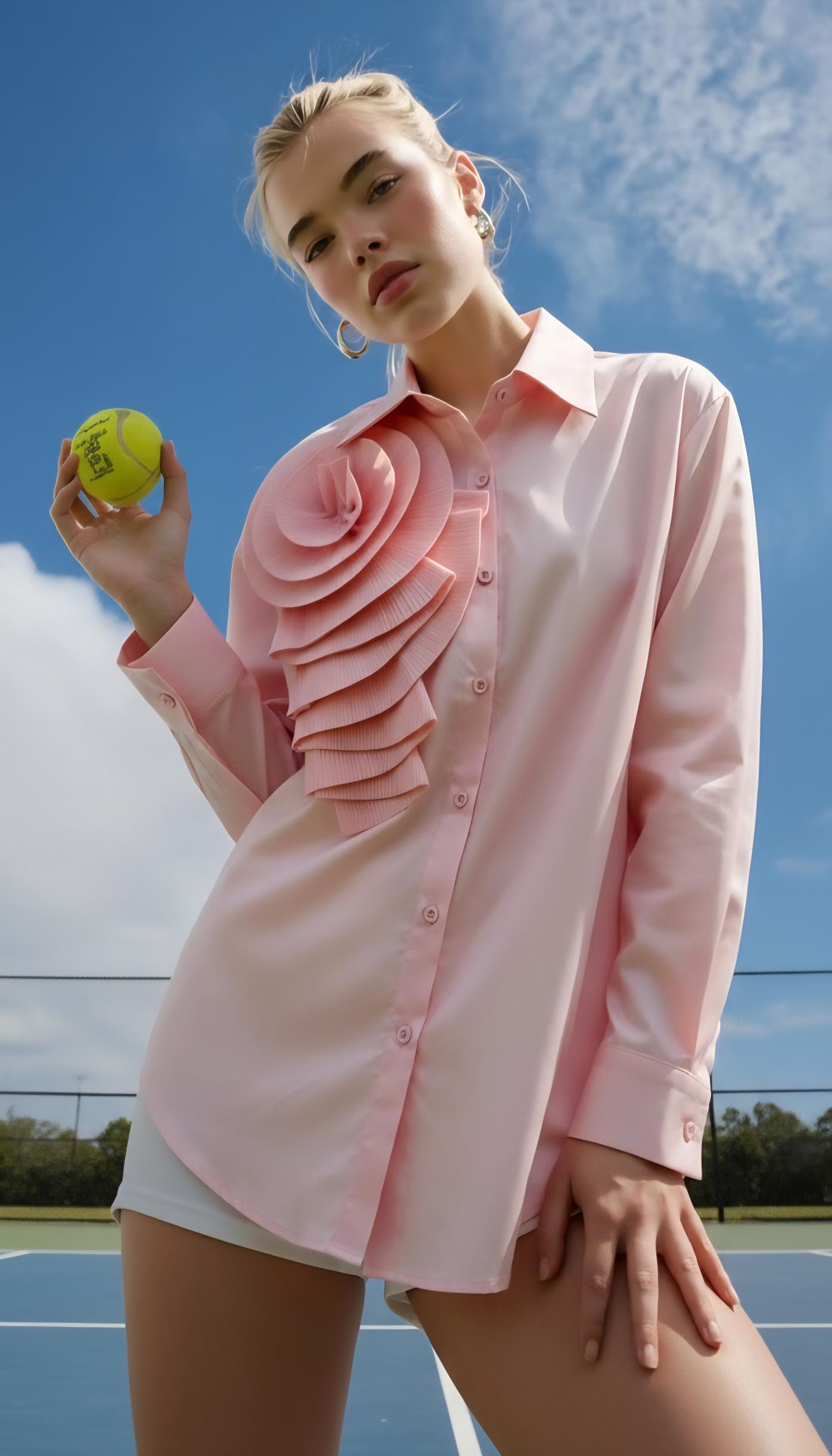 Camisa rosa de manga larga con detalle de flor plisada en lateral.