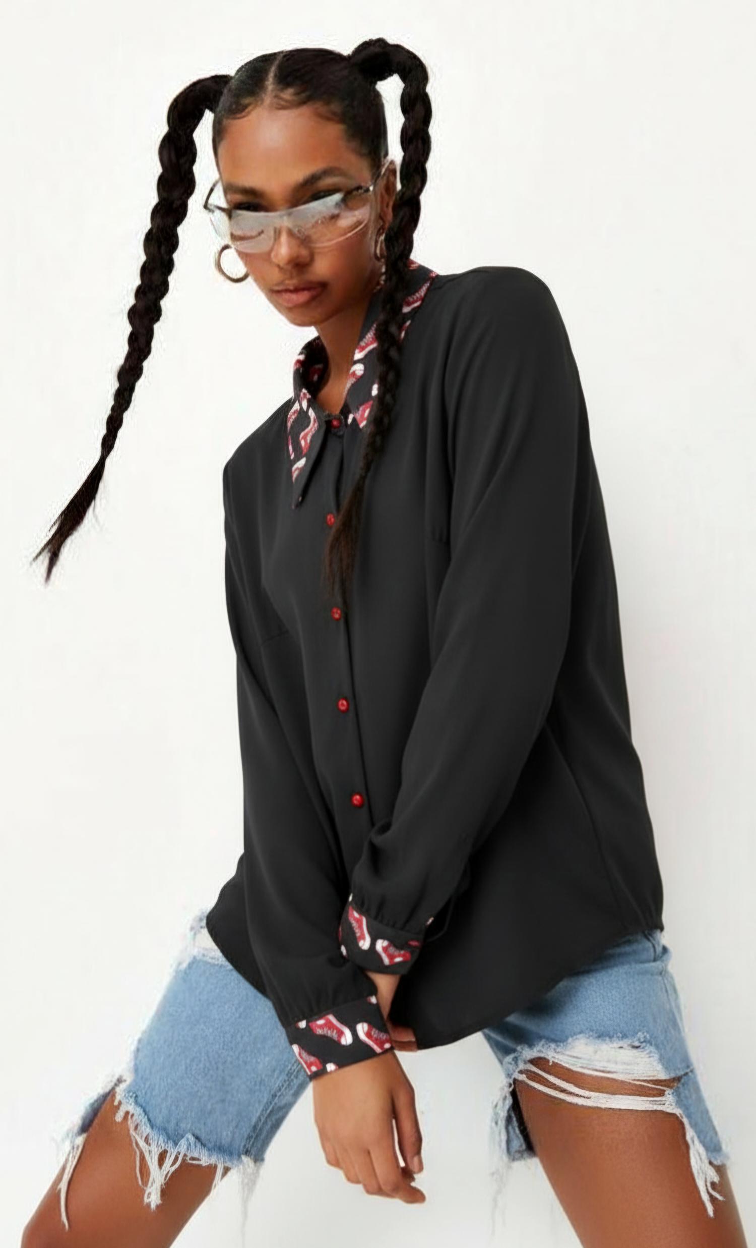 Cuello y puños con estampación de zapatillas rojas.