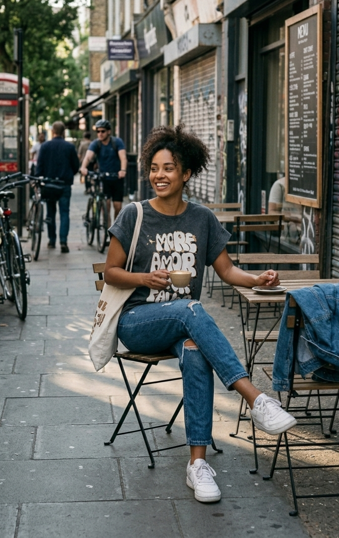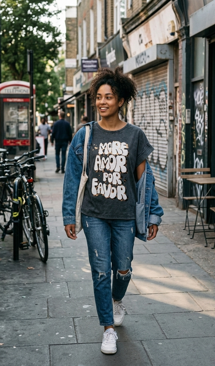 Camiseta gris con estampación mas amor por favor.