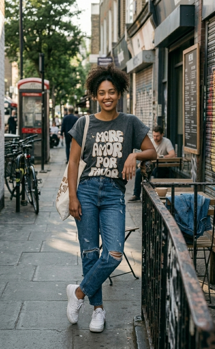 Estampación delantera de frase Mas amor por favor.