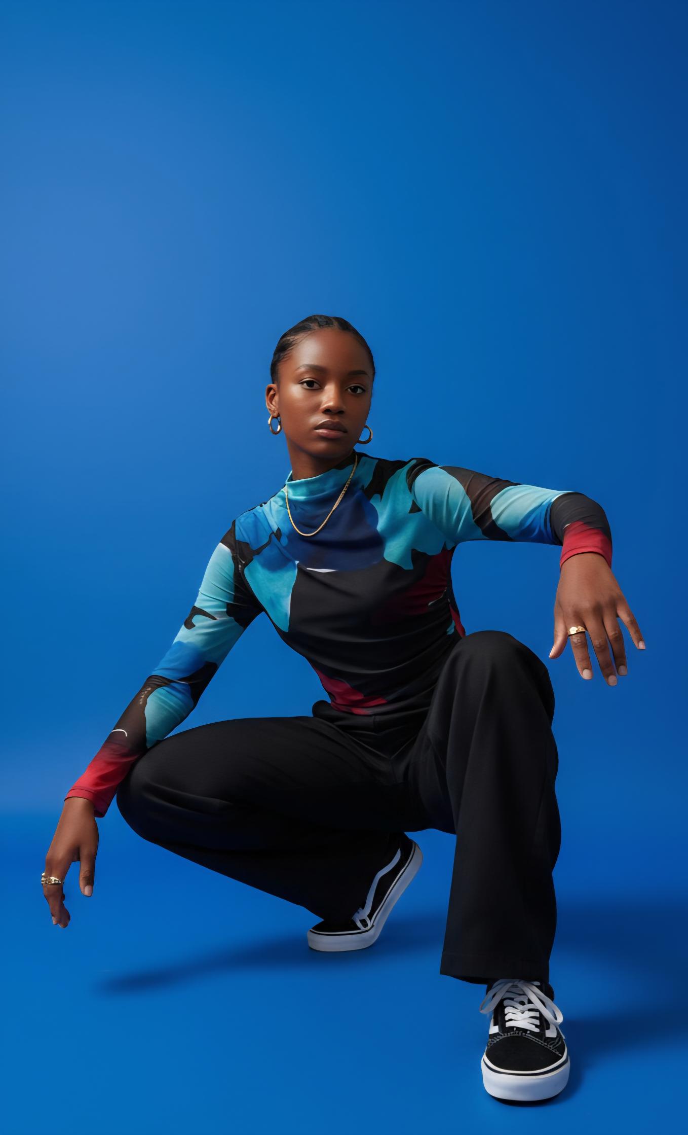 Camiseta microtul estampado multicolor sobre fondo marrón chocolate.