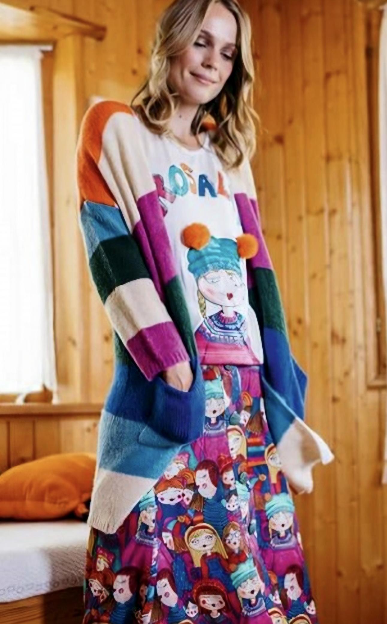 Detalle delantero de letras serigrafiadas con purpurina y aplicación de niña con pompones.