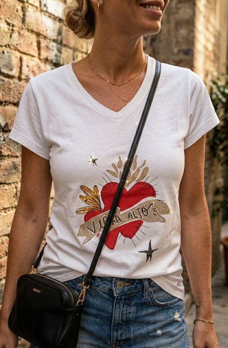 Camiseta de algodón blanca con estampación delantera.