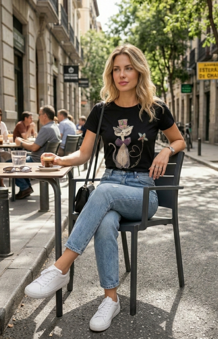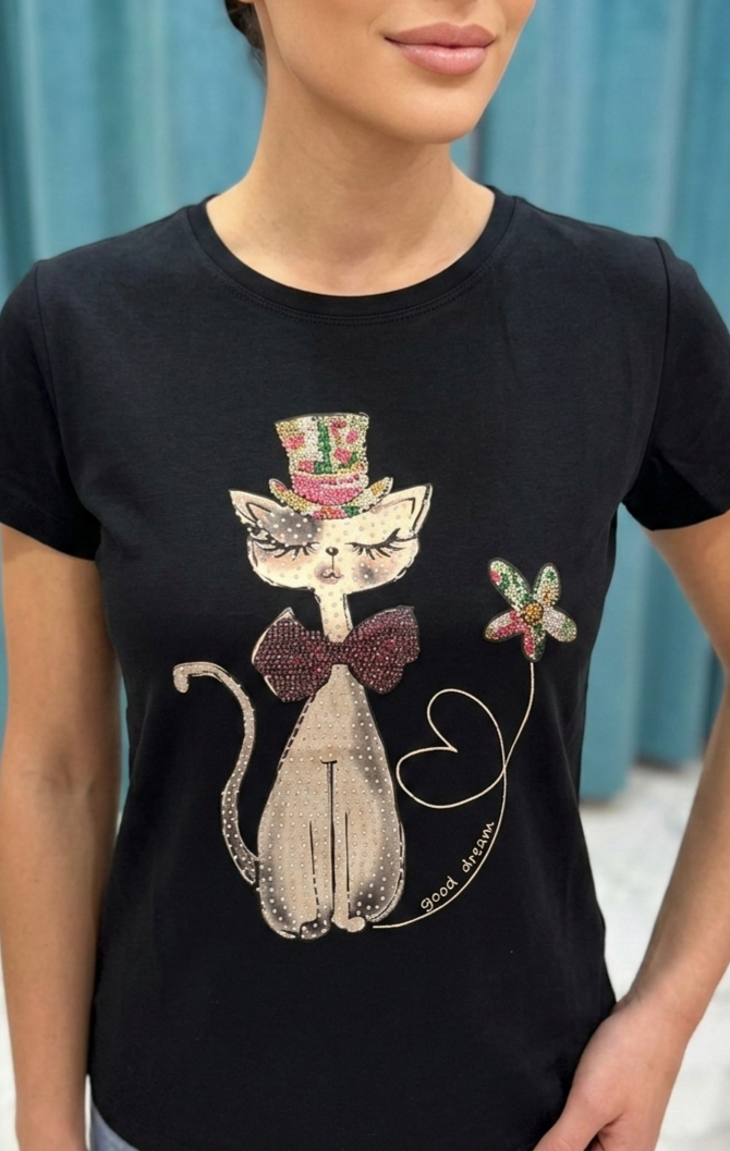Camiseta de algodón negra con gatita strass.