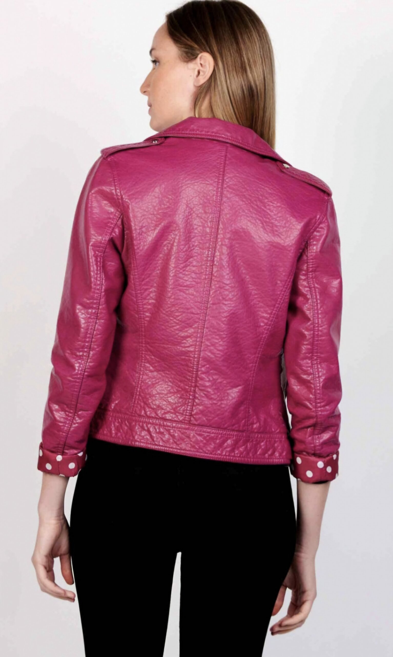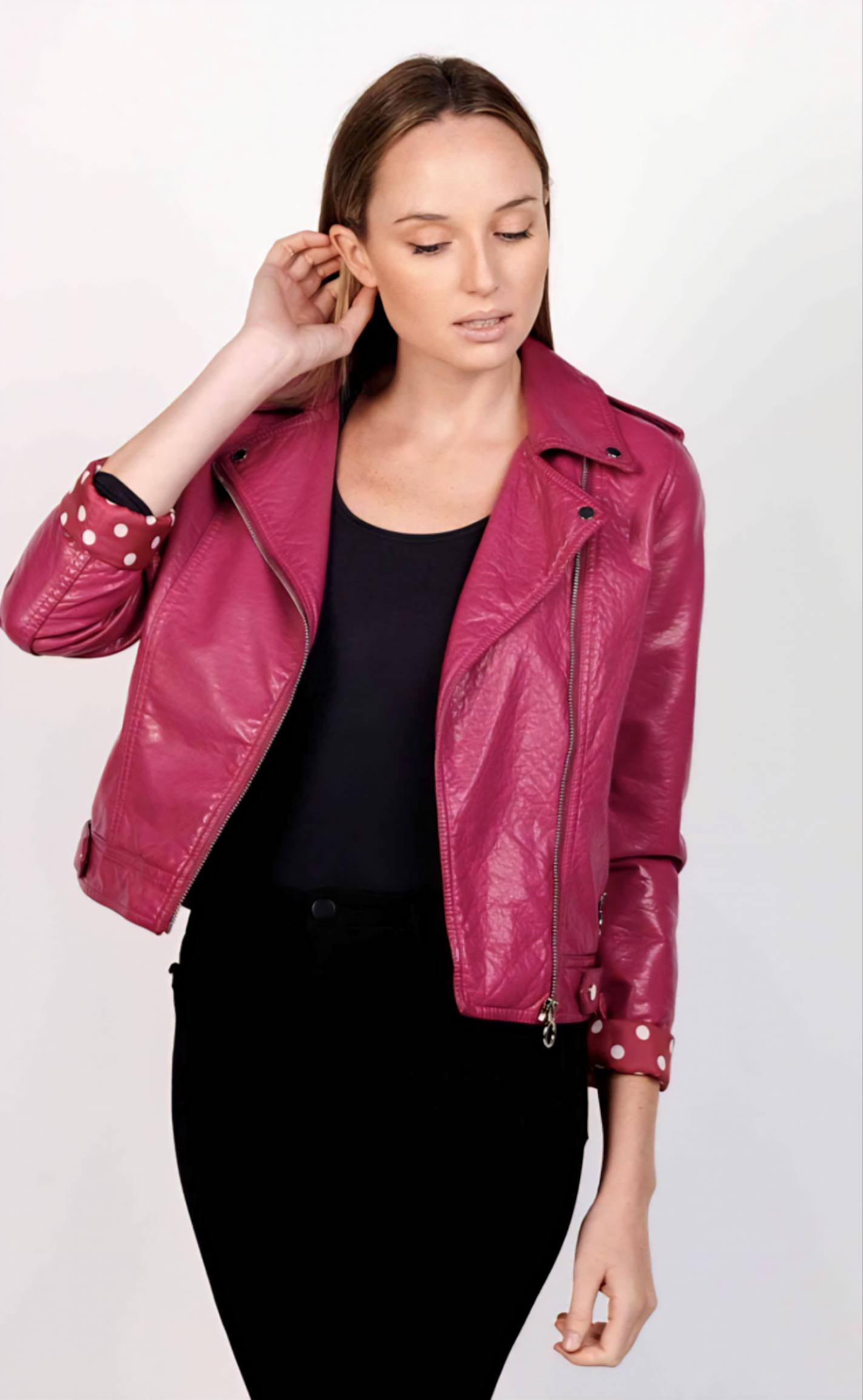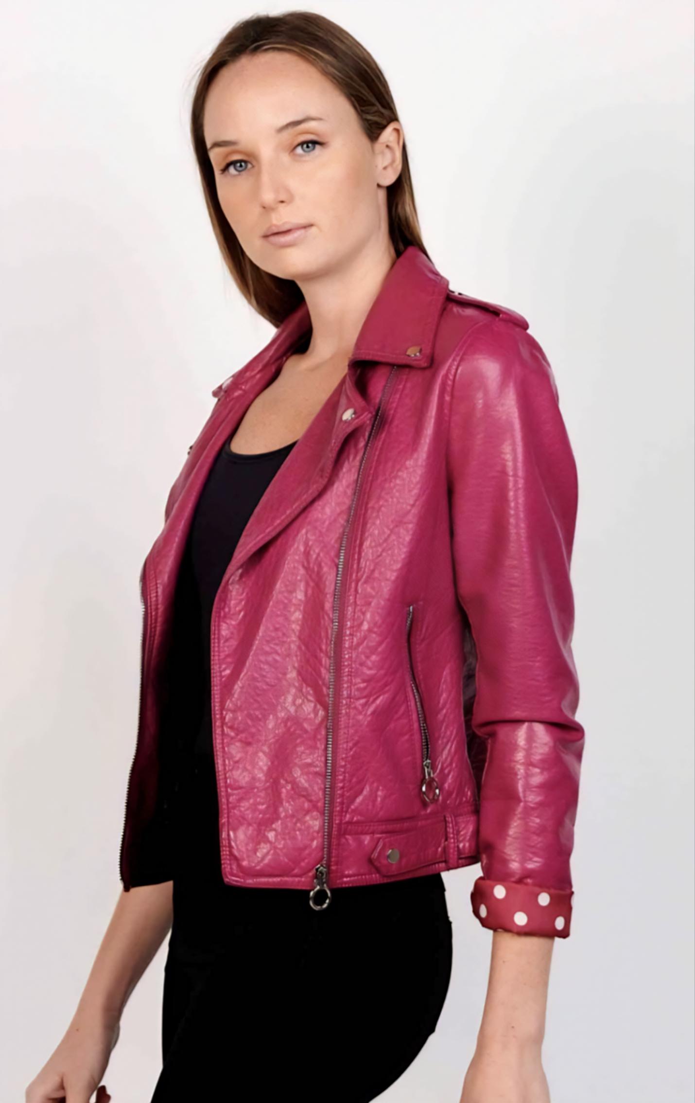 Cazadora de polipiel en tono fucsia.