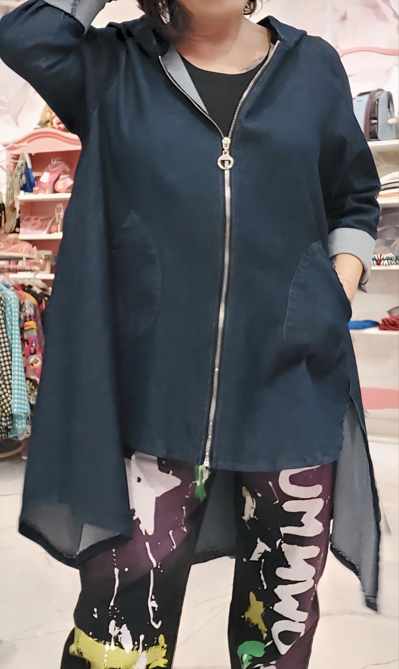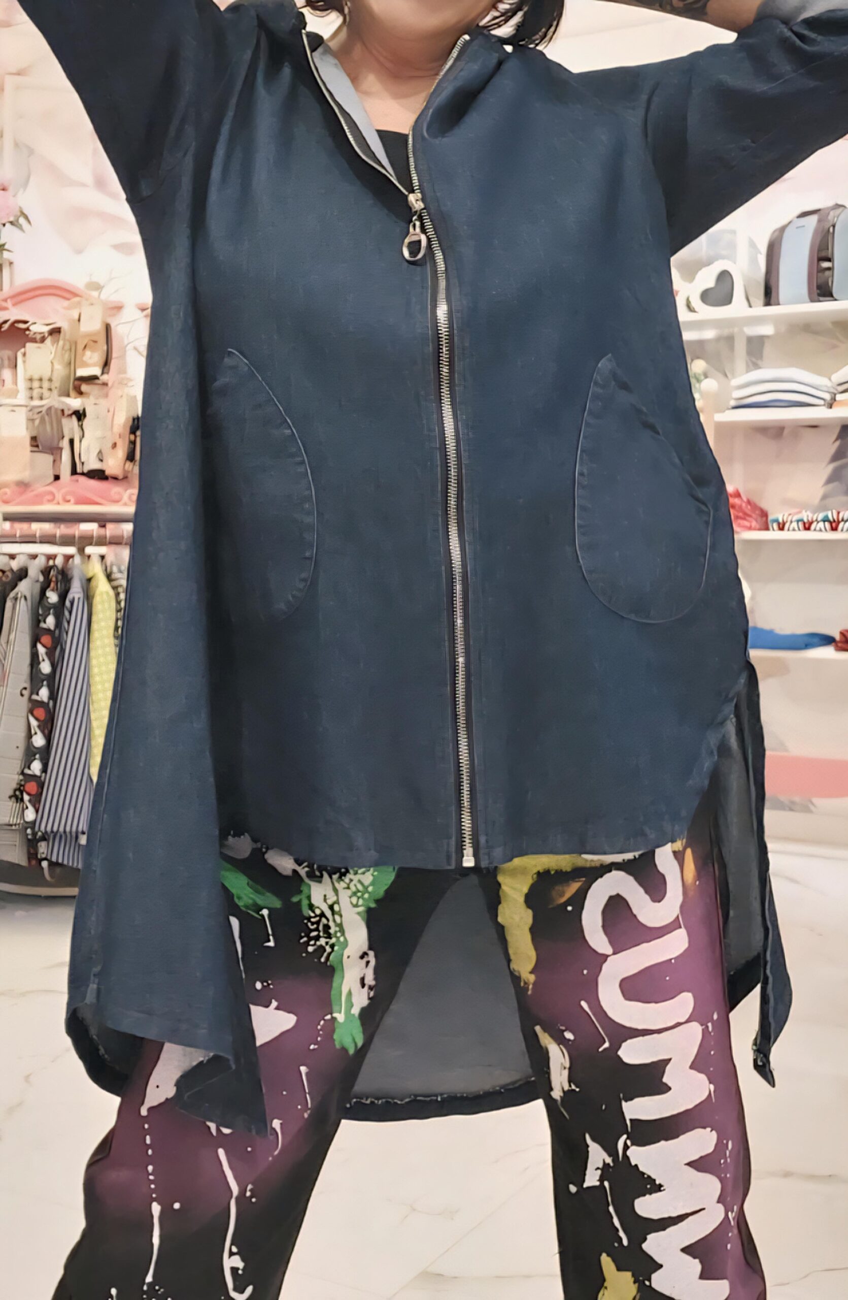 Chaqueta larga, desigual en el bajo, capucha y manga larga.