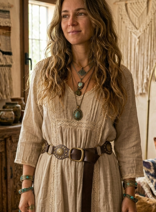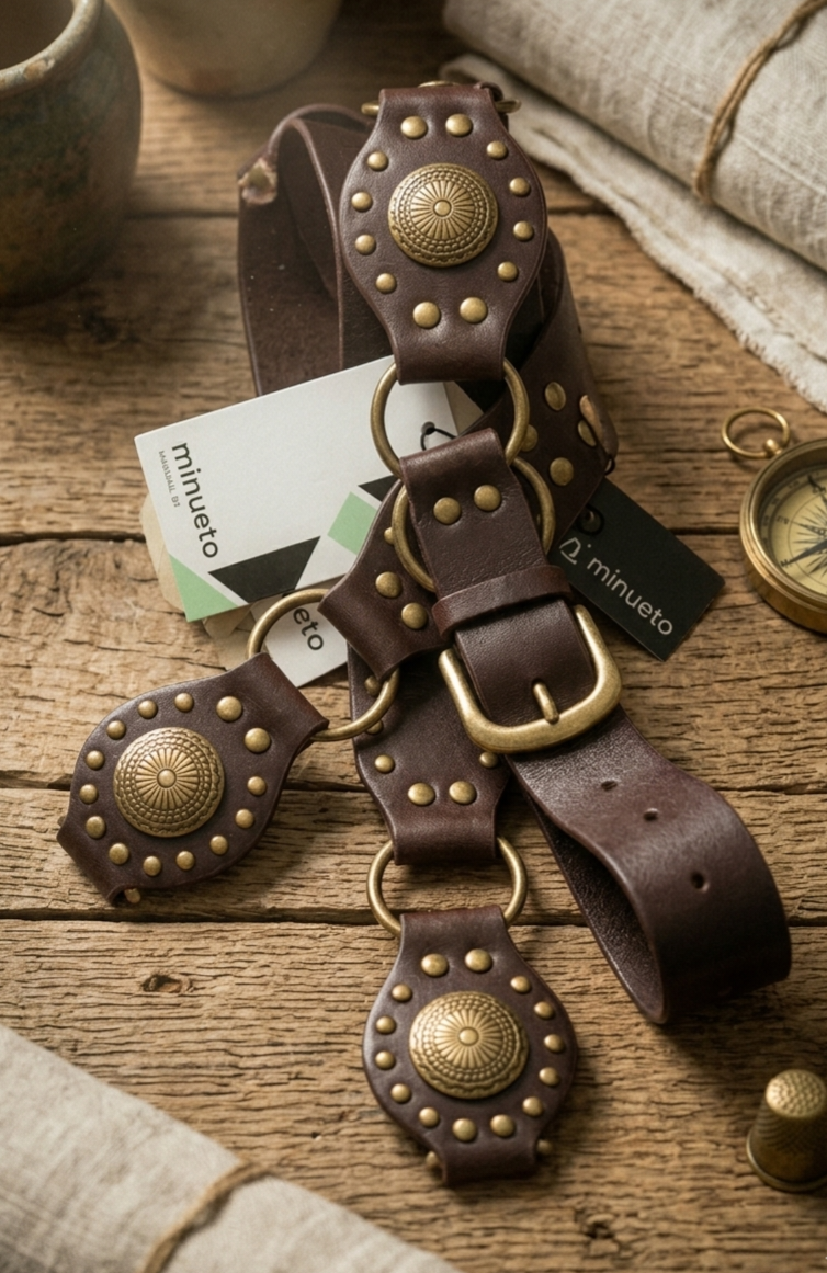 Cinturón marrón de piezas y aros oro viejo.