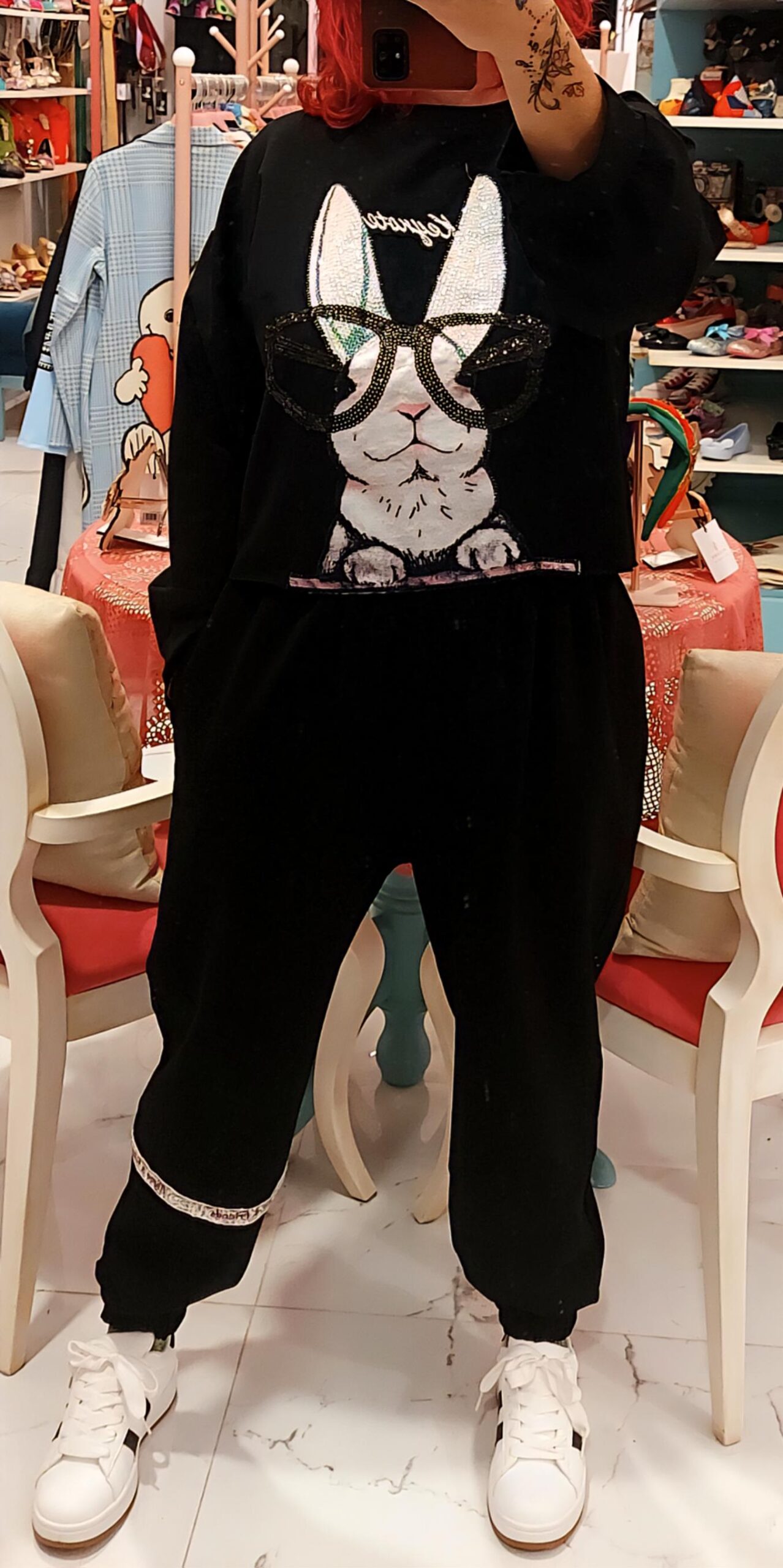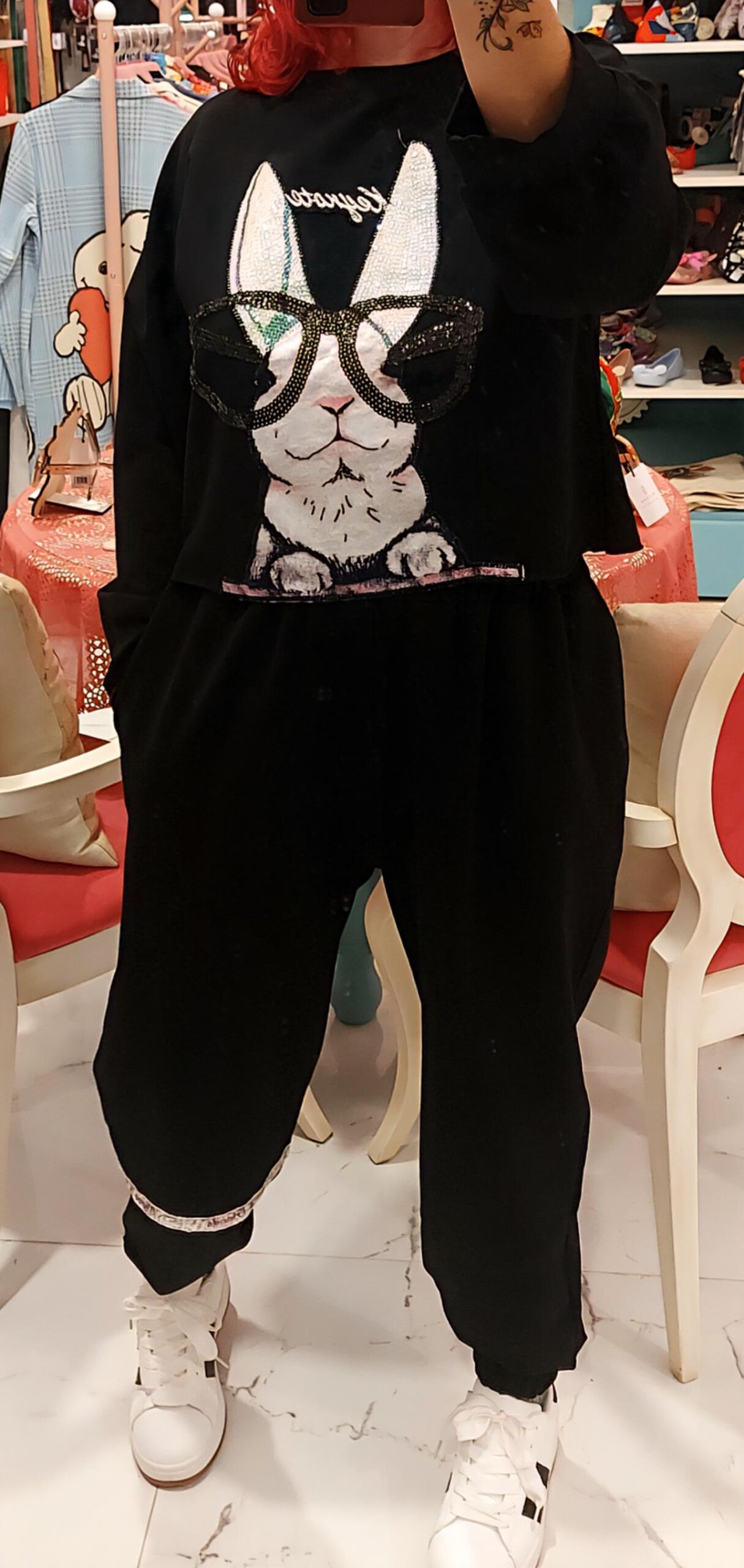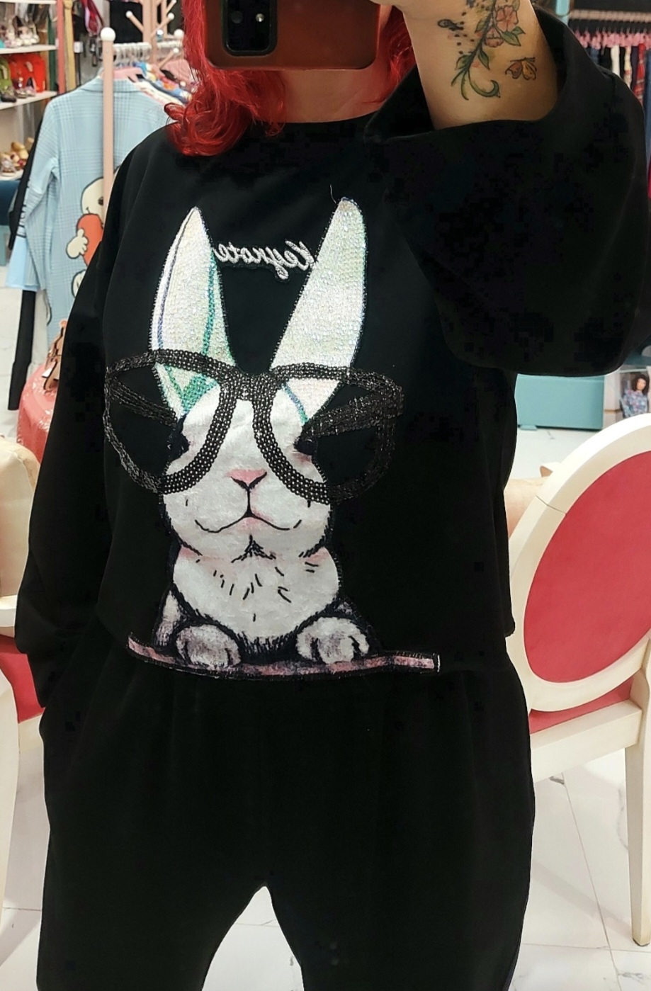 Sudadera de cuello redondo y manga larga con detalle de parche conejo con strass y lentejuelas en delantera.