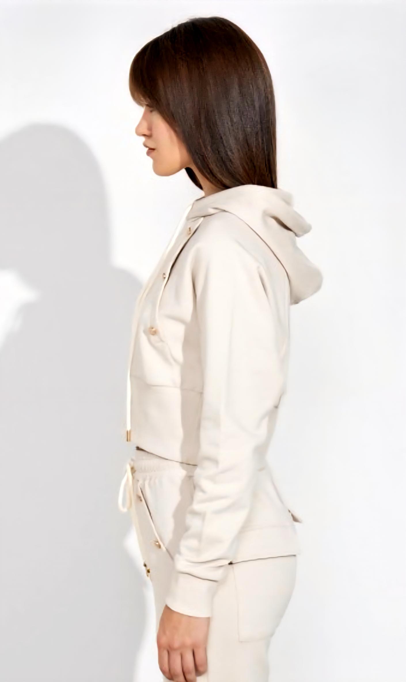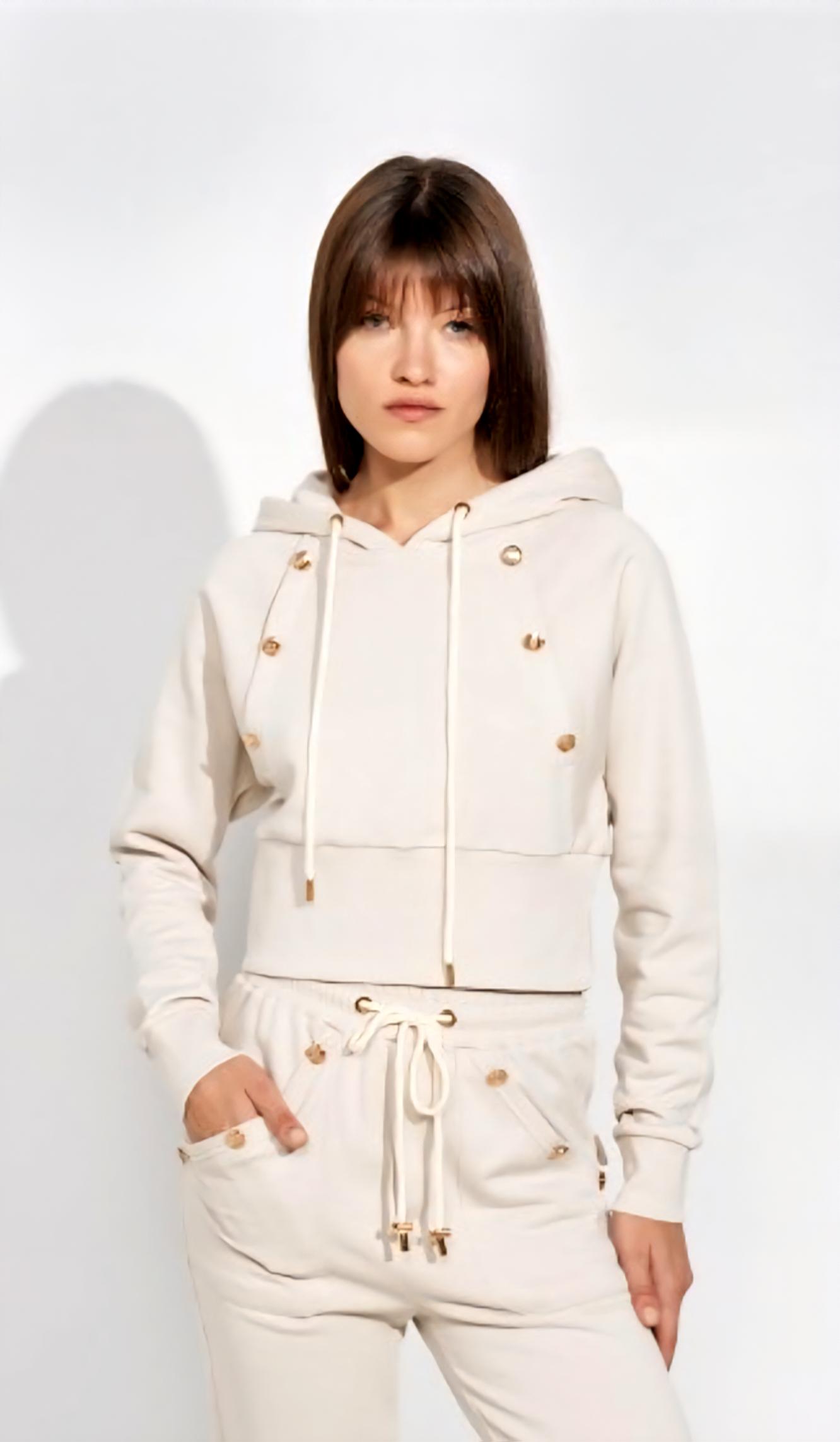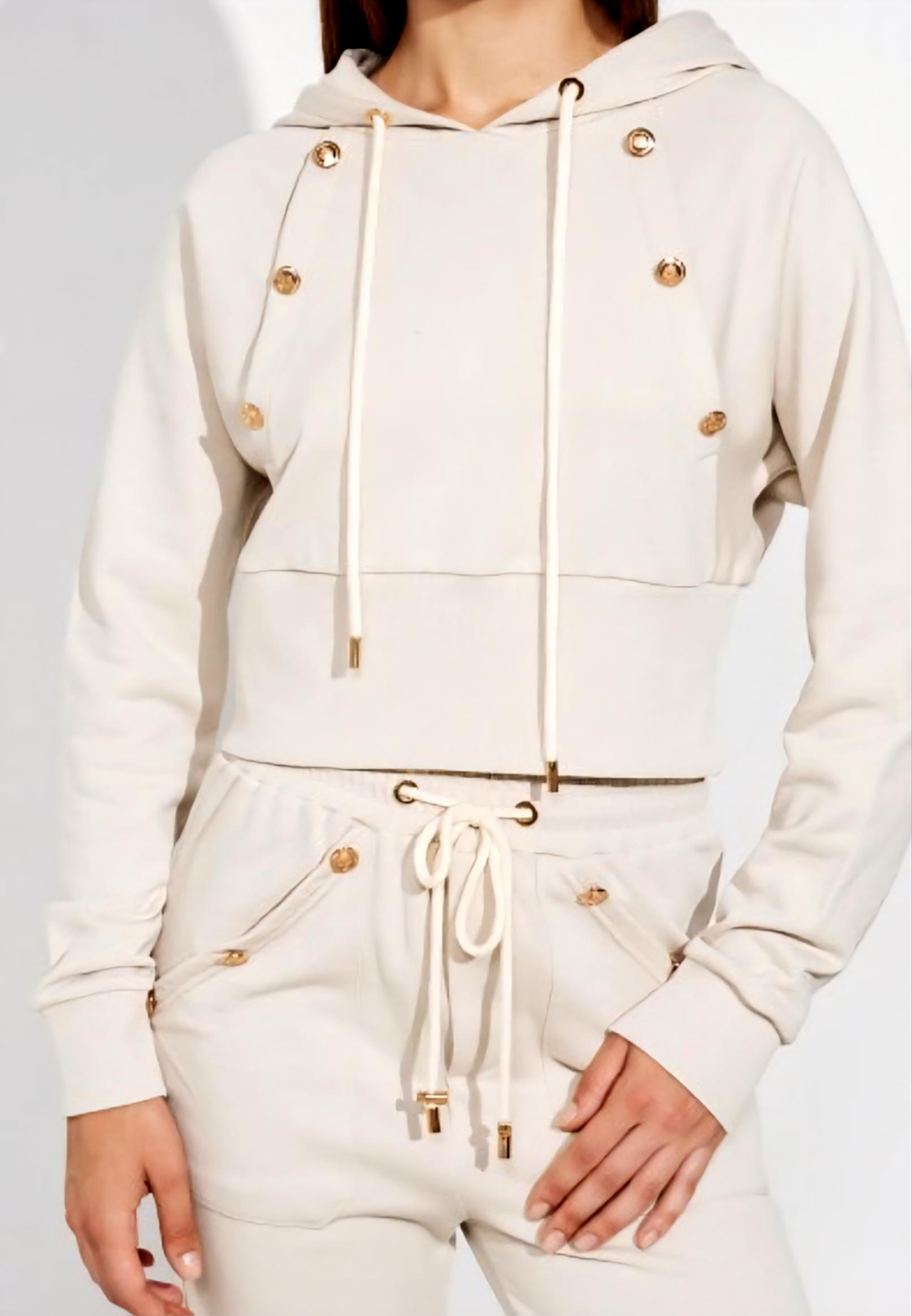 Sudadera corta con capucha y botones dorados decorativos.