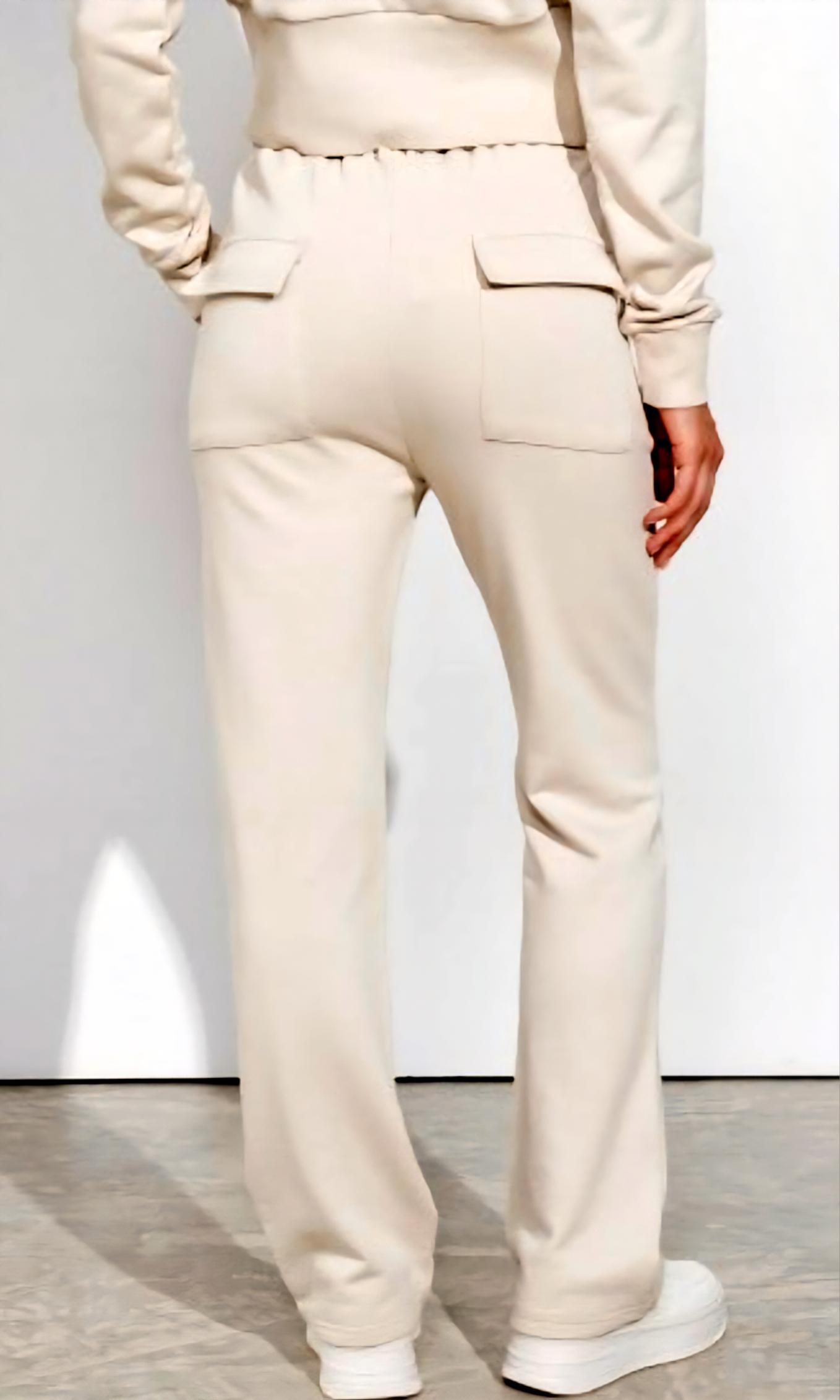 Conjunto beige compuesto por pantalón largo y sudadera corta.