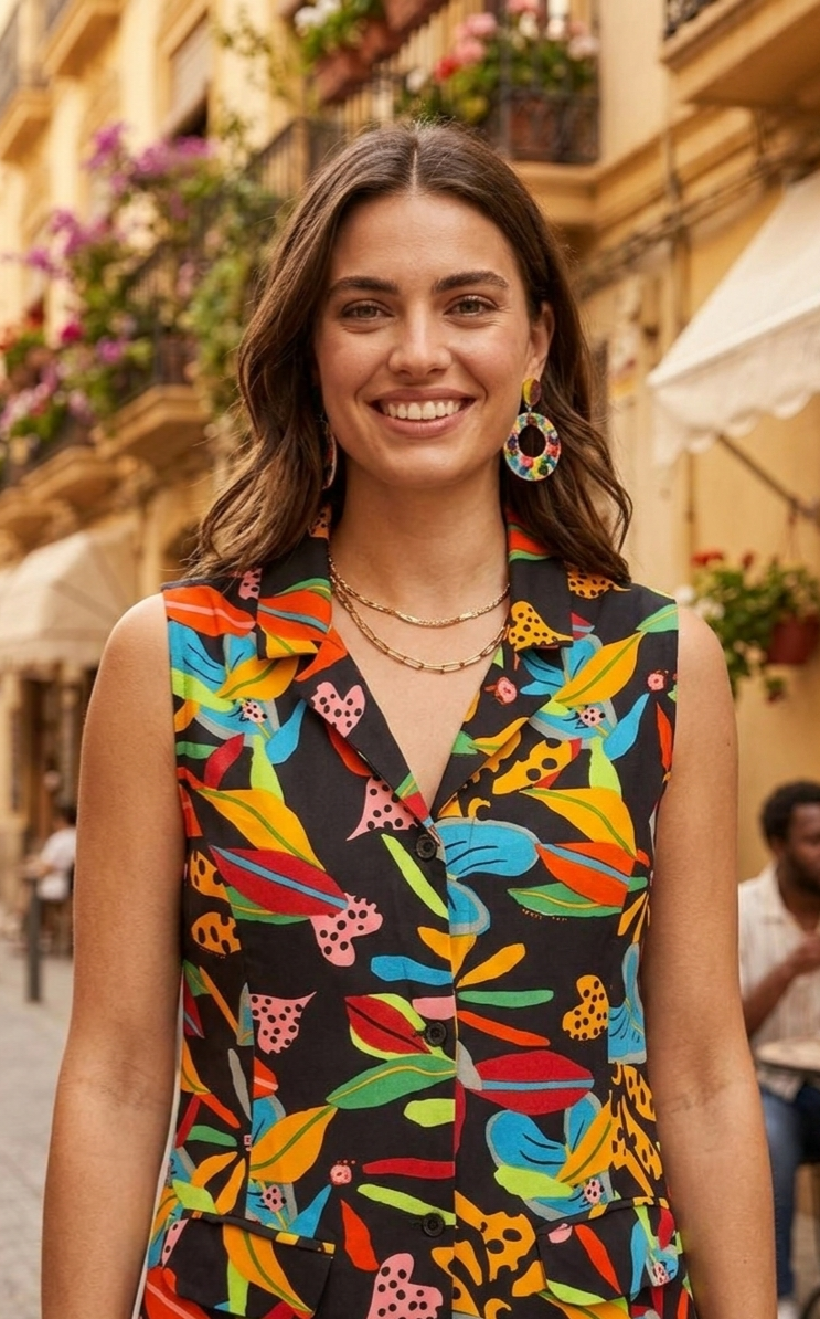 Chaleco cuello solapas, abotonado y bolsillos delanteros con solapas decorativas.