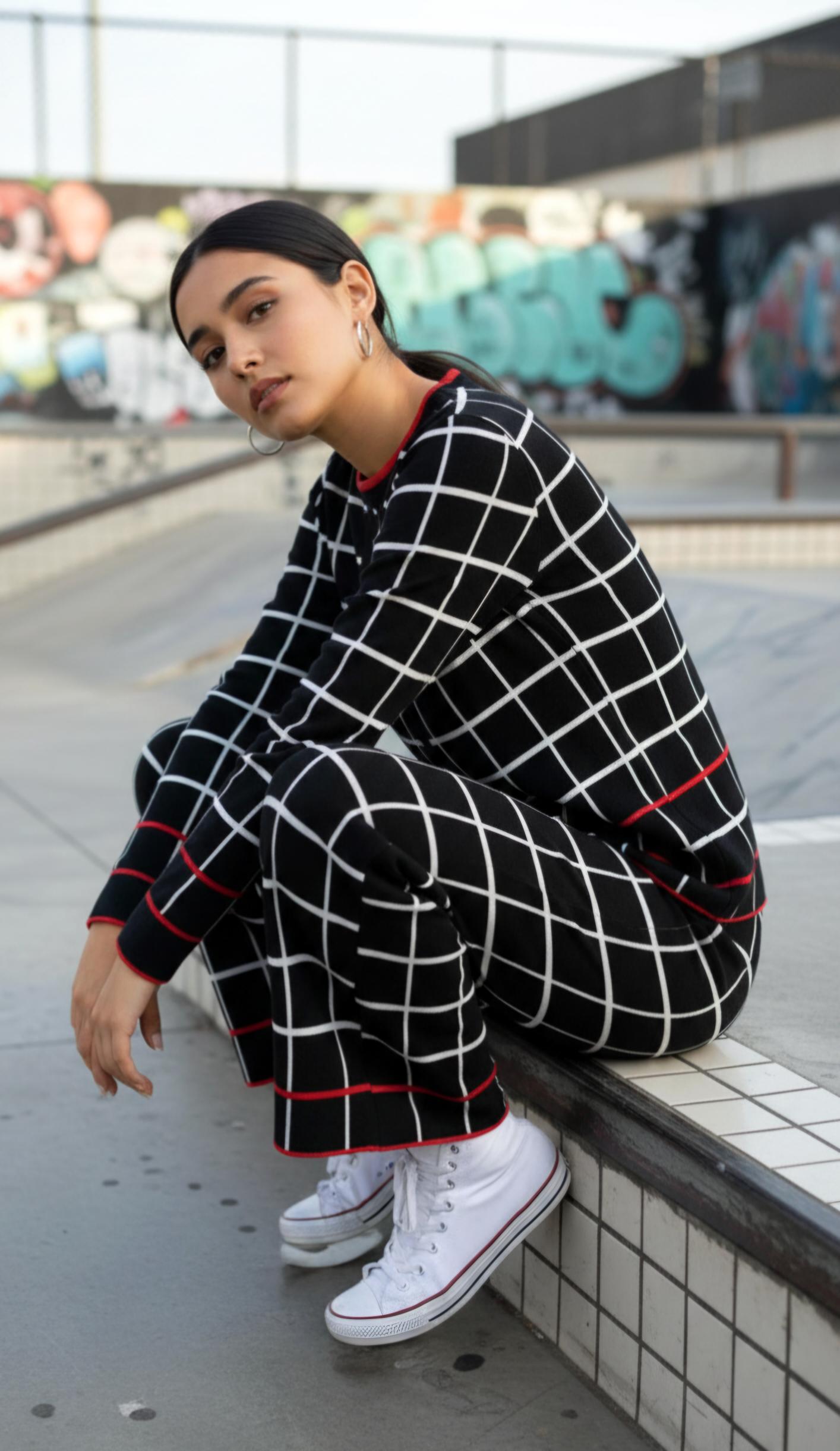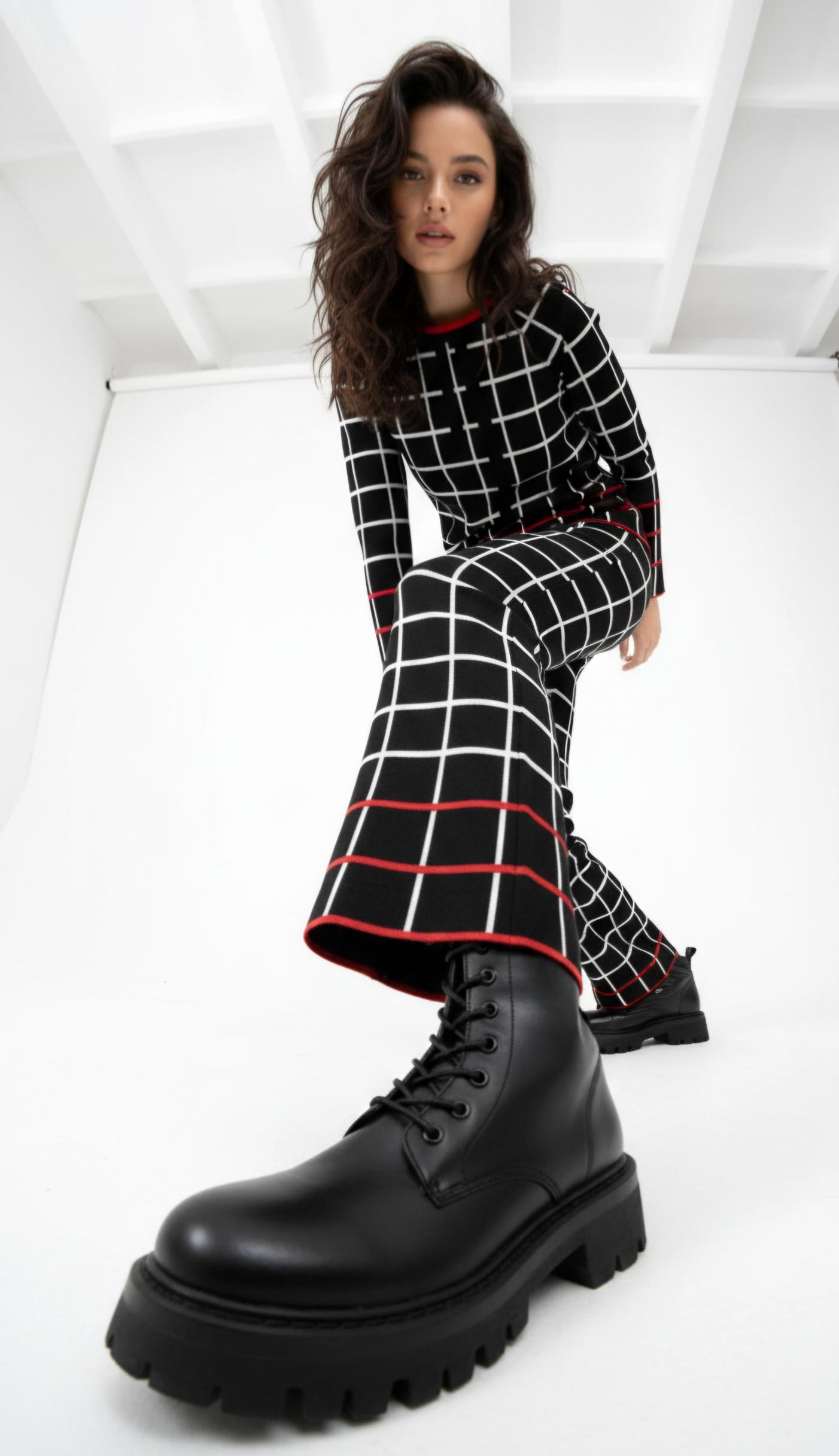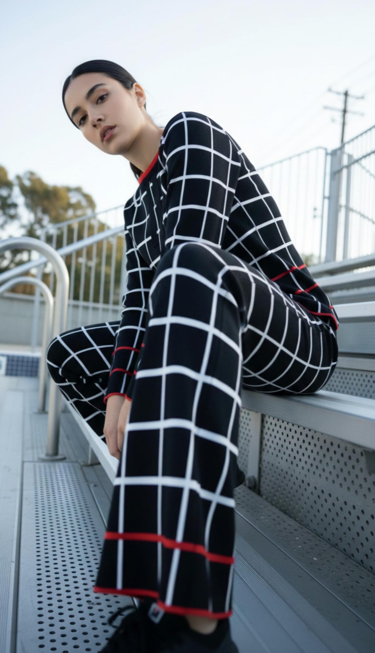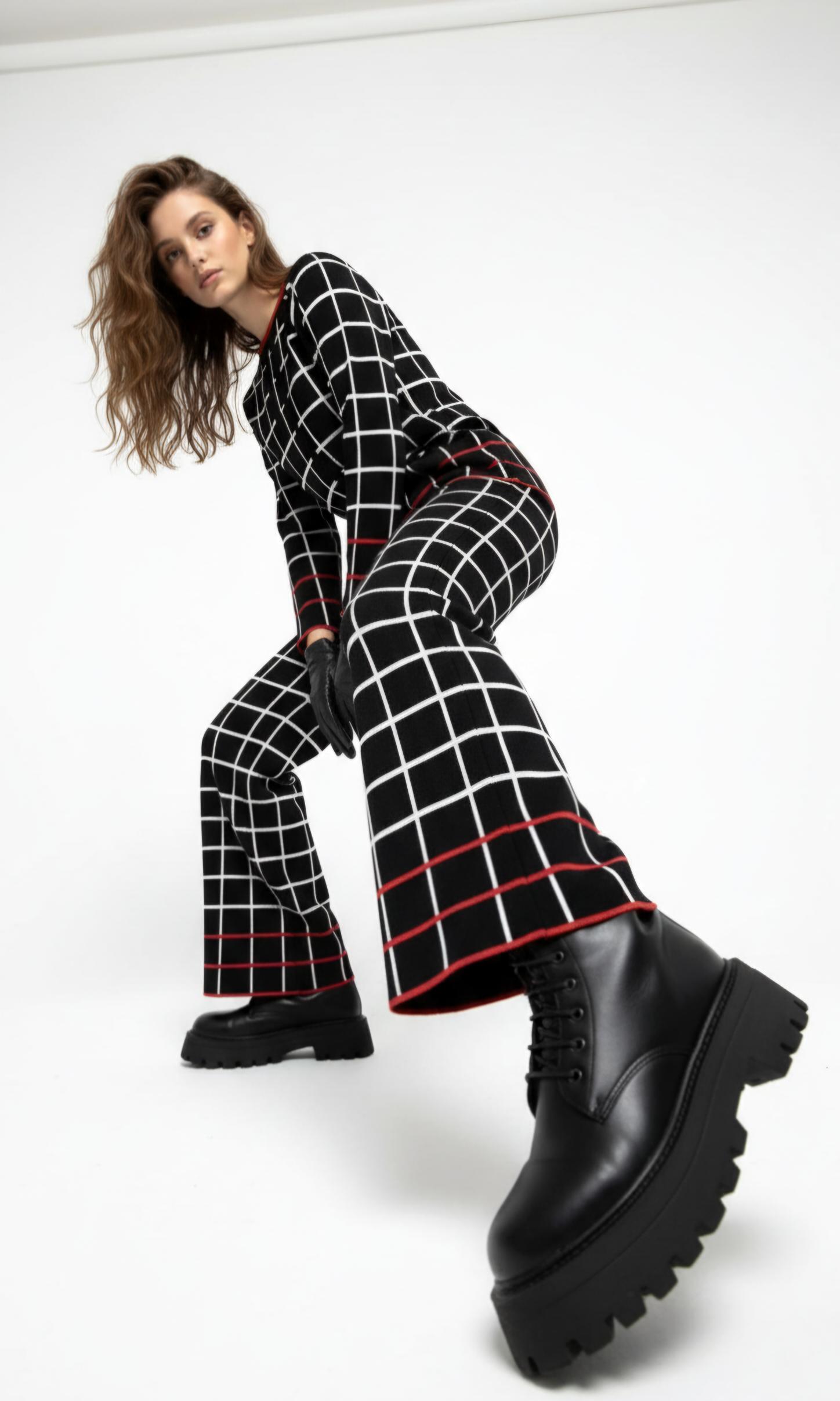 Conjunto de punto compuesto por jersey y pantalón largo.