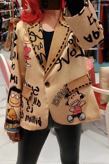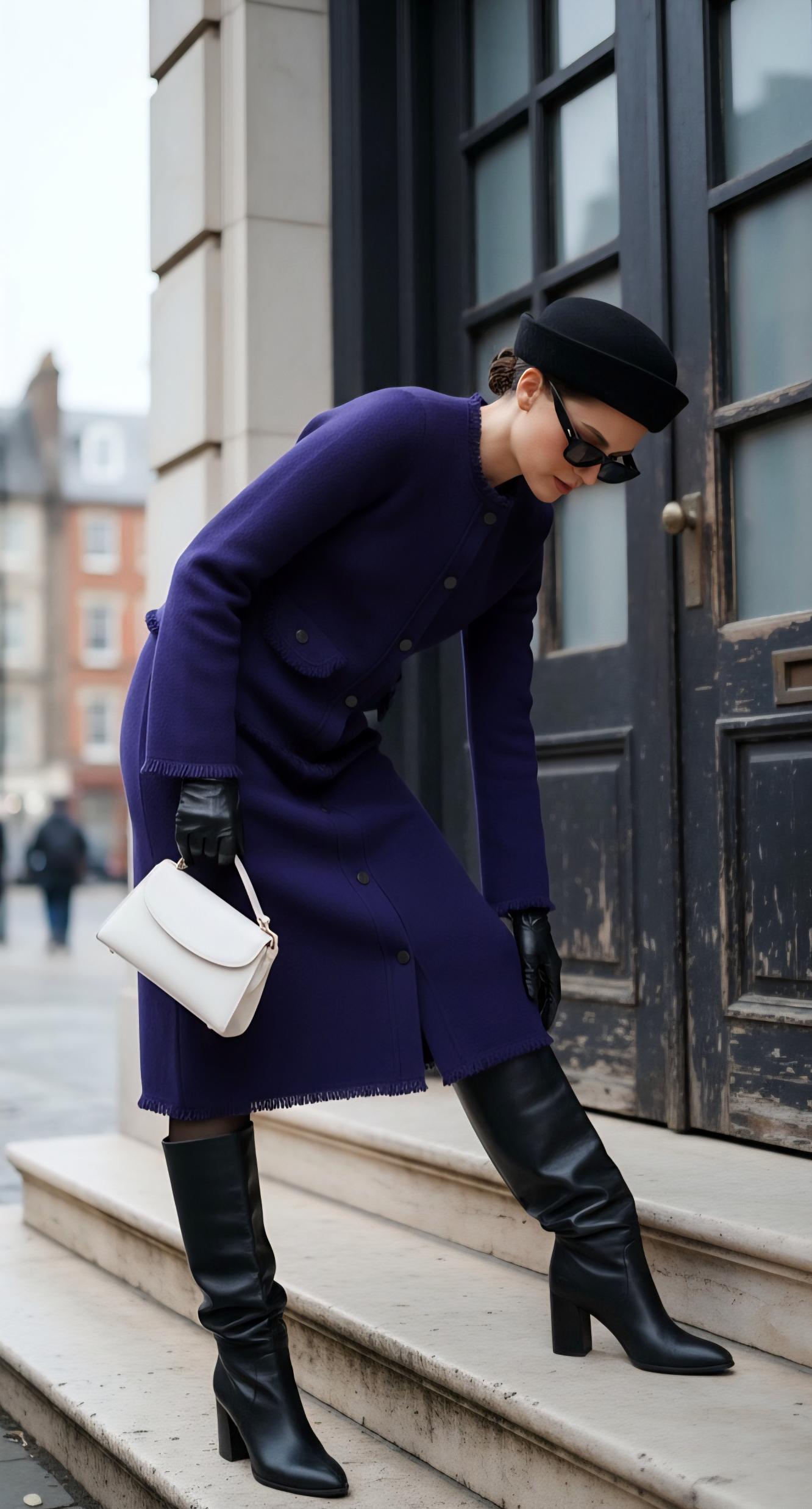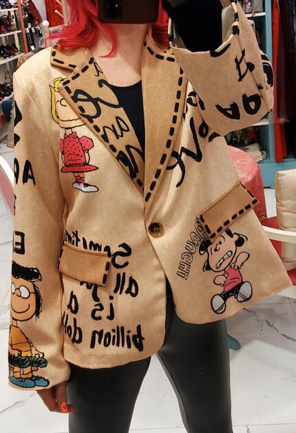 Conjunto de punto compuesto por falda recta y chaqueta con detalles de botones y flecos.
