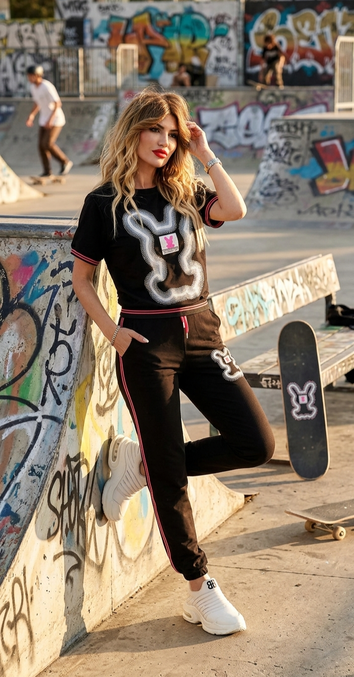 Conjunto Bella Belluci color negro con strass y color fluor.