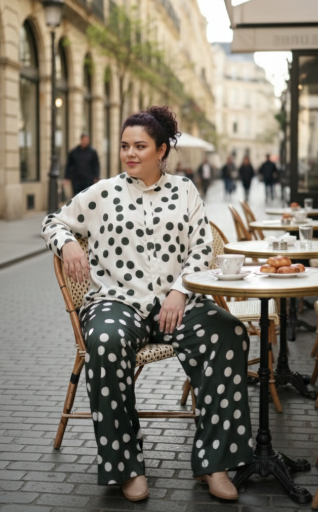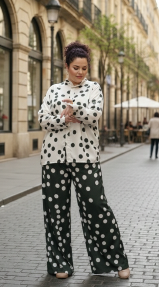 Estampación lunares en verde oliva y beige.