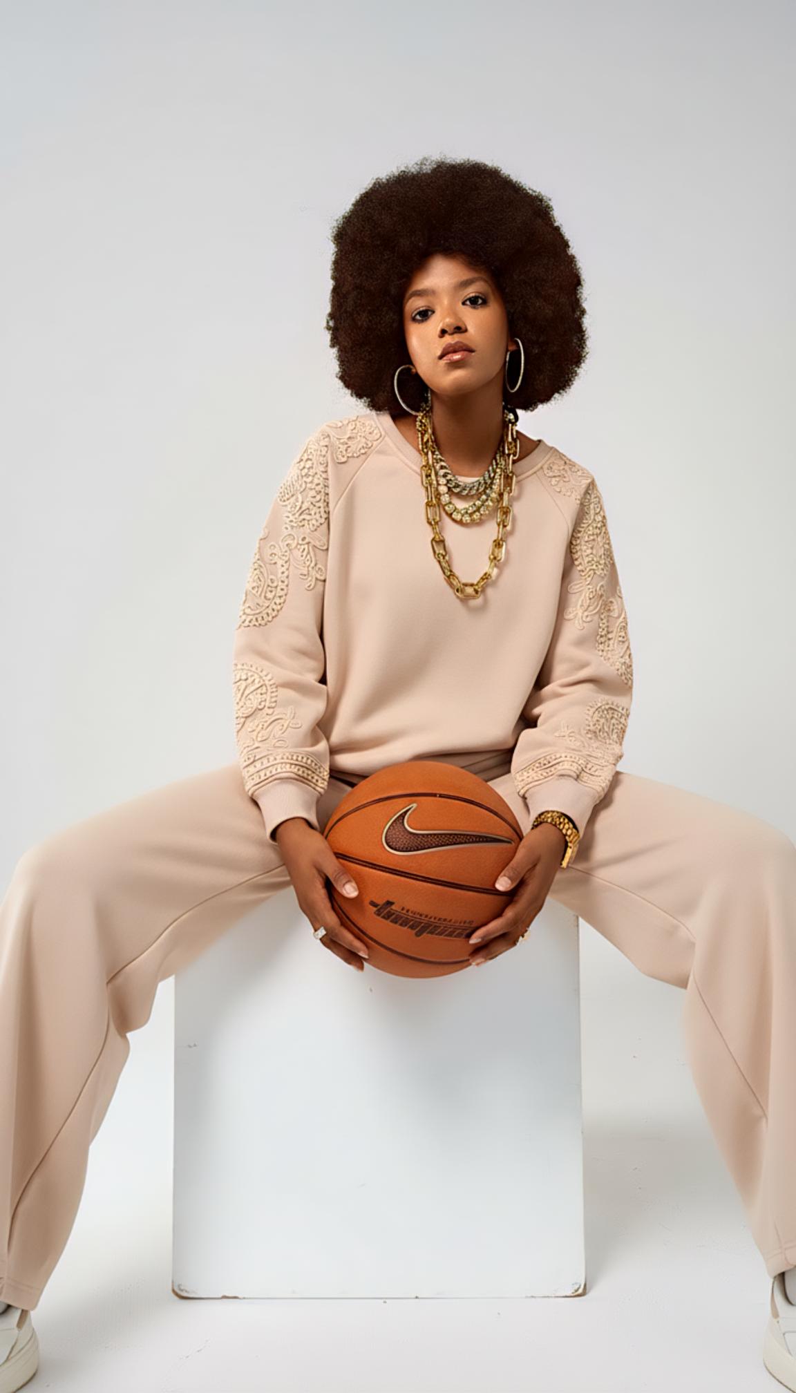 Sudadera y pantalón bordados a cordonería color beige.