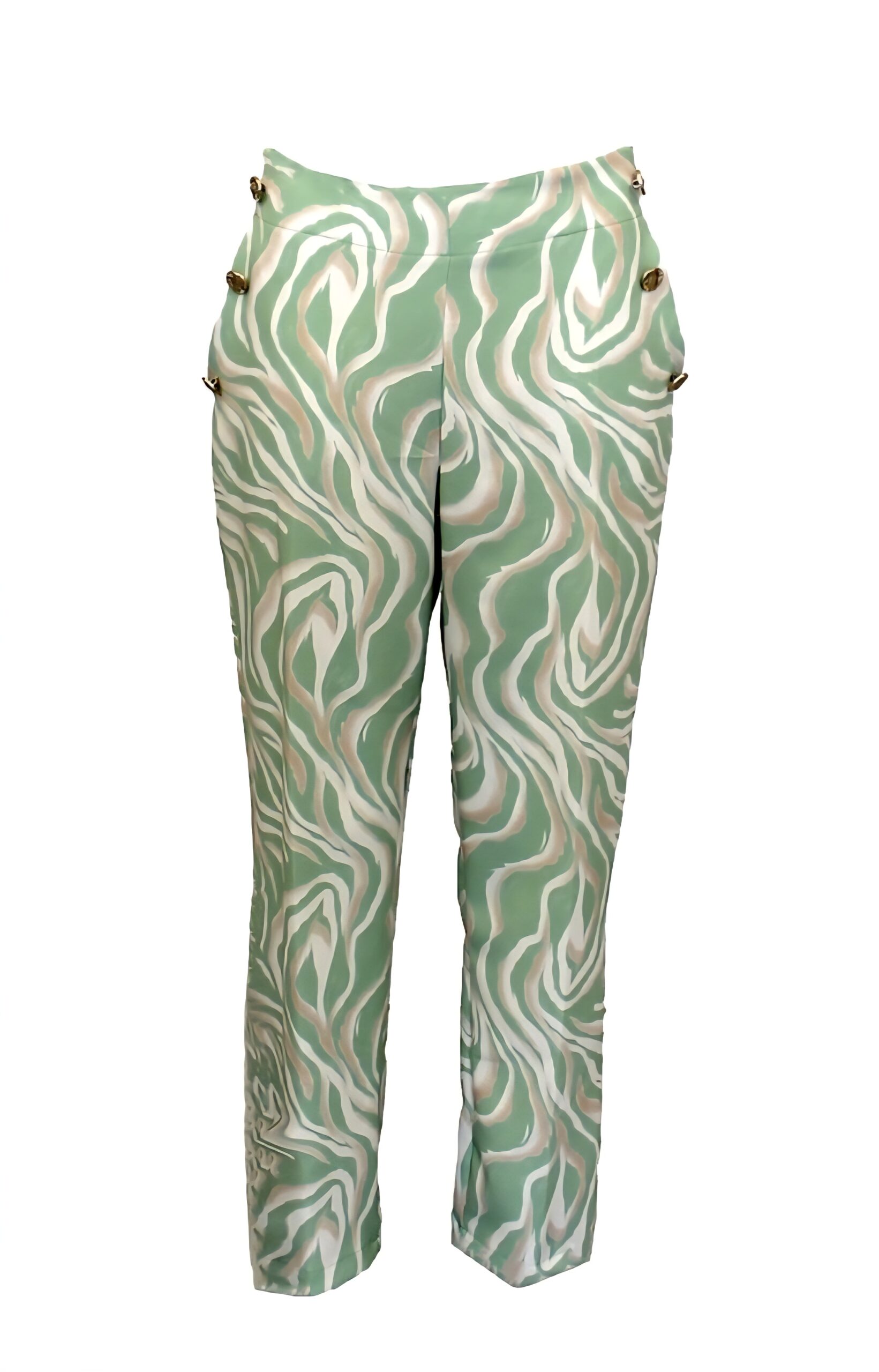 Pantalón traje largo con bolsillos laterales, cintura engomada trasera y botones dorados decorativos.