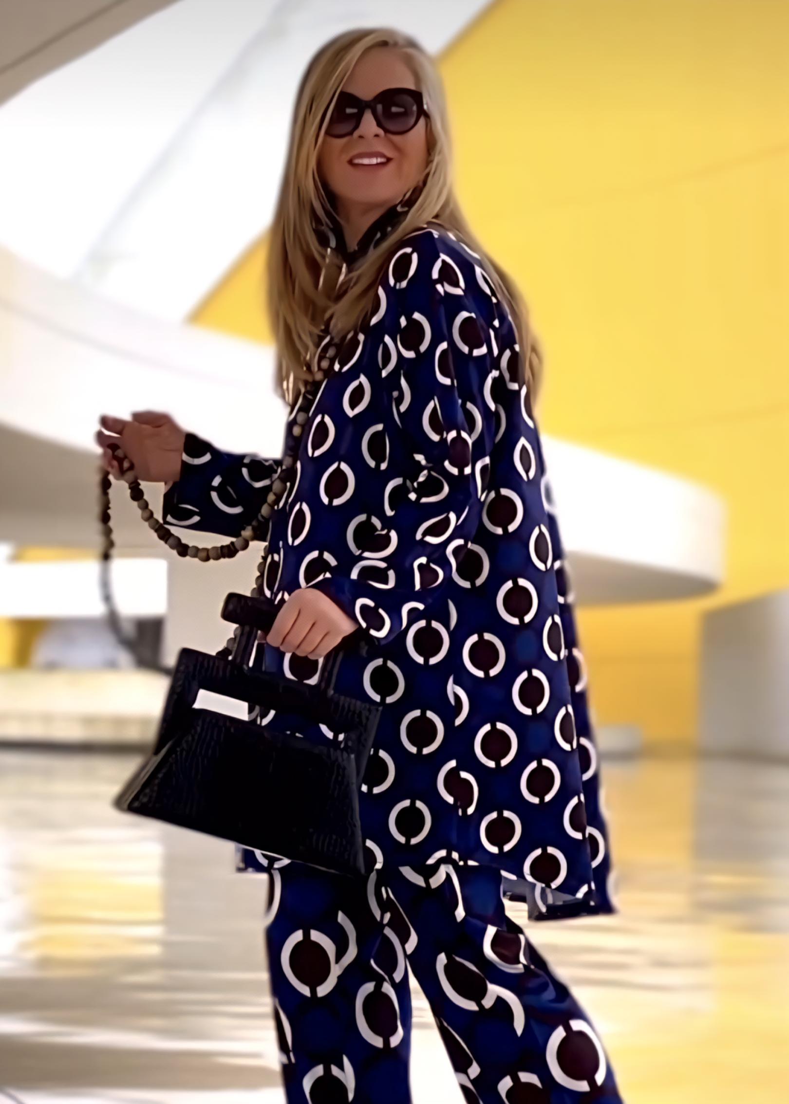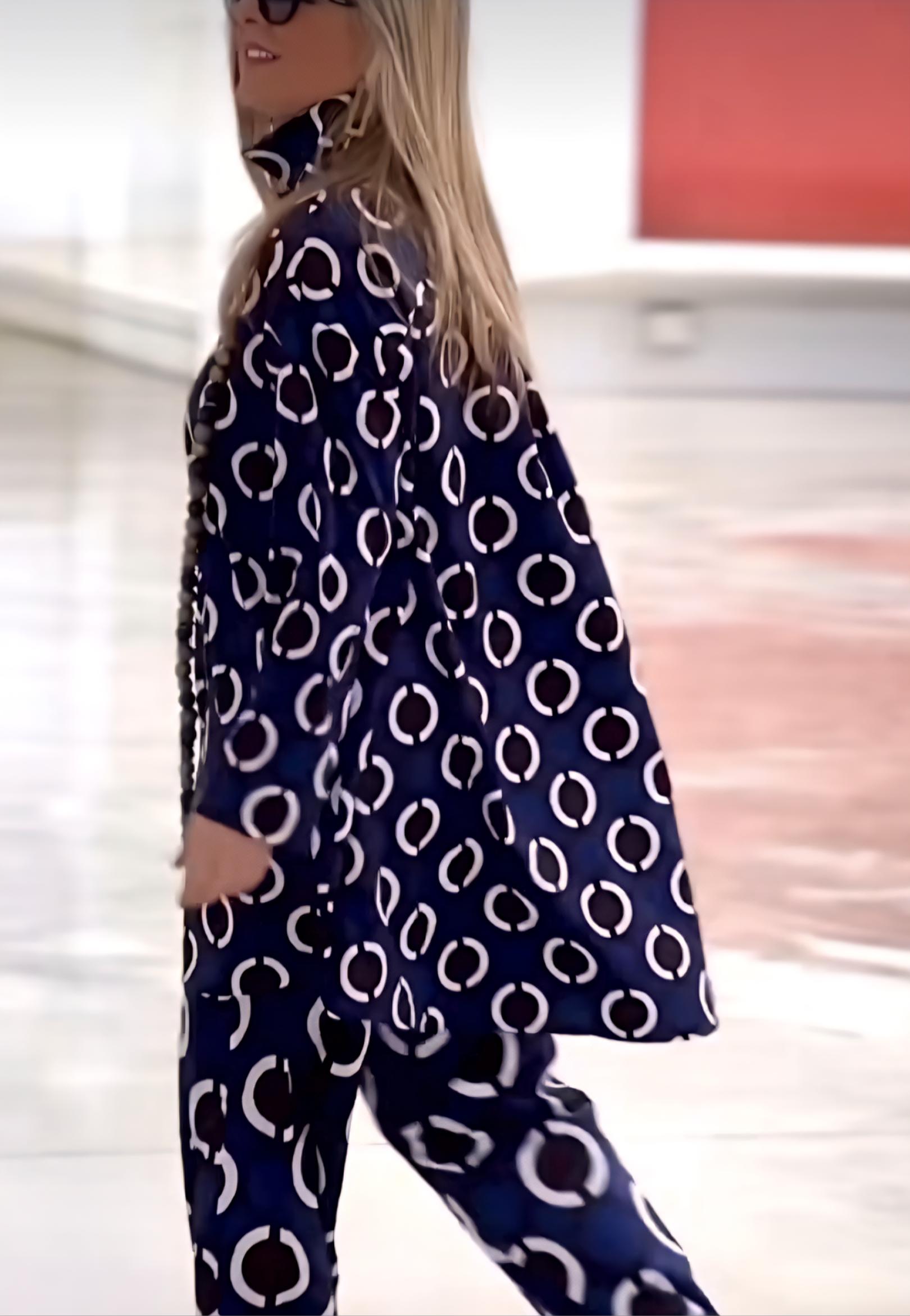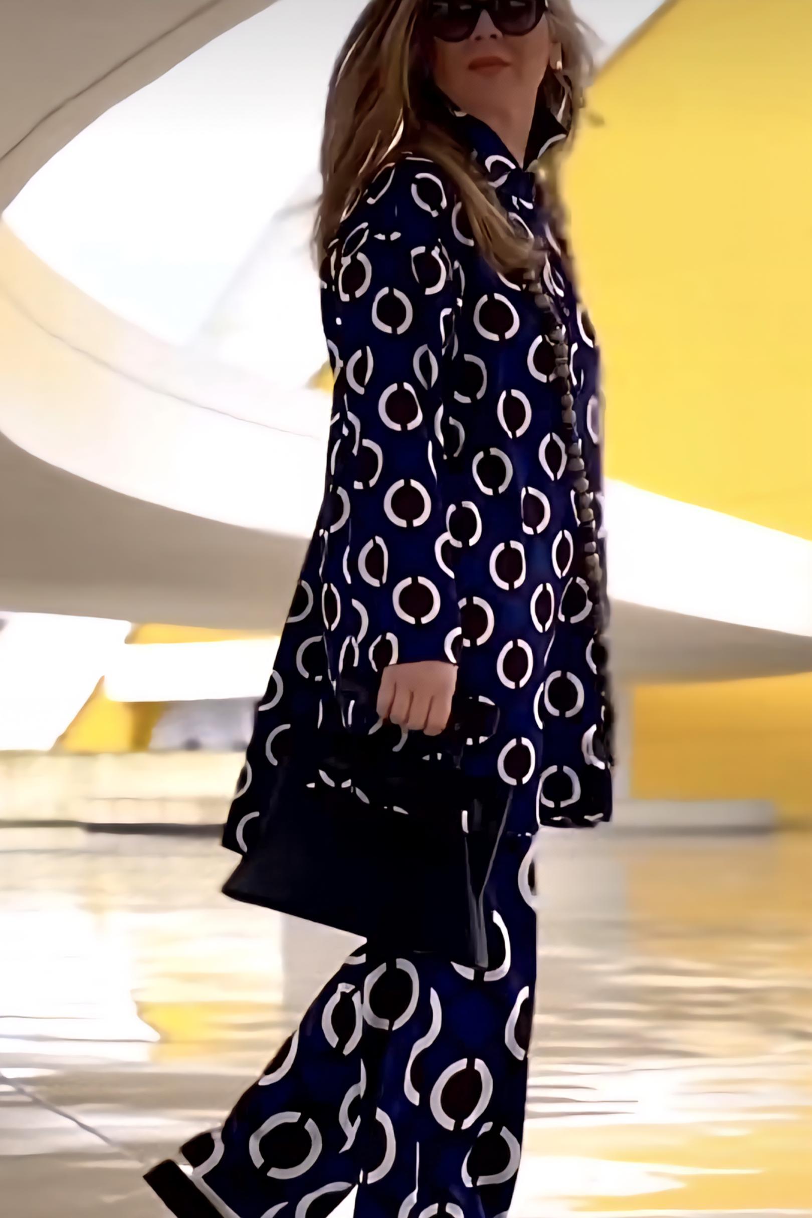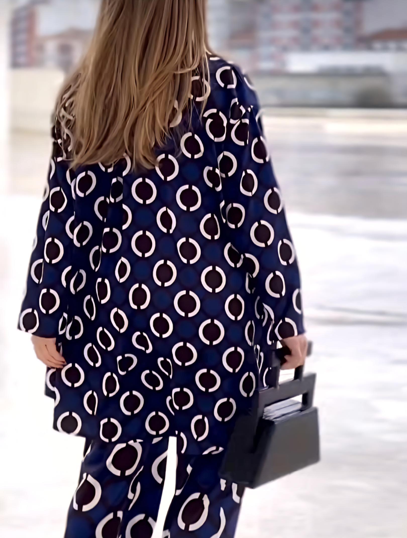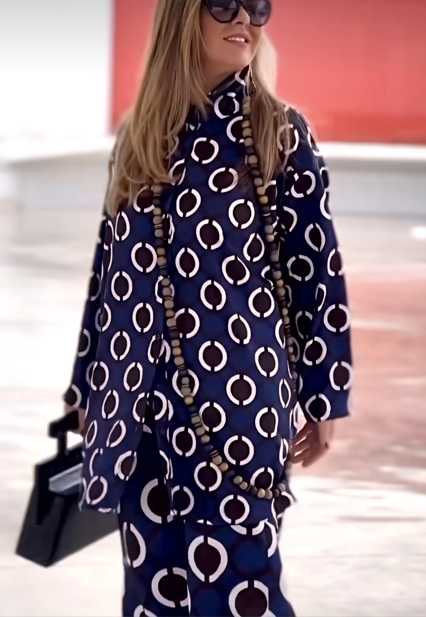 Conjunto en tejido satinado compuesto por pantalón y camisa.